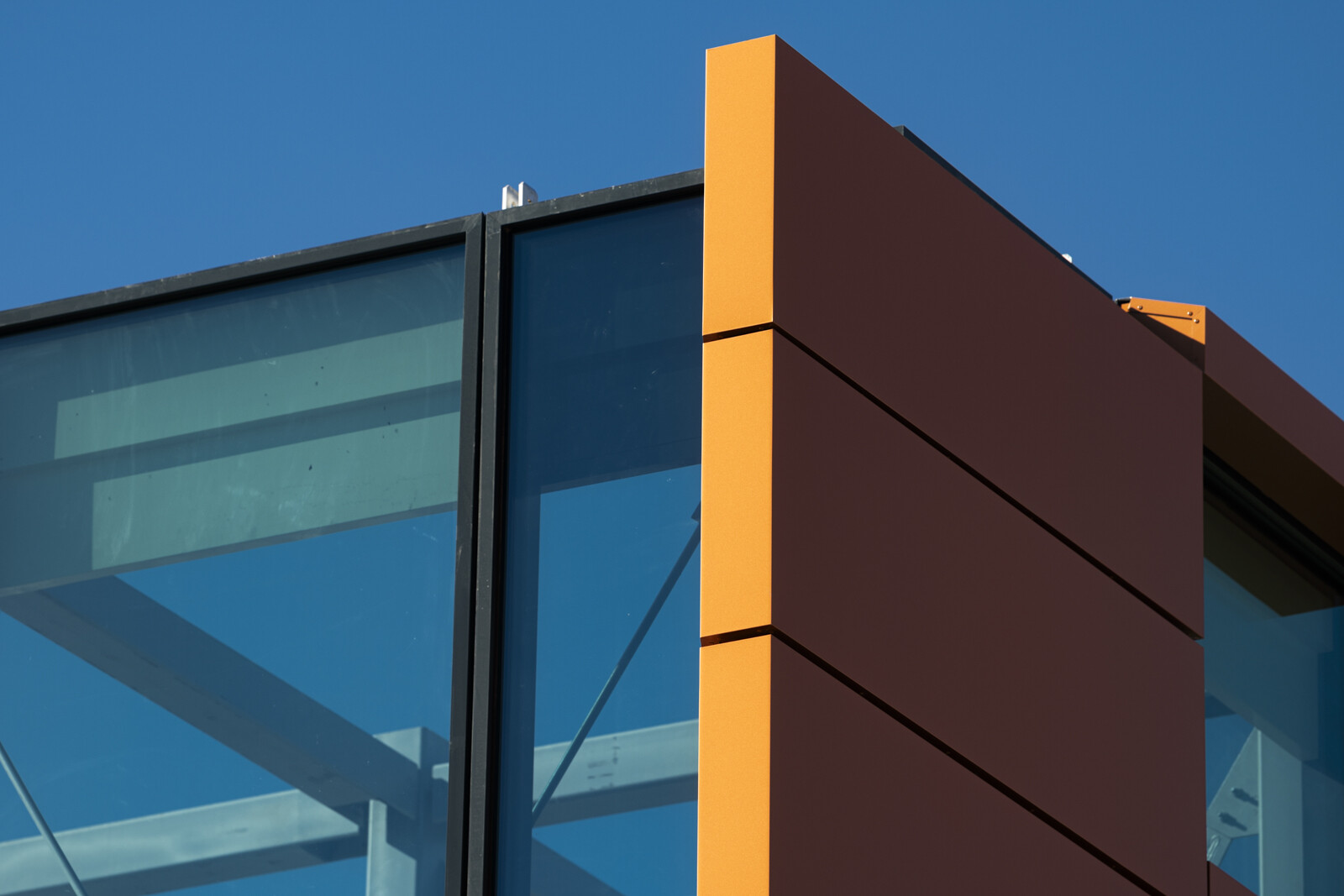 A piacon fellelhető lehetőségek közül végül a kompozit lemezekre esett a választás, amelyek műszakilag és esztétikailag is magas minőséget képviselnek, valamint kreatív építészeti lehetőségeket adnak. A fém súlya kifejezetten könnyű, egyszerűen feldolgozható és telepíthető, emellett esztétikus megjelenést biztosít.