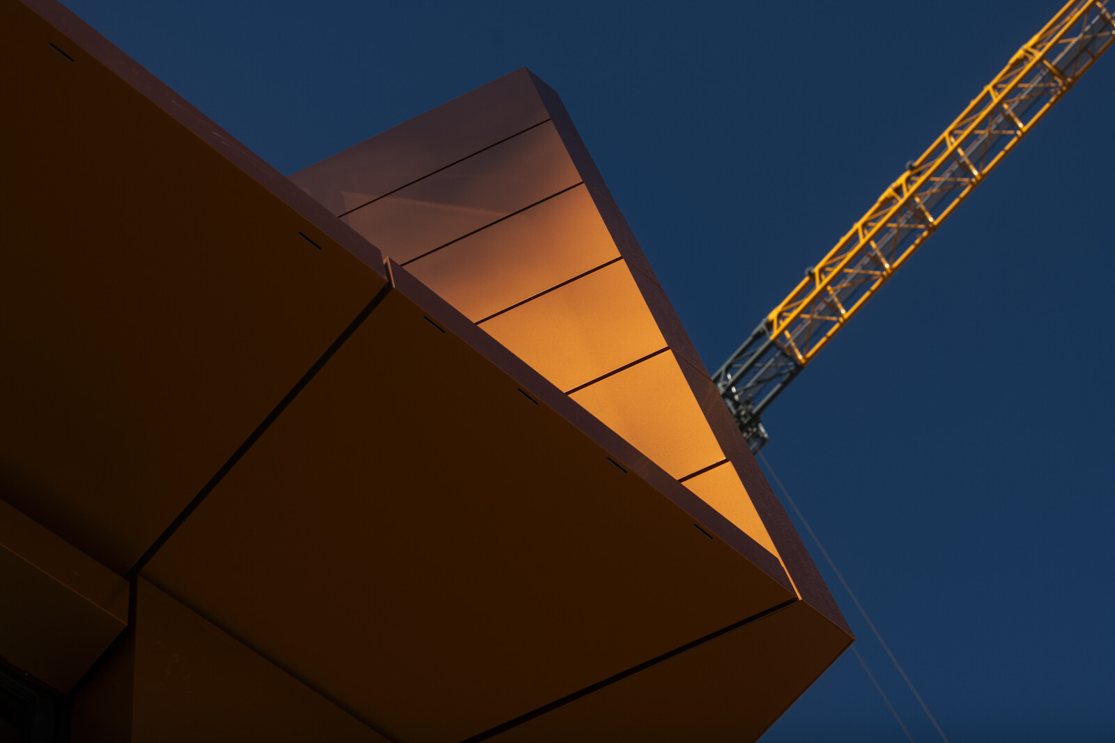 Az épületek egymáshoz képest elforgatott pozícióban vannak, sőt a lemezek szálirányban is el vannak forgatva, így két egymás mellett lévő épület, de még két egymás melletti felület sem fogja feltétlenül ugyanazt a színt adni. Teljesen más színt mutat a kora reggeli napfényben, mint estefelé.