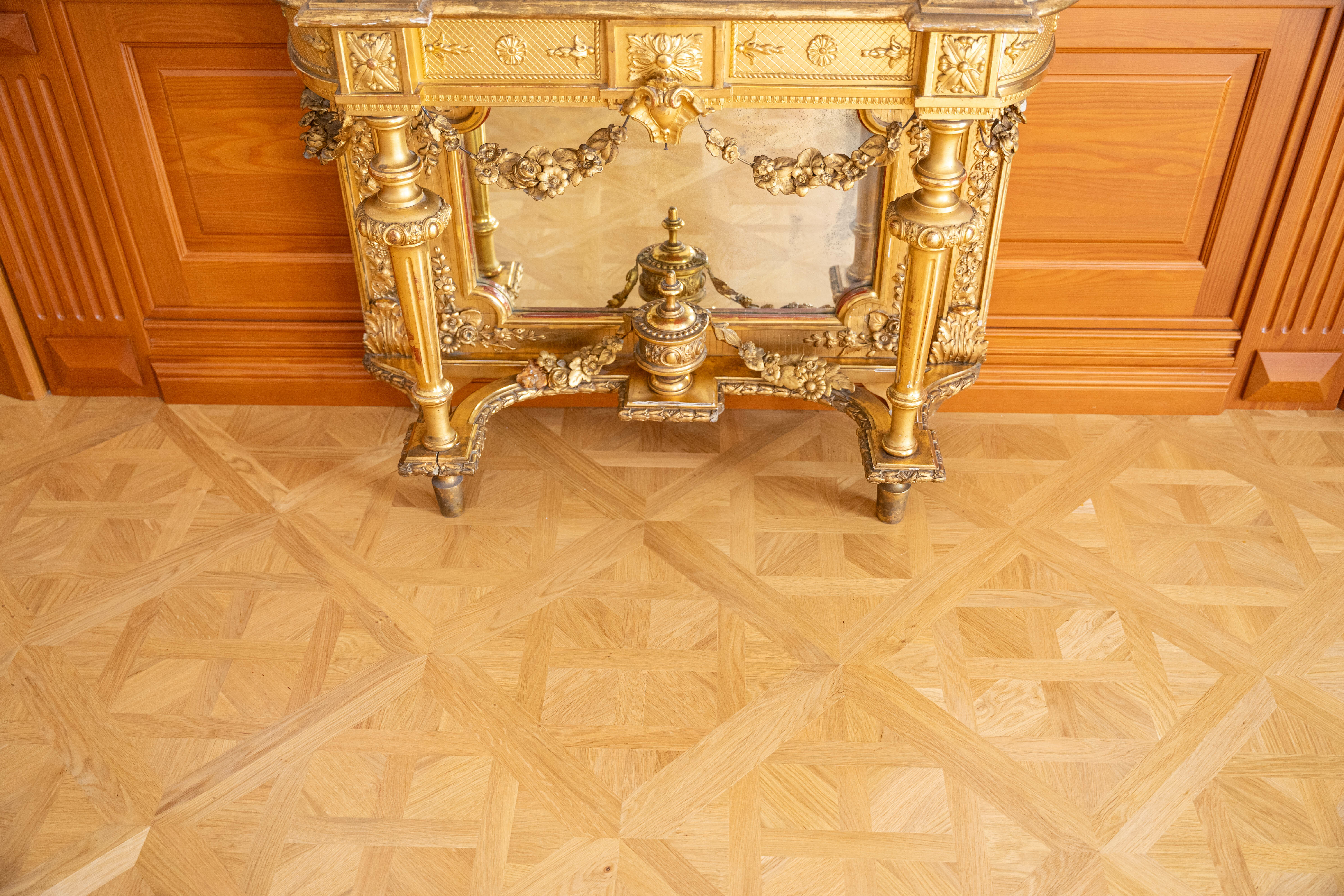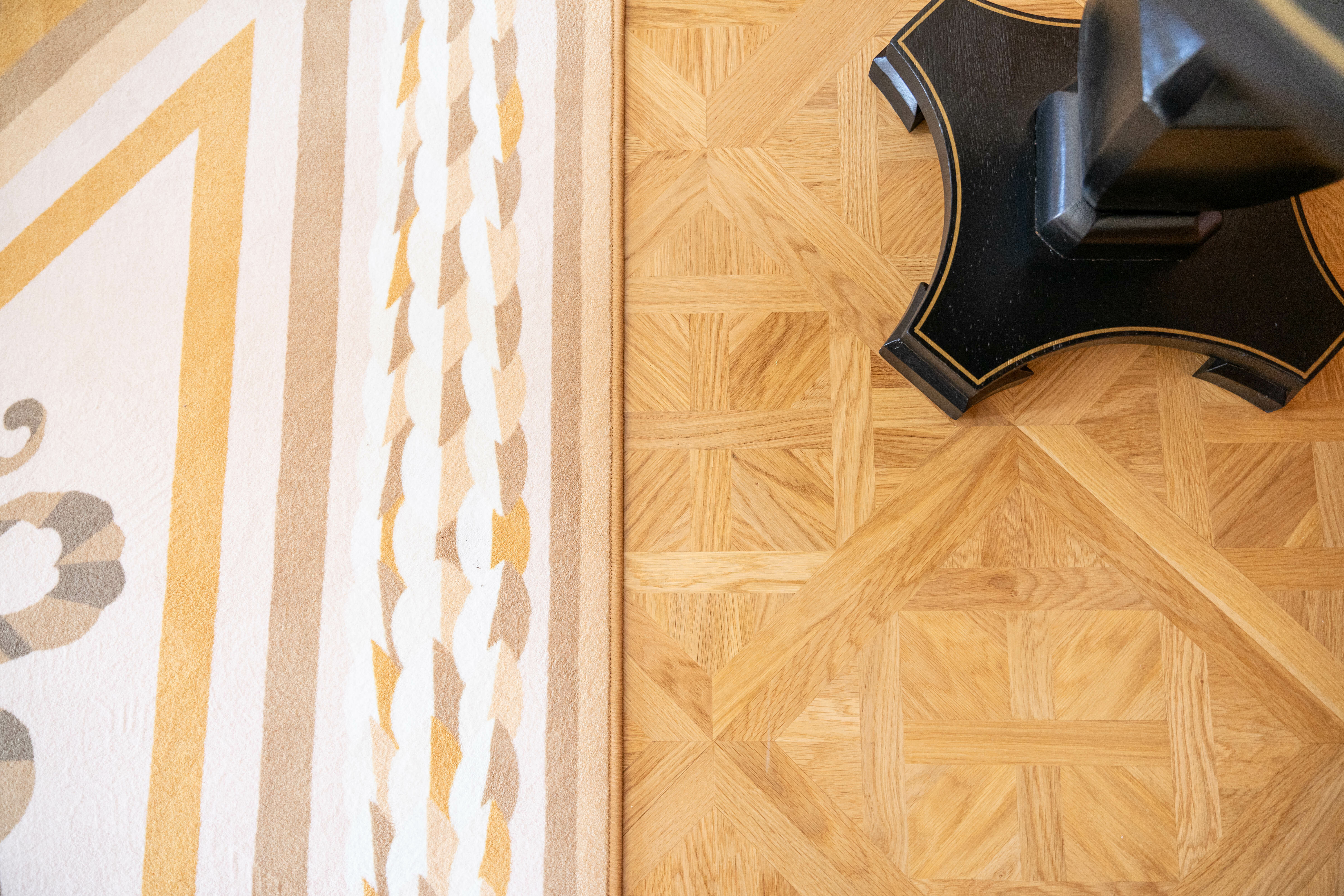 Az intarziás parketta fektetésére a gipszstukkókkal, freskókkal, díszes bútorokkal, fából készült falvédőkkel és nyílászárókkal gazdagon díszített ebédlőben került sor. A melegburkolat kialakítását itt is megelőzte a bontás, majd az aljzat megfelelő rétegrendi kialakítása. Az új fogadófelület kiegyenlítéséhez a díszebédlőben is az ULTRAPLAN ECO kiegyenlítőanyagot alkalmazták a kivitelezők, a faparketta ragasztásához pedig az ULTRABOND ECO S955 ragasztóanyagunkat használták.