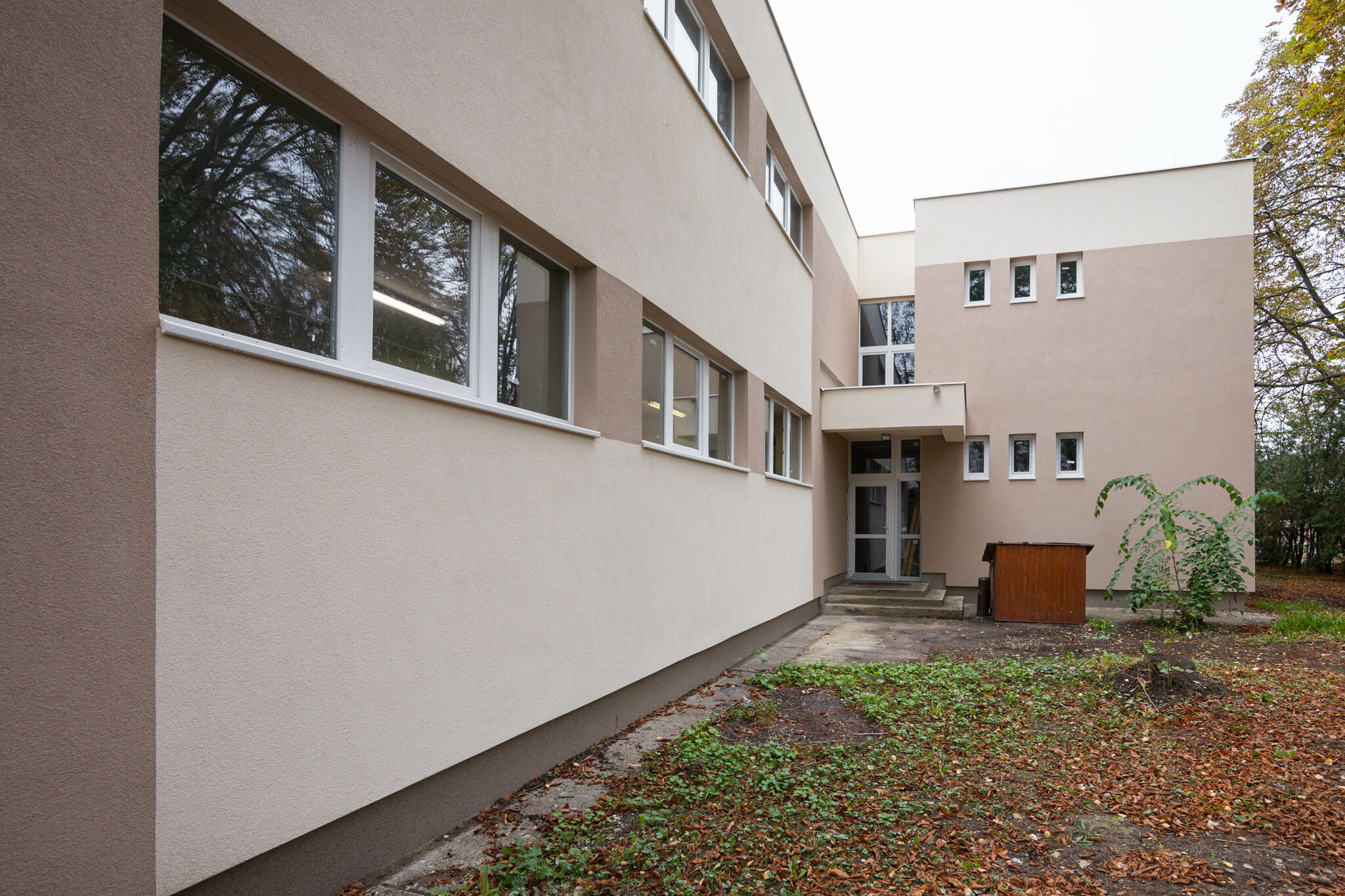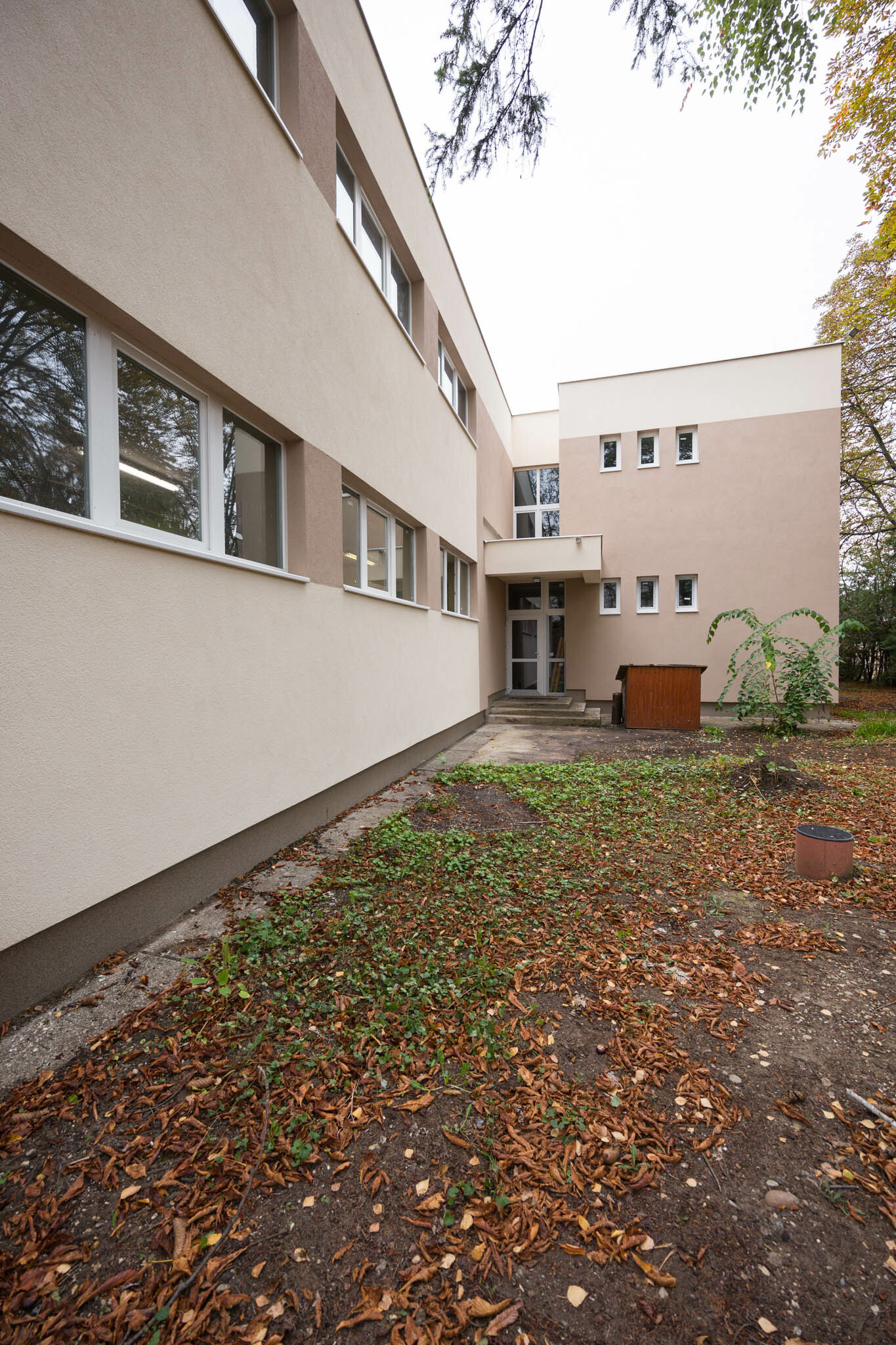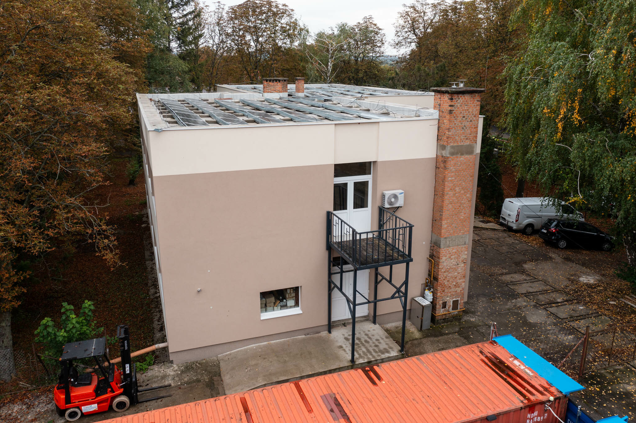 A vízzárási funkcióját már épp csak ellátni képes, szigetelés nélküli zárófödém teljes felújítása is elkészült, itt a PVC vízszigetelés mellett 20 cm EPS hőszigetelést is alkalmaztak a szakemberek. Energetikai felújításuk másik alappillére egy erre került 41 kWp-os napelemrendszer kiépítése volt, amelynek méretezésénél figyelembe vették a környező a fák árnyékolásának negatív hatását is.