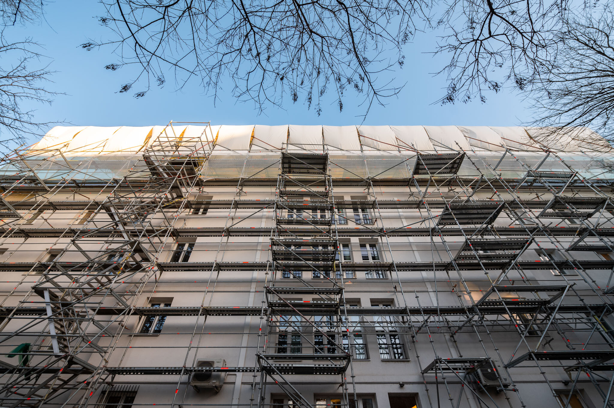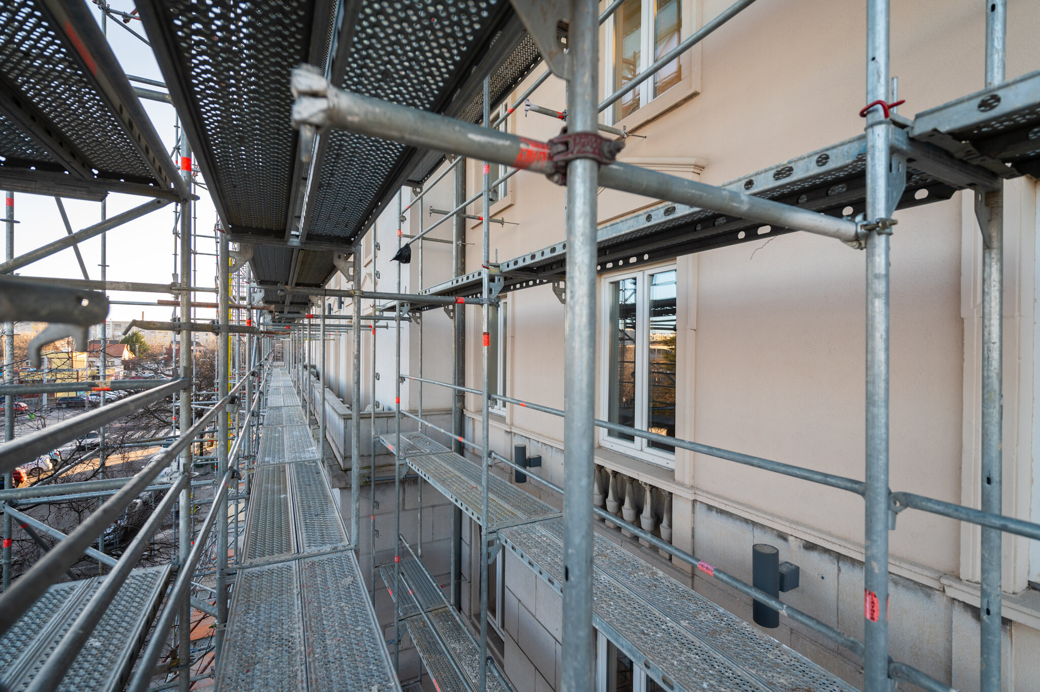 Leica műszerrel végeztek scannelést a Layher Kft. mérnökkollégái az épületen: nemcsak az utca felőli oldalra került állvány épült terv szerint, de a scannelés segítségével el lehetett végezni a belső állvány pontos kitűzését is. Layher-szoftverek közül a LayPLAN CAD-et használták a tervezők a lehető legpontosabb eredmény érdekében.