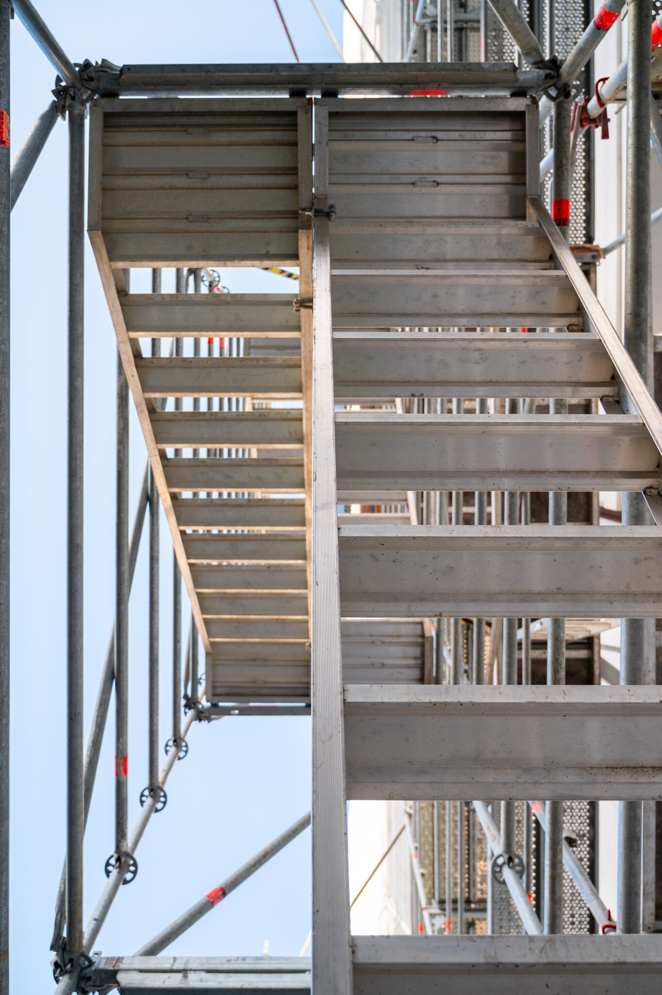 Zavartalanul üzemelnie kell a Kormányablaknak a felújítás ideje alatt is, ezért a kivitelezőknek biztosítania kellett a közlekedést az ott dolgozók és az ügyfelek részére. Erre a Layher Allround állványrendszerből kialakított, korláttal és védőtetővel ellátott járdaalagút biztosít megoldást, amelyre a belső udvarihoz hasonlóan Blitz állványzat került. Az utcai homlokzaton a Blitz állványzat mellé Allround Podest lépcsőtornyot építettek, amely lehetővé teszi a munkaterület biztonságos megközelítését. A lépcsőtorony a hagyományos létrás közlekedés alternatívája az állványon, amely biztonságos, gyors és praktikus megközelítést tesz lehetővé.