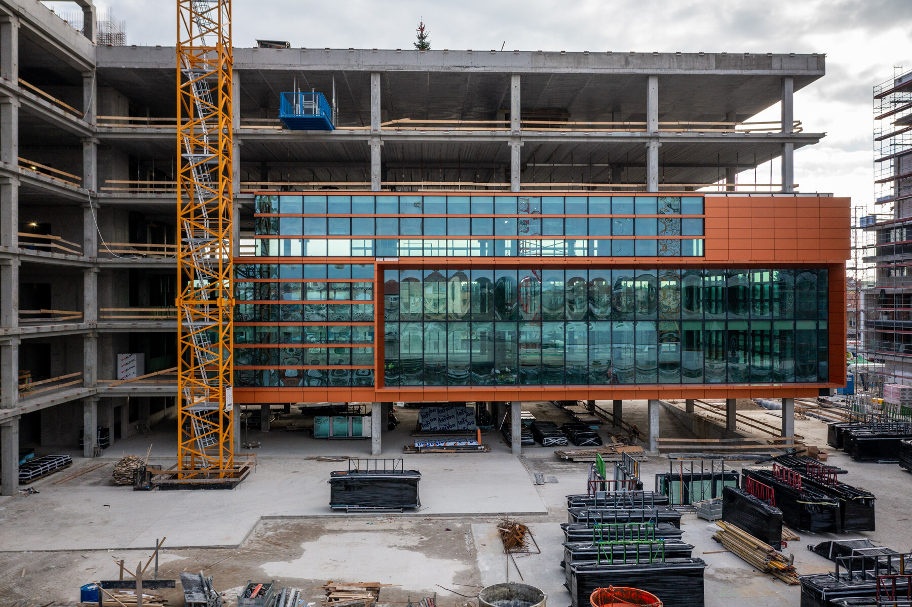 Ez az épület adja majd a teljes beruházás kapuját, innen válnak a közlekedési csomópontokról gyalogosan elérhetővé a hátrébb lévő épületek. A létesítményeket keresztülszelő folyosó-passzás rávezet majd a központi sétányra, ahol csak gyalogosan lehet közlekedni. Rengeteg zöld és magas minőségű burkolatok jellemzik majd a területet. Erre a központi tengelyre szerveződik rá mind a nyolc épület.