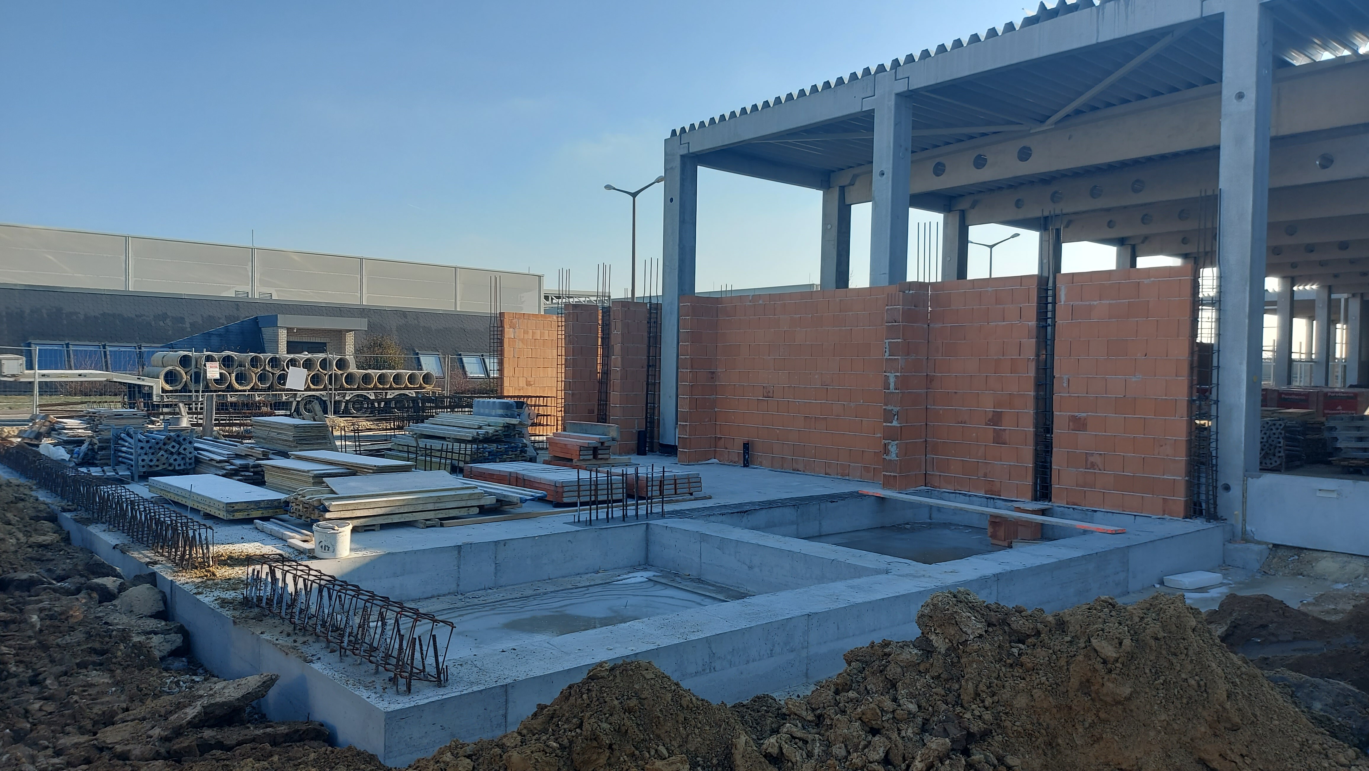 A csarnok területén még folyamatban van a közműépítési munka, jelenleg mintegy 40 százalékos készültséggel. A hozzávetőleg 500 négyzetméter alapterületű, kétszintes fejépület földszinti szerkezetépítése jelenleg a fagyos időjárás miatt szünetel.