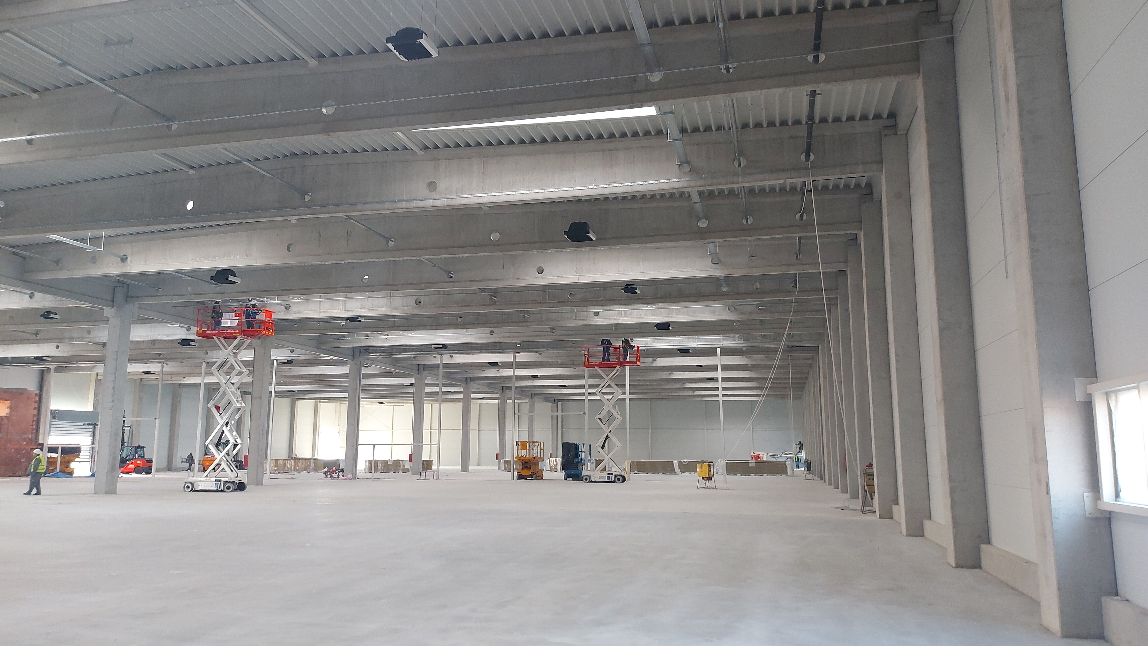 Ugyanitt a gépész és villamos függesztett szerelésből a nyomvonalépítési munkák elkészültek. Jelenleg a thermoventillátorok telepítése van folyamatban, valamint elkezdődött a kábelezési munka. Az ipari kapuk beépítése szintén zajlik, valamint megkezdődött a szociális épület befejező munkája.