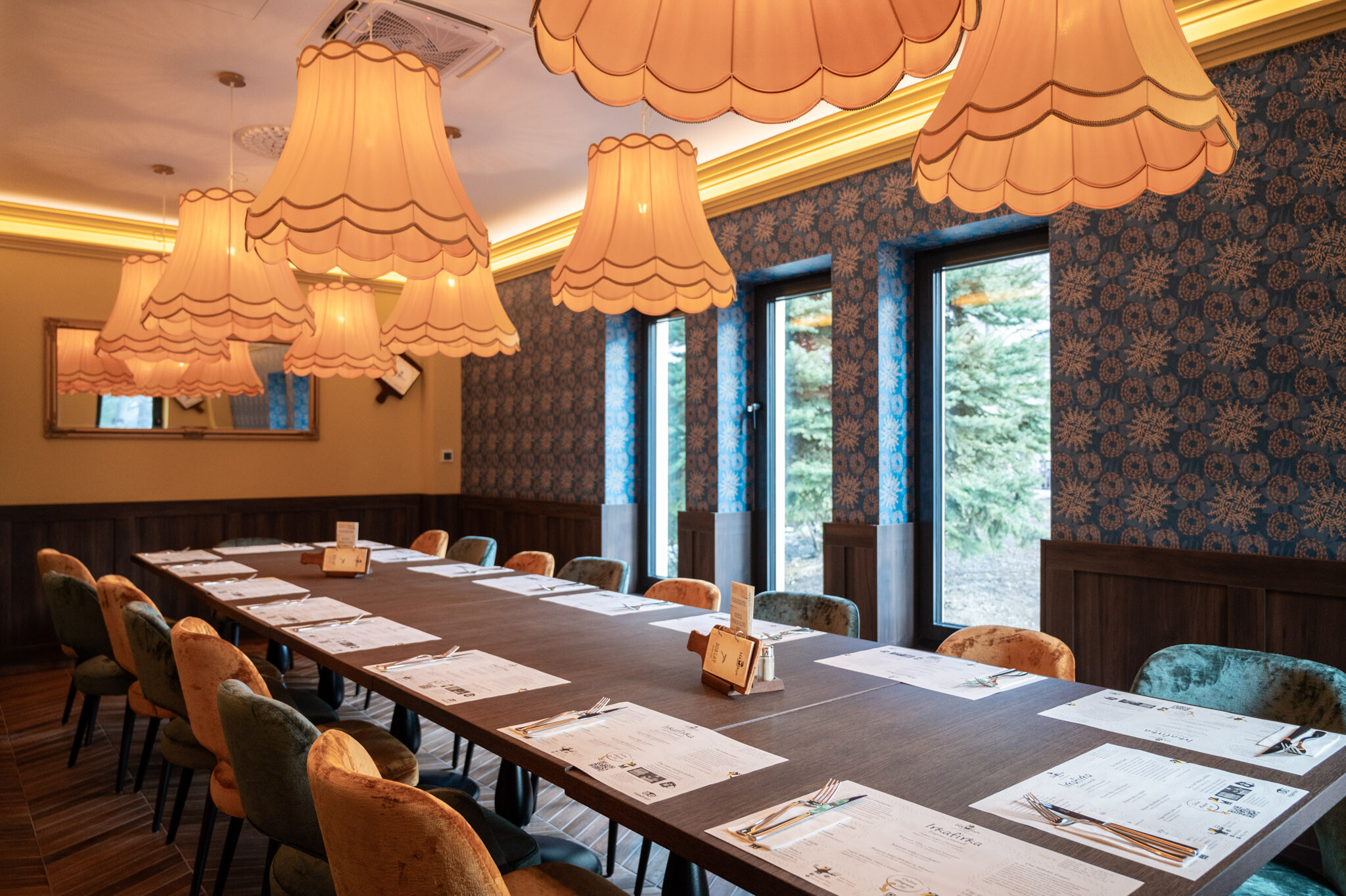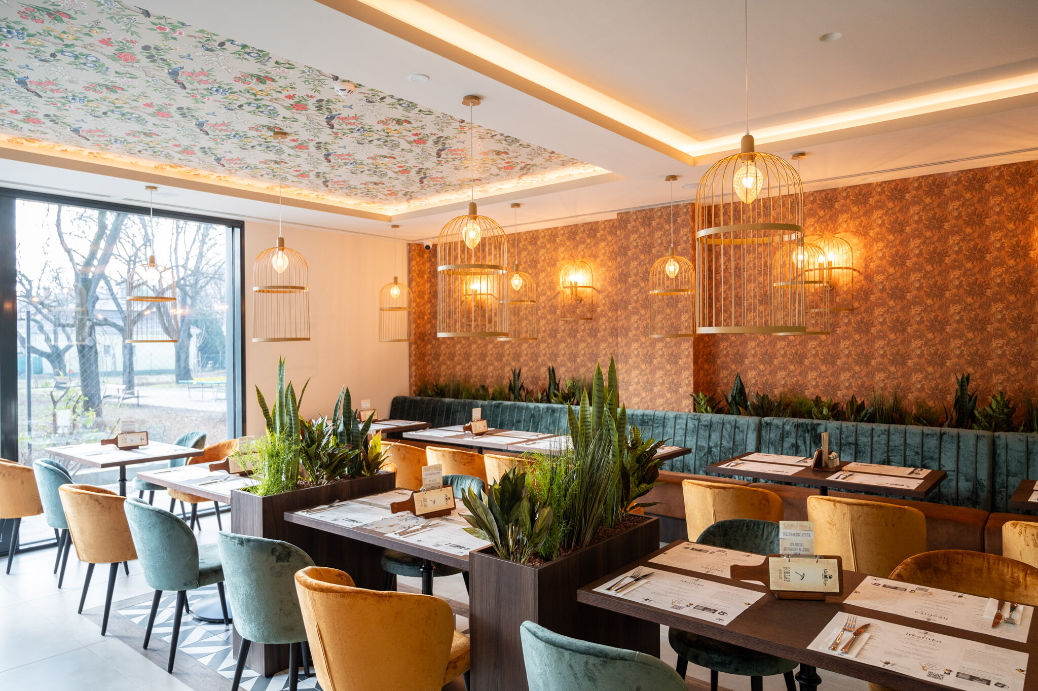 Ebben a szellemiségben alakították ki Szabó Attila belsőépítésszel a tereket: az új étteremben különböző stílusvilágok találkoznak: a burkolatok a modernitást, a rejtett fények, a stukkók a múlt század elejének polgári világát tükrözik.