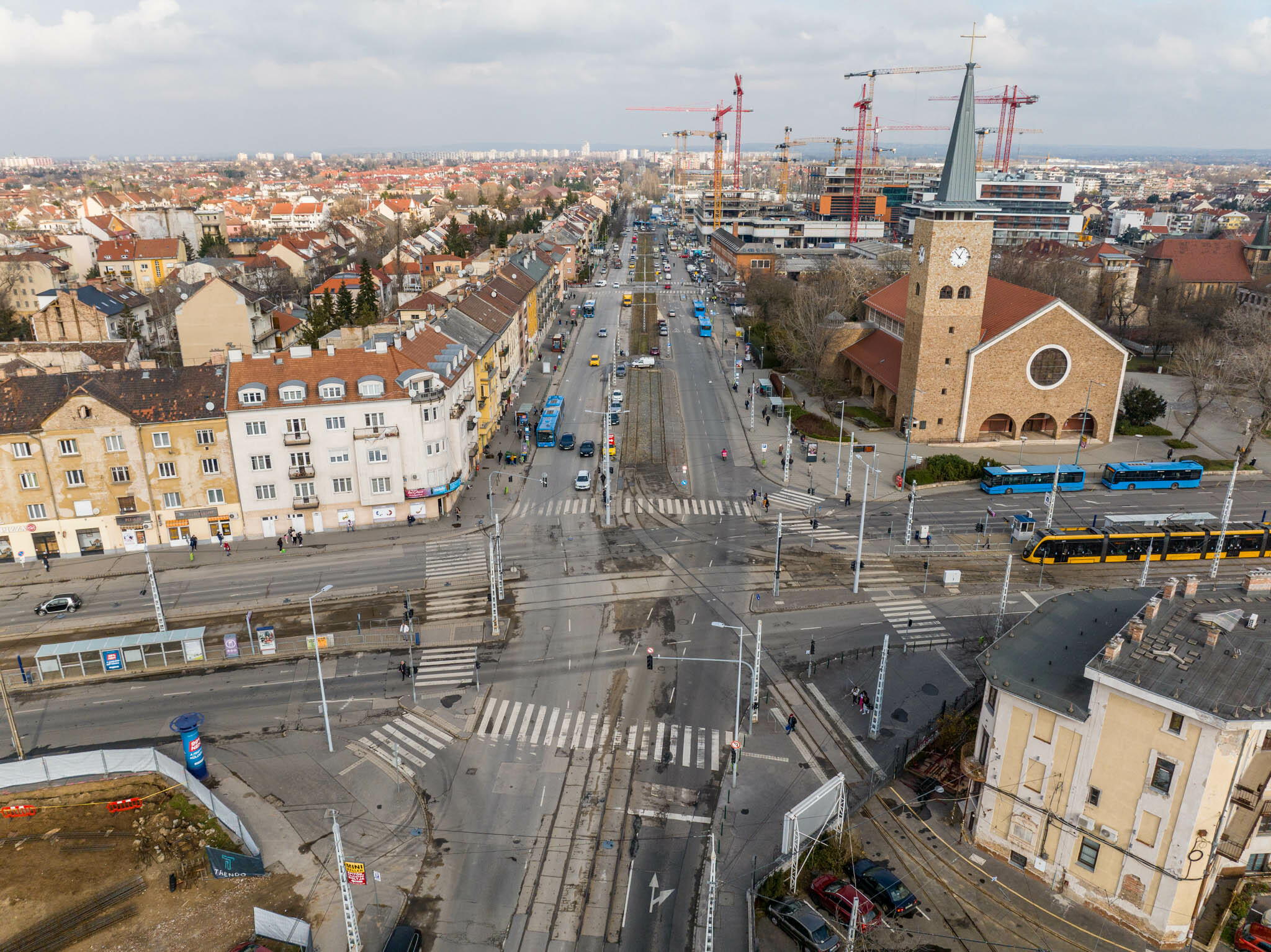 „Tervünk lényege, hogy elkülönítettük a tömegközlekedés útvonalait az autós forgalomtól” – részletezte a projektmenedzser. „A tömegközlekedés egy középső tengelyen kap helyet 2x1 sávos buszsávban, védett útvonalon. Ez jelentősen gyorsítja a buszok mozgását, hiszen így nem kerülhetnek dugóba.”