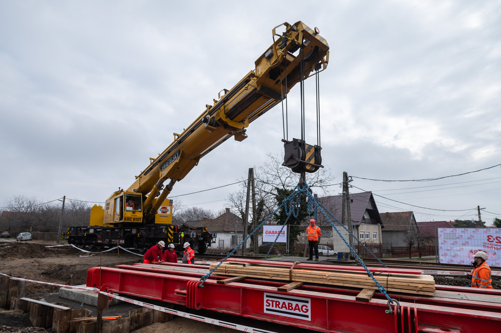 Az Eötvös utcai új gyalogos aluljáró a Budapest-Belgrád vasútvonal 142+10 hm szelvényében épül. Február 26-án ide emelték be a STRABAG P12,60 típusú ideiglenes hídelemét, ami az aluljáró szerkezetépítésének idején is lehetővé teszi a vasúti forgalom fenntartását.