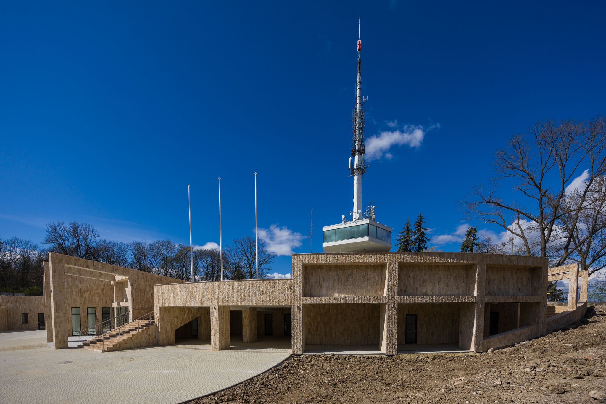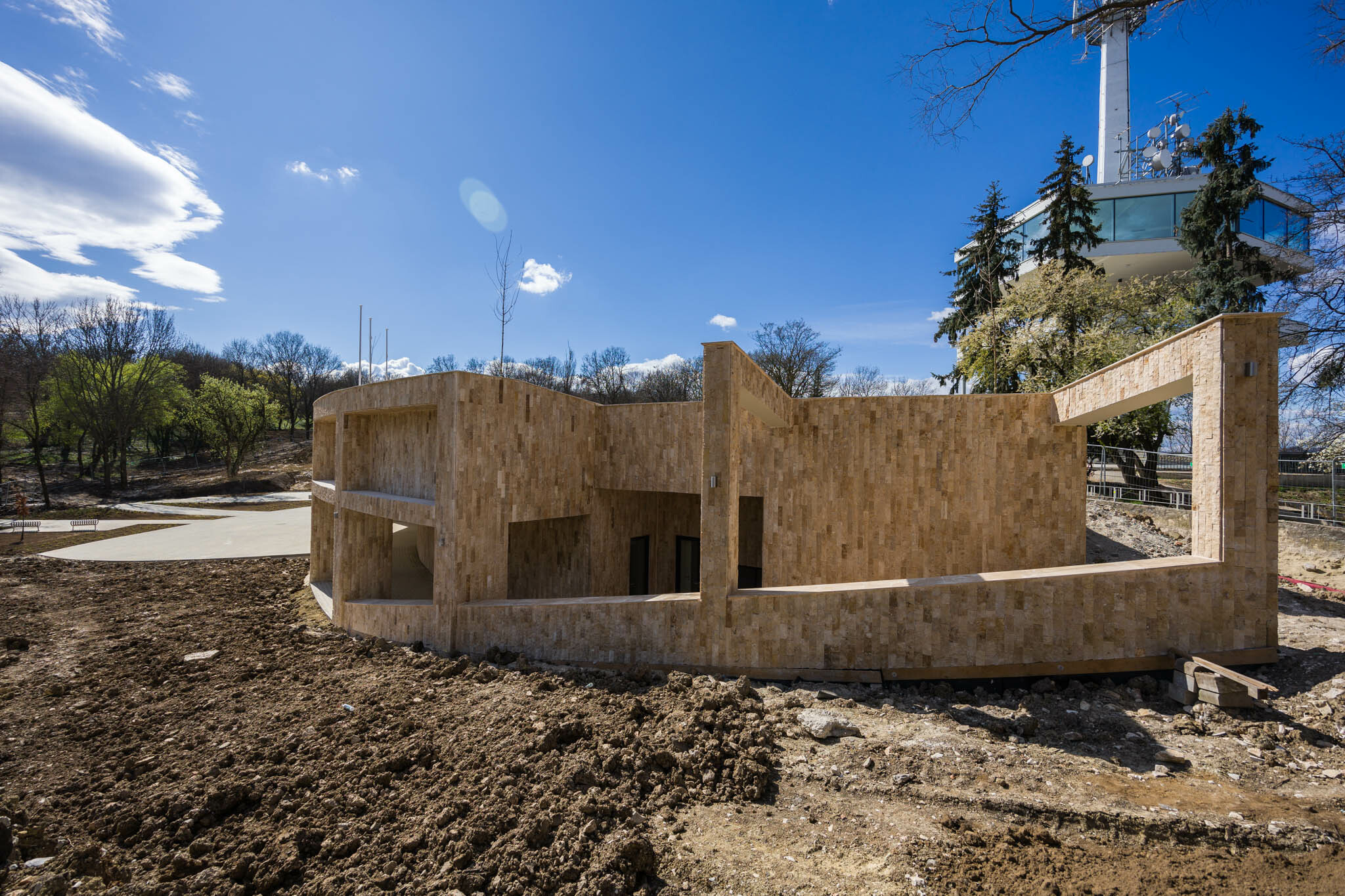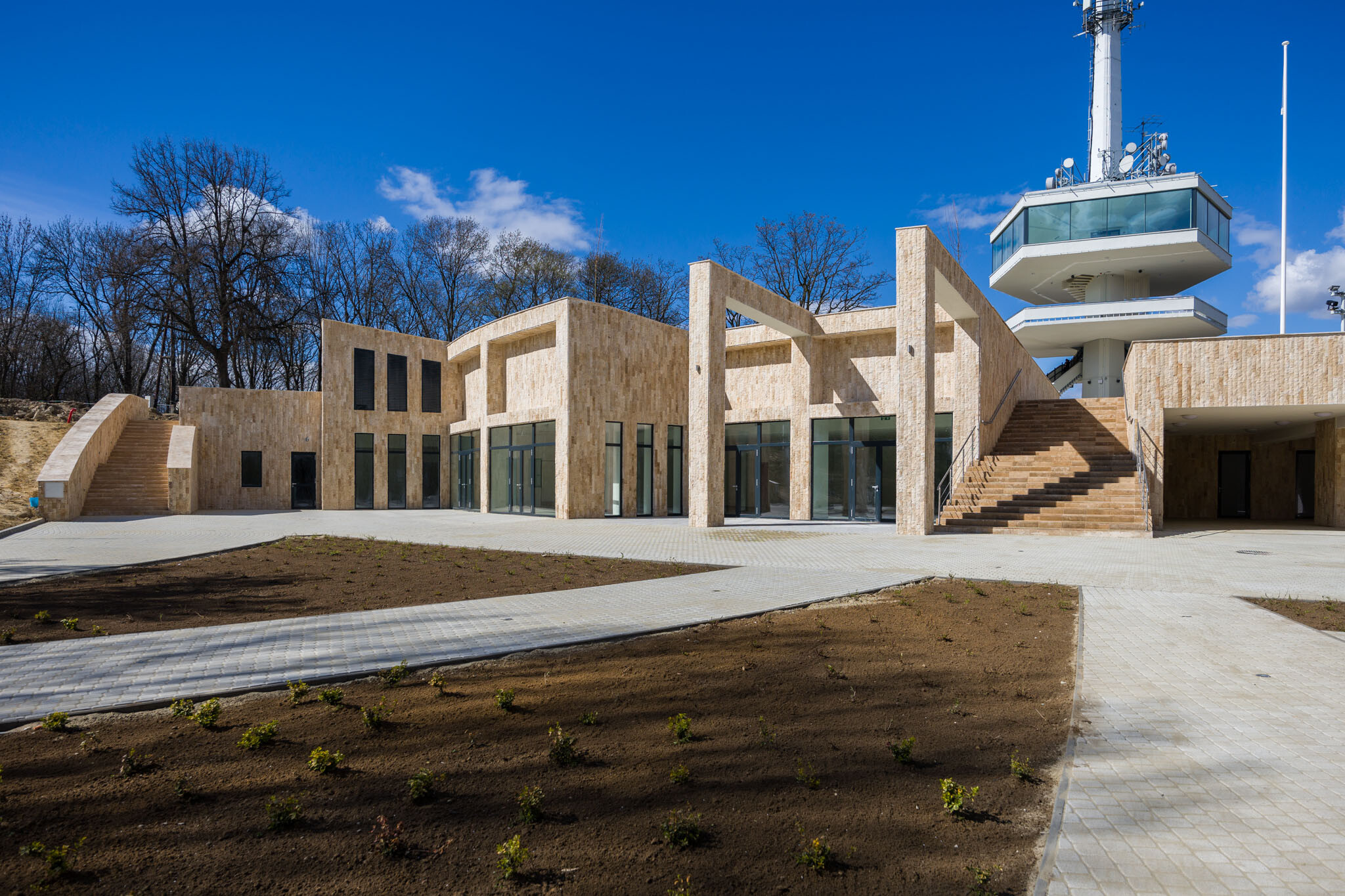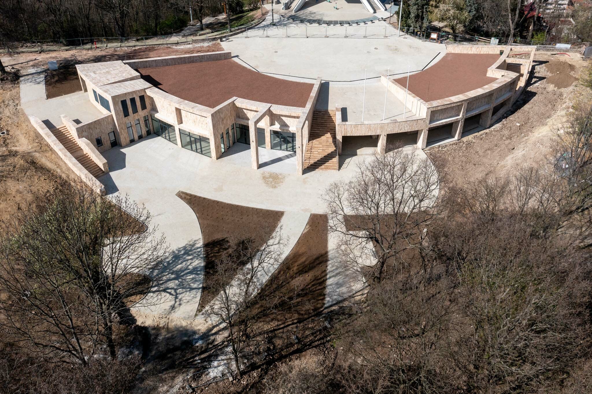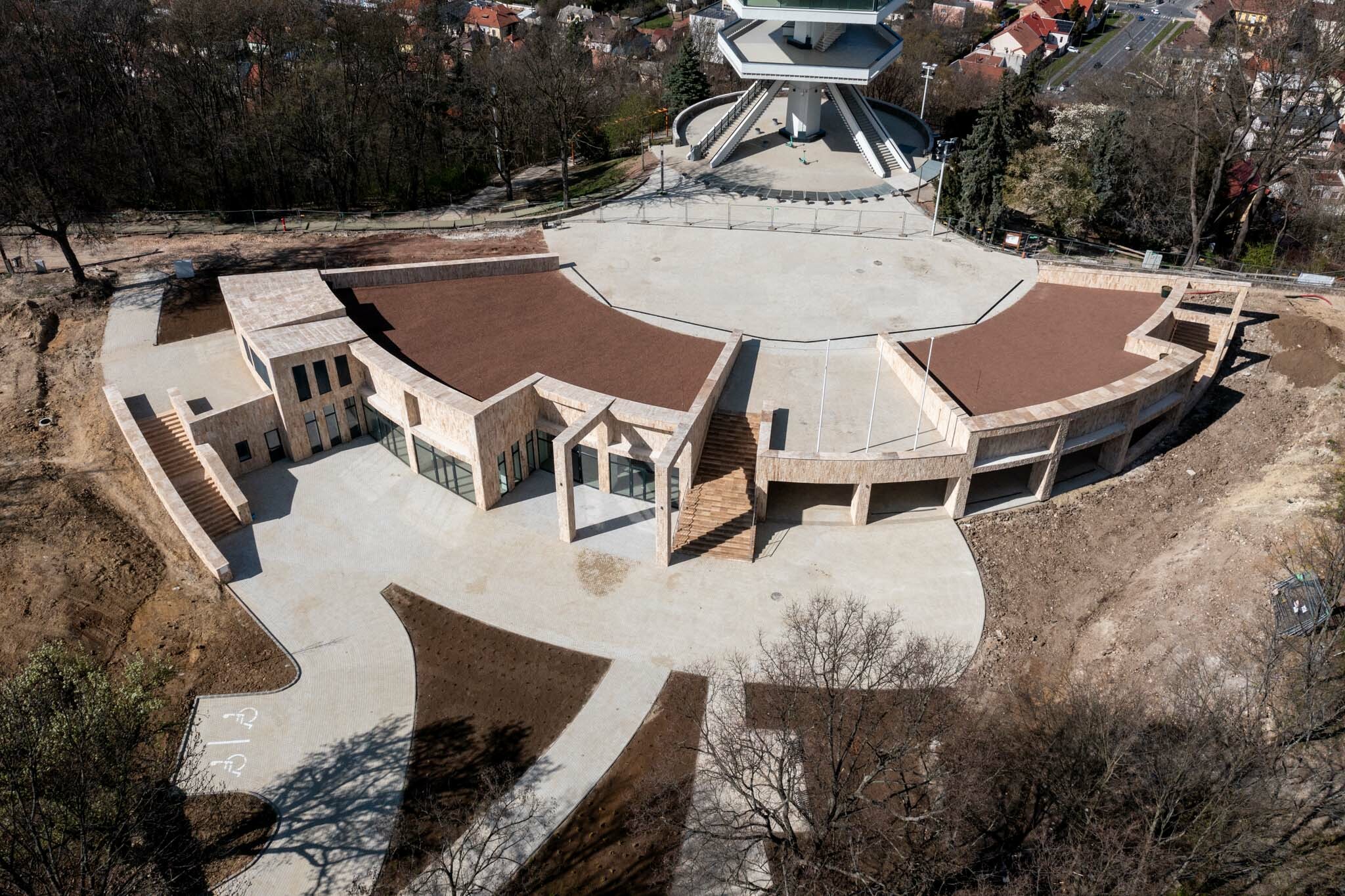 Koncentrikus körcikkelyekre szerkesztett épületet emelt az Épkar, amelynek egyenetlen elosztású beugratásokkal karakteressé emelt, a markáns vasbeton vázat sejteni engedő homlokzatát a kilátó felé vezető széles lépcsősor osztja két, funkciójában is elkülönülő részre. Az erőteljes fény-árnyék hatásokkal játszó, váltakozó szintmagasságú épület felületképzése és kompozíciója egyaránt az ókori amfiteátrumok romjainak parafrázisa, amelyben a kivitelező vendéglátó egységet, komfortpontokat, valamint információs kiállító teret hozhatott létre, összesen 1021 m2-en.