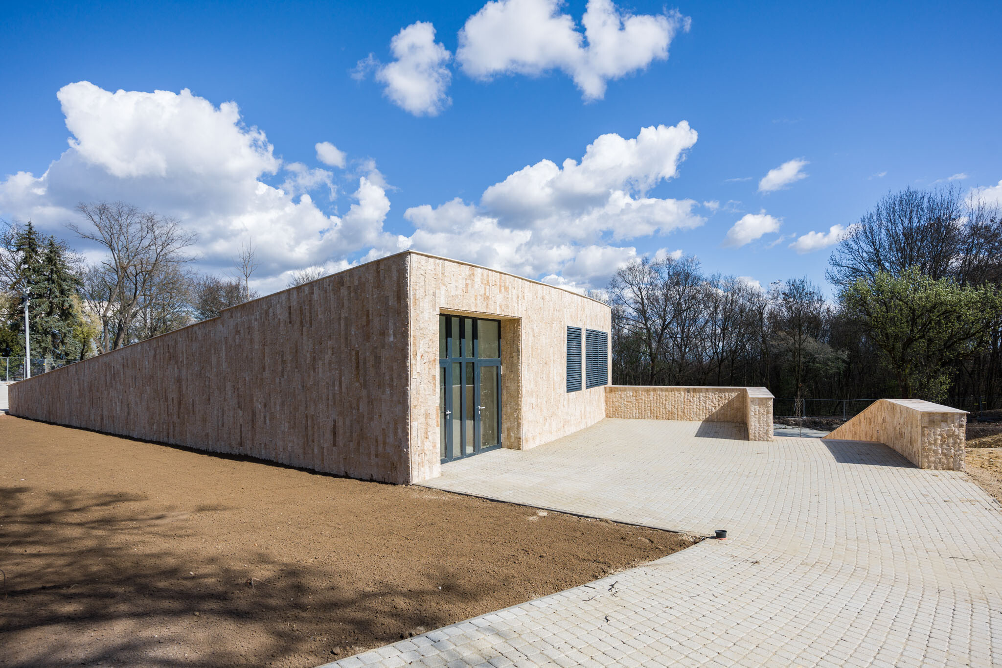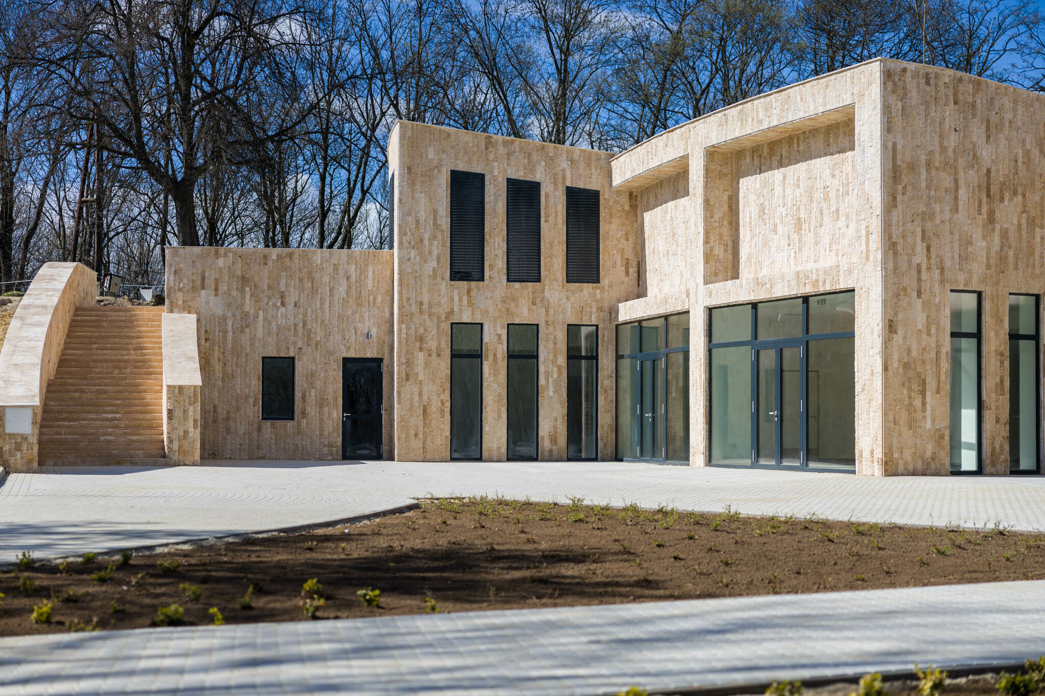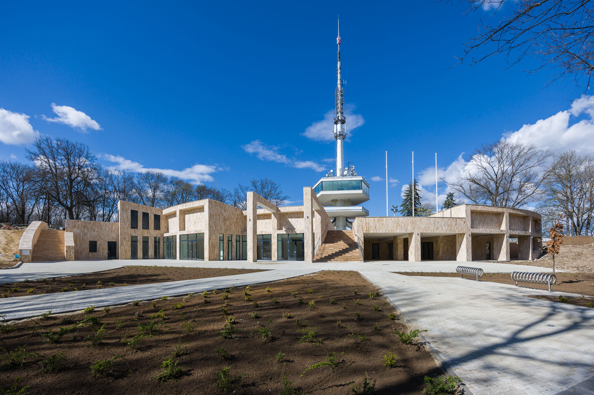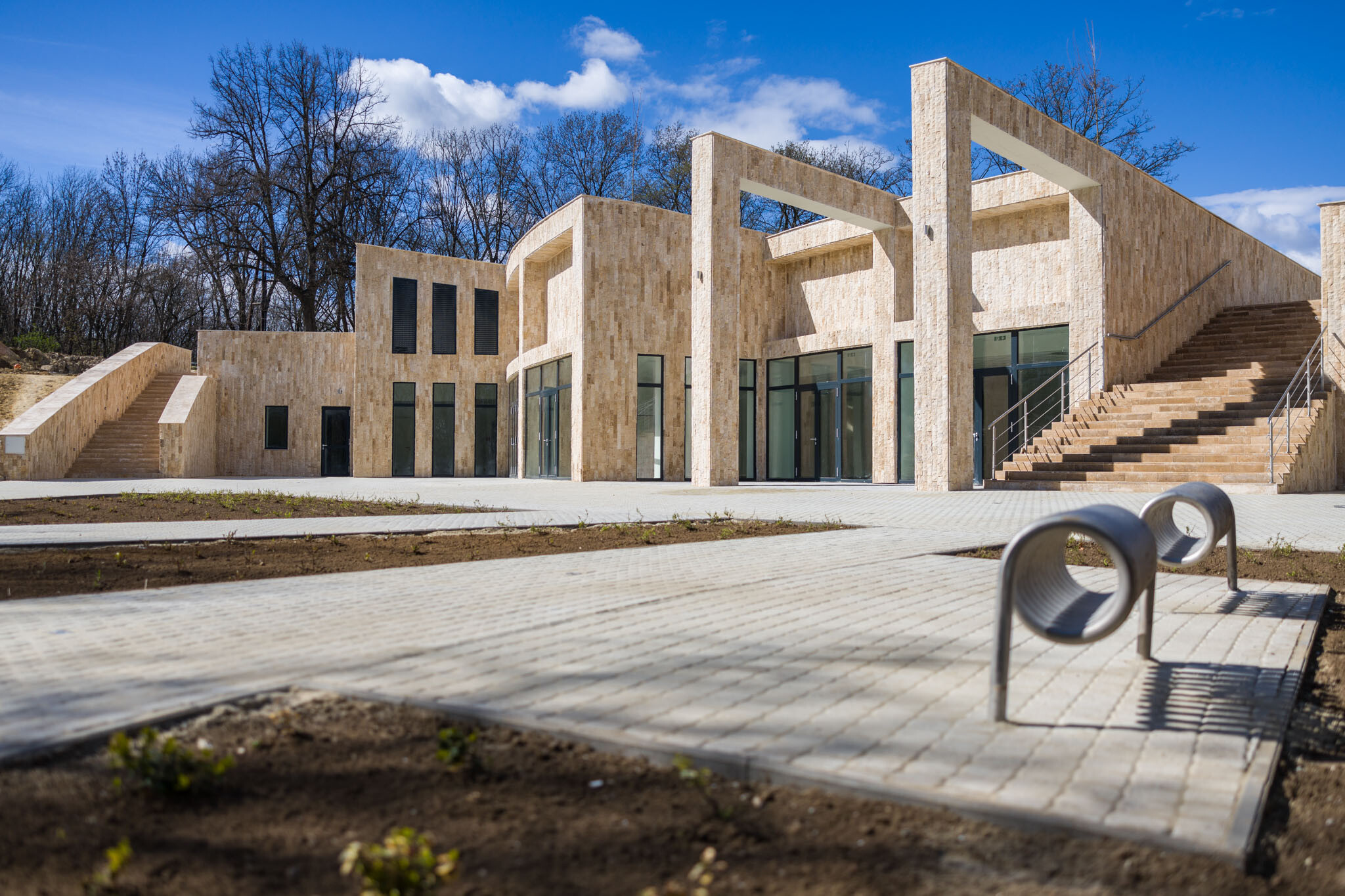 Koncentrikus körcikkelyekre szerkesztett épületet emelt az Épkar, amelynek egyenetlen elosztású beugratásokkal karakteressé emelt, a markáns vasbeton vázat sejteni engedő homlokzatát a kilátó felé vezető széles lépcsősor osztja két, funkciójában is elkülönülő részre. Az erőteljes fény-árnyék hatásokkal játszó, váltakozó szintmagasságú épület felületképzése és kompozíciója egyaránt az ókori amfiteátrumok romjainak parafrázisa, amelyben a kivitelező vendéglátó egységet, komfortpontokat, valamint információs kiállító teret hozhatott létre, összesen 1021 m2-en.