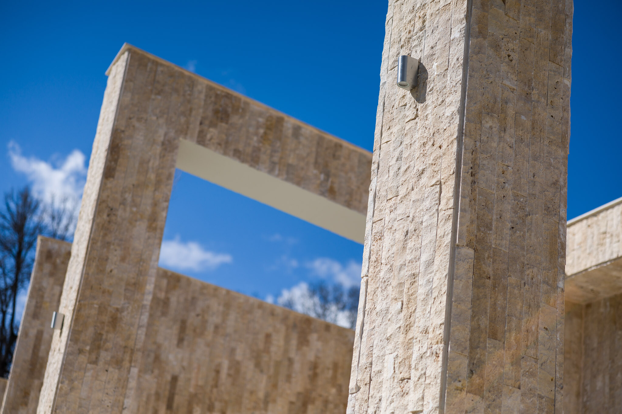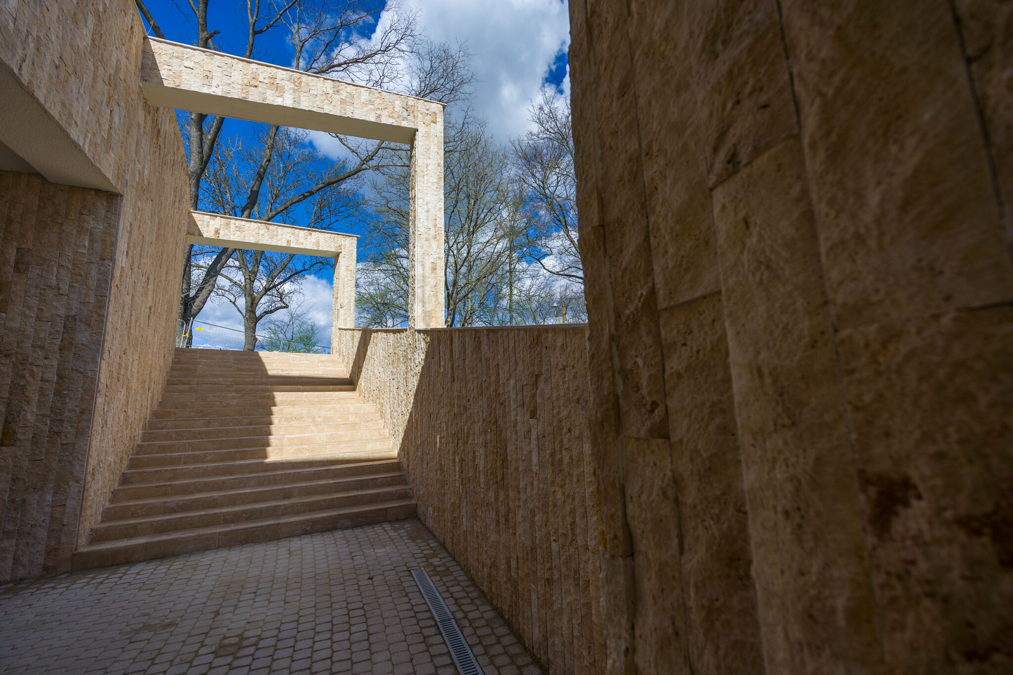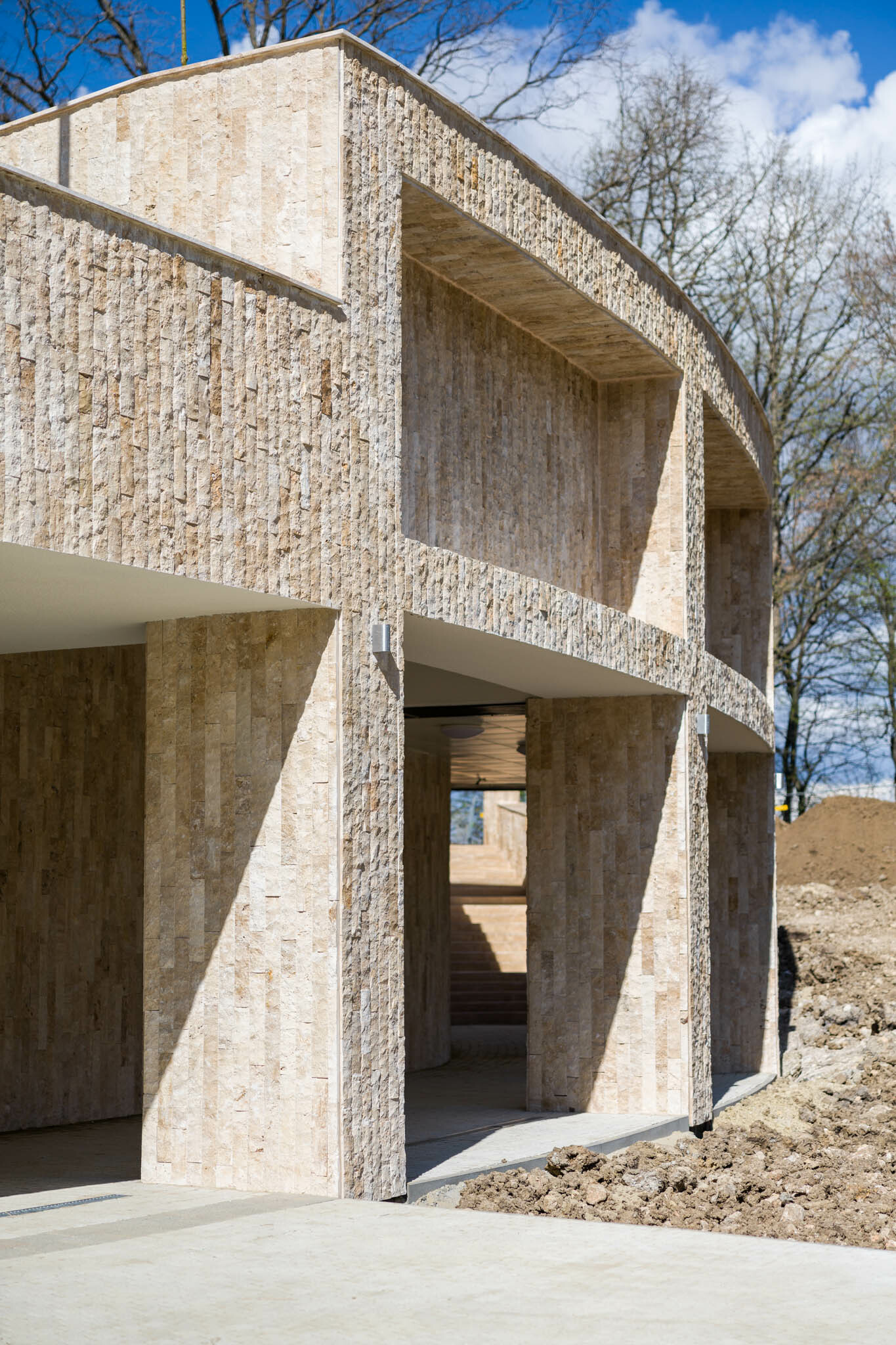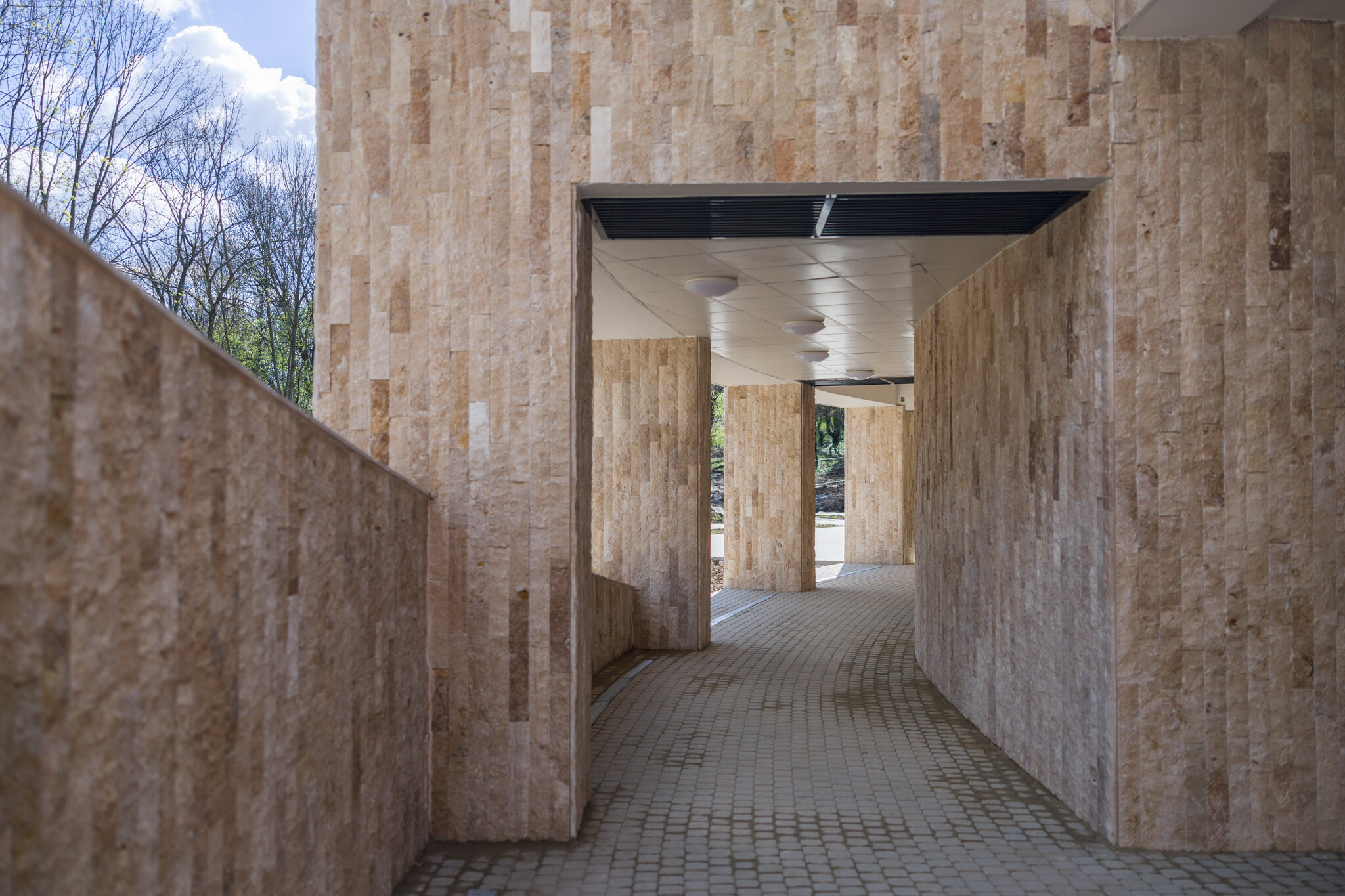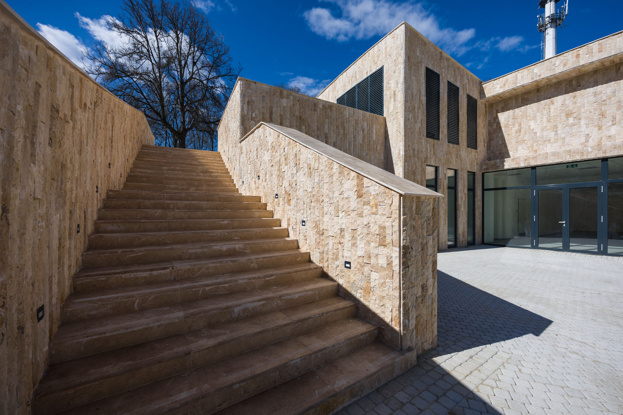 Koncentrikus körcikkelyekre szerkesztett épületet emelt az Épkar, amelynek egyenetlen elosztású beugratásokkal karakteressé emelt, a markáns vasbeton vázat sejteni engedő homlokzatát a kilátó felé vezető széles lépcsősor osztja két, funkciójában is elkülönülő részre. Az erőteljes fény-árnyék hatásokkal játszó, váltakozó szintmagasságú épület felületképzése és kompozíciója egyaránt az ókori amfiteátrumok romjainak parafrázisa, amelyben a kivitelező vendéglátó egységet, komfortpontokat, valamint információs kiállító teret hozhatott létre, összesen 1021 m2-en.