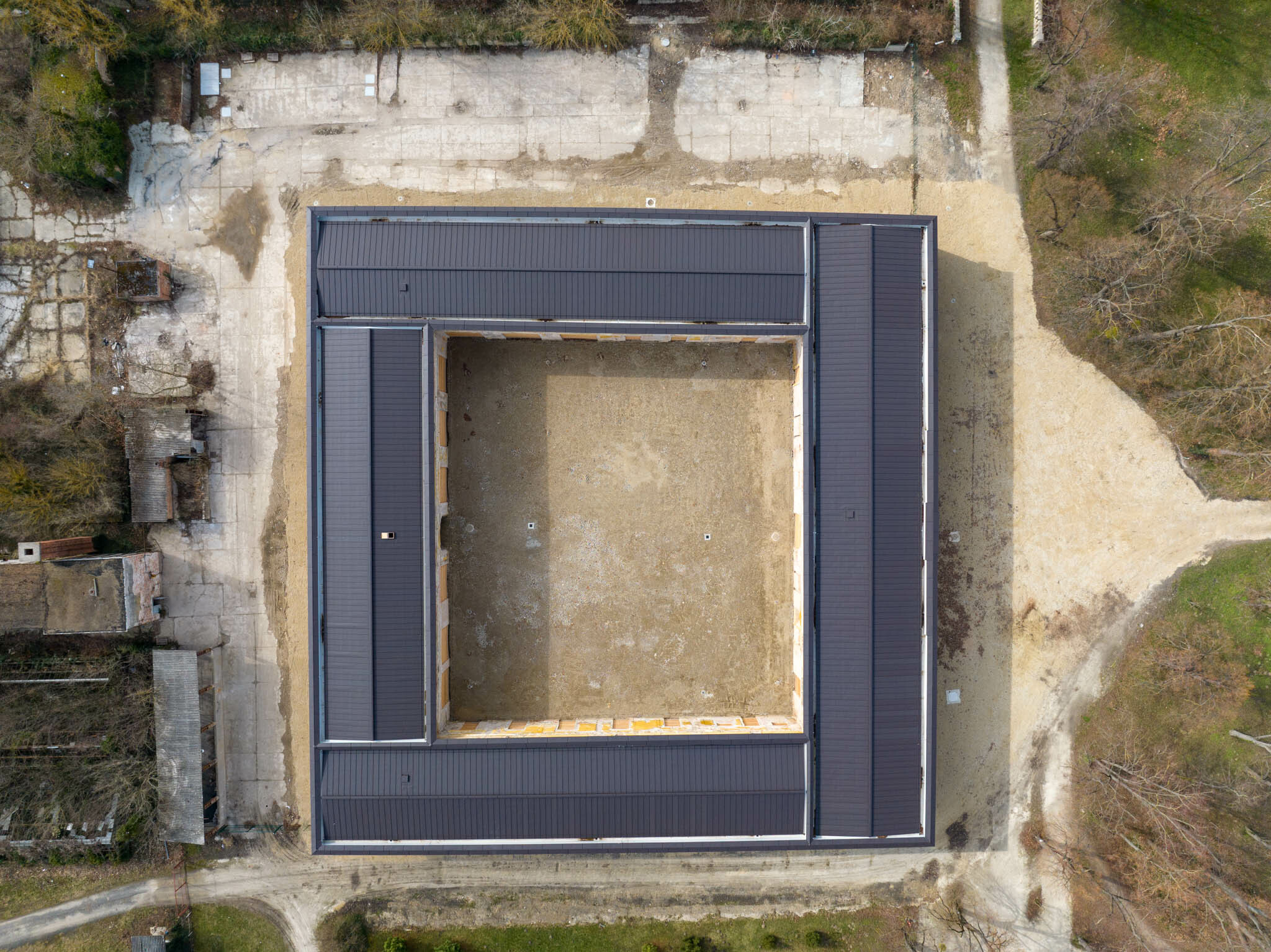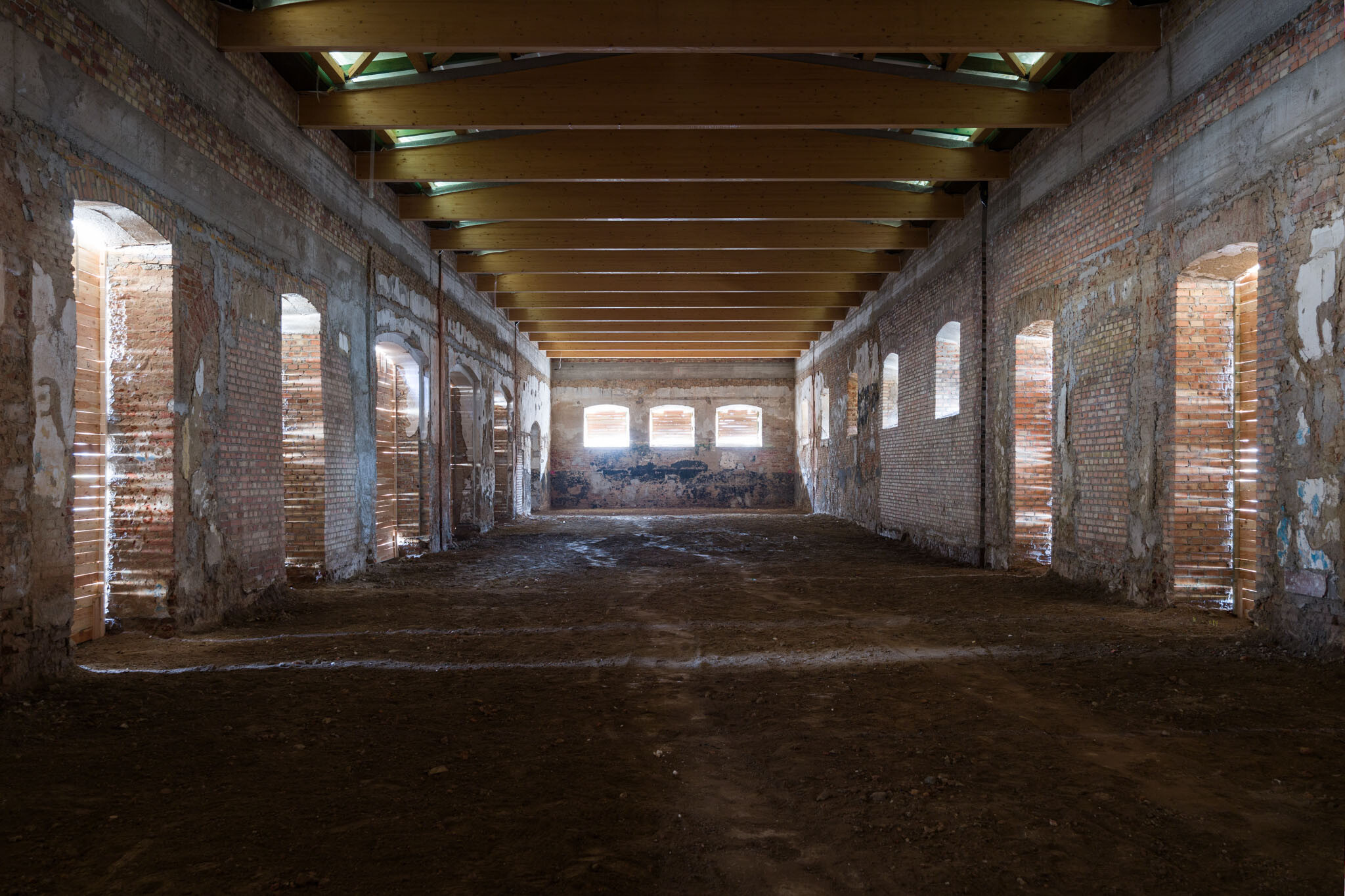A kivitelezés során a fa tetőszerkezet, a válaszfalakat, a lépcsőket és az egész istálló területére utólagosan beépített alulbordás vasbetonfödémet is el kellett távolítani. A bontás után vasbeton koszorú készült, amelyre újonnan építették fel a ragasztott fatartós tetőszerkezetet a keménylemezes fedéssel.