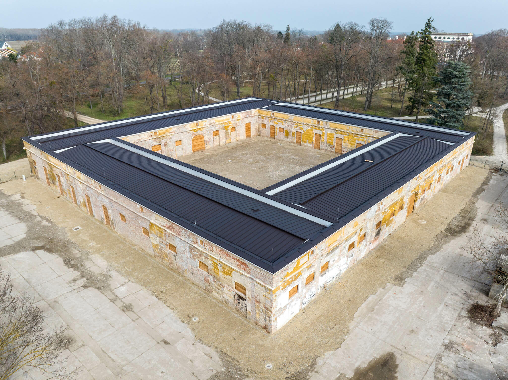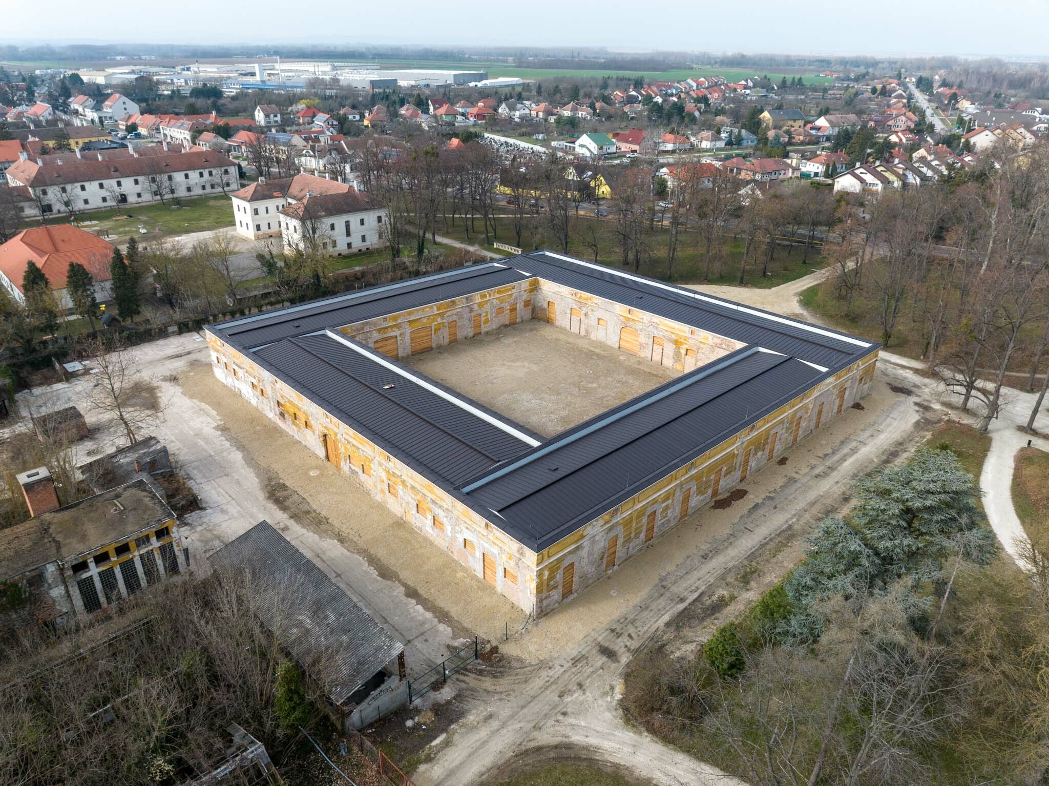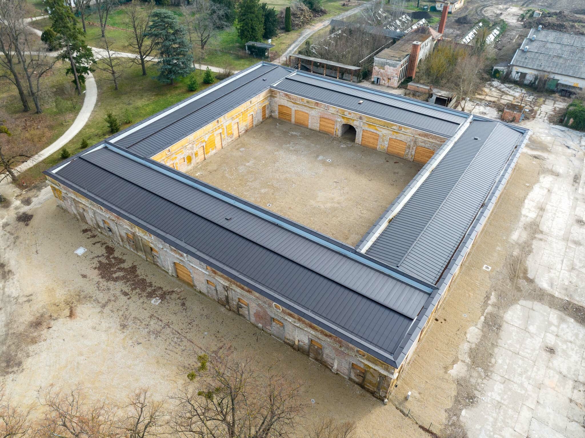 Lévai Imre elmondta, a kivitelezés során elvégezték a tetőszerkezet teljes cseréjét, a fedéssel együtt. Továbbá visszaállították az istálló nyílásainak eredeti osztását. A szabadon álló épület egy téglalap alaprajzú 41x 37,3 méteres belső udvart ölel körül. Az istálló homlokzataihoz, főként a déli részhez utólag kisebb épületeket illesztettek. Ezeket az eredeti épület megőrzése érdekében elbontották. A főfalak maradtak eredetiként, a homlokzaton végig futó zárópárkányt újraépítették.