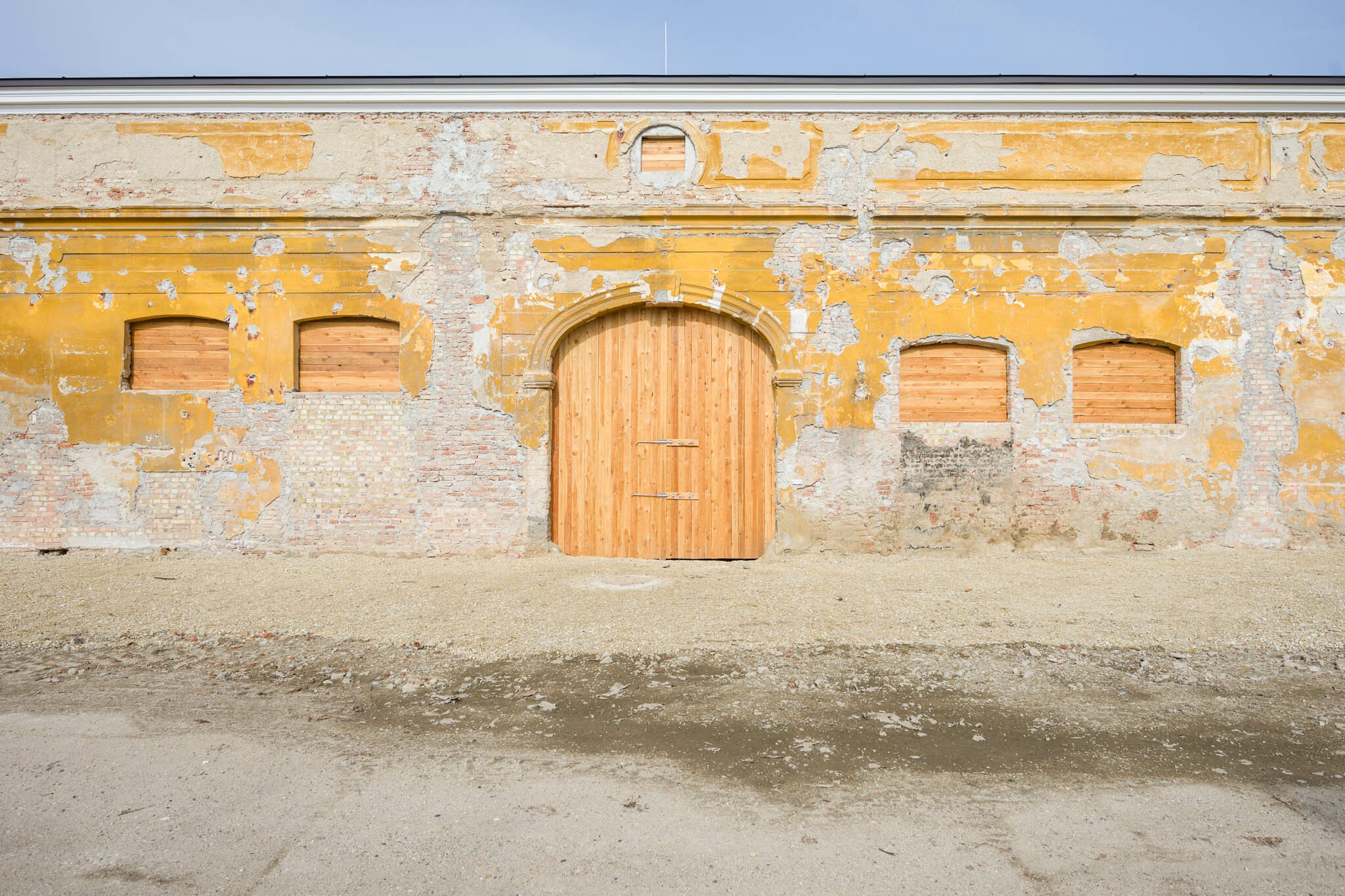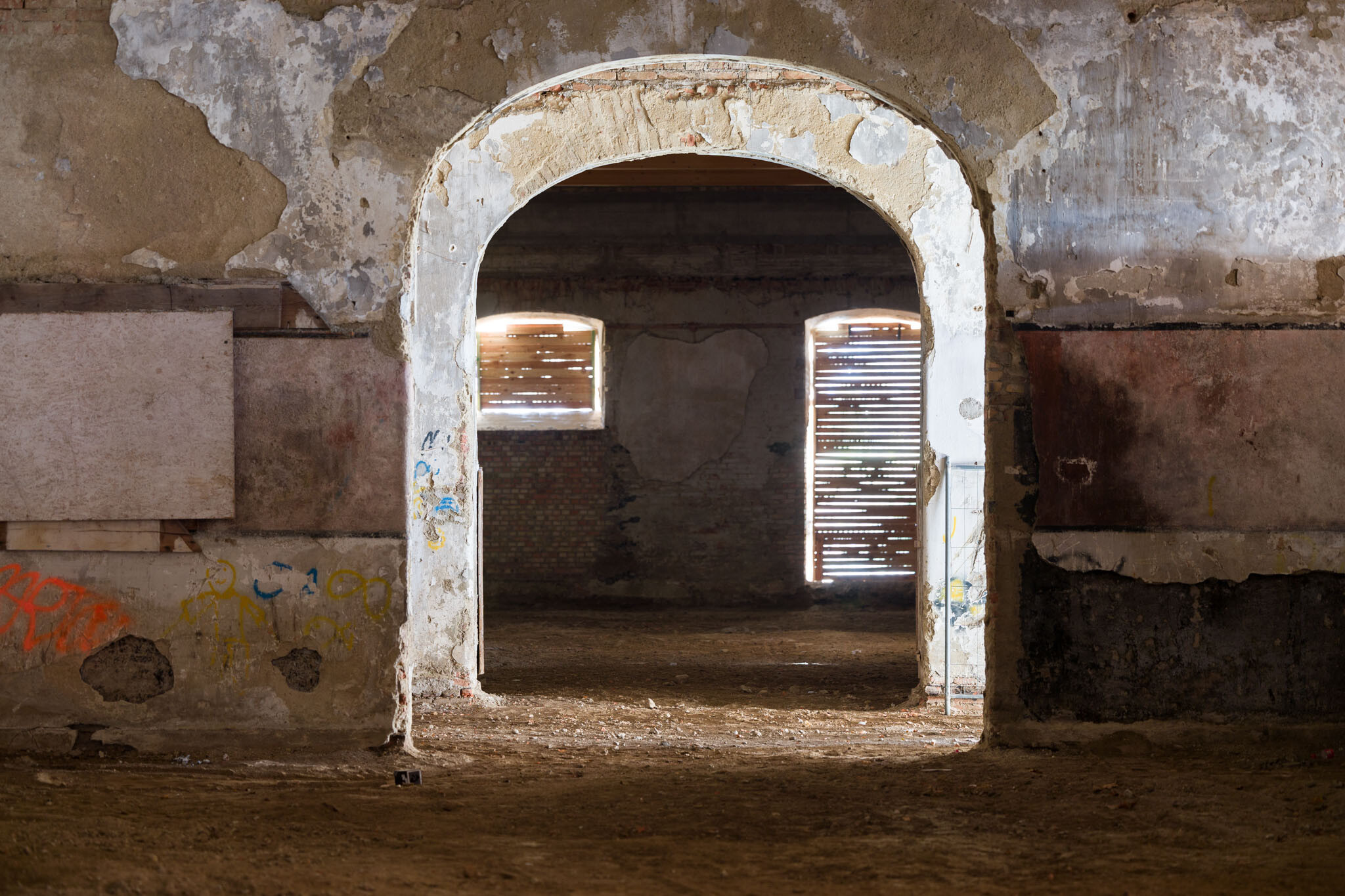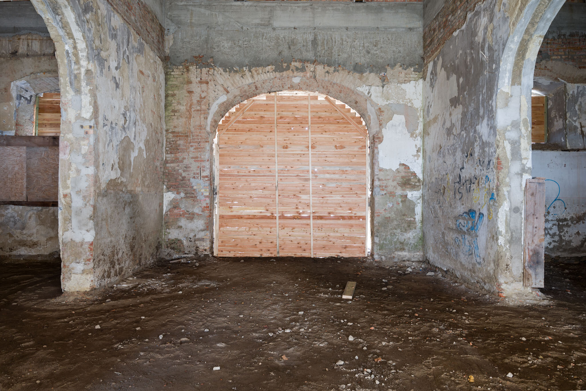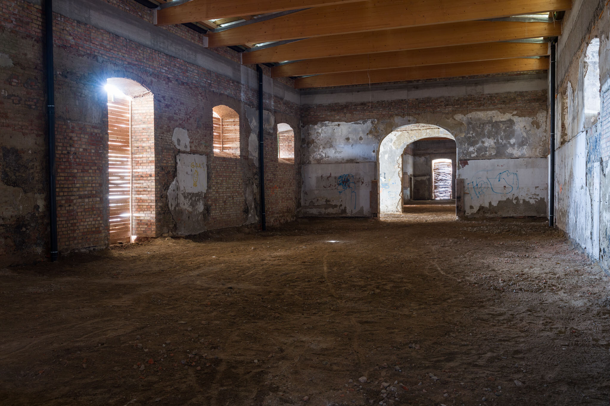A bontás érintette a számos helyen többrétegű beton aljzatot is, valamint a nyugati épületszárny déli részében lévő mély savanyító vasbetonkádakat is. Utóbbiak annak emlékei, hogy a rendszerváltás előtt konzervgyár működött az épületben. A kivitelezés során megőrizték az eredeti kőlábazatokat, de az utólagos burkolatokat eltávolították. Az északi szárnyban a falakat tardosi vörös mészkővel fedték, amelyet megőriztek.
