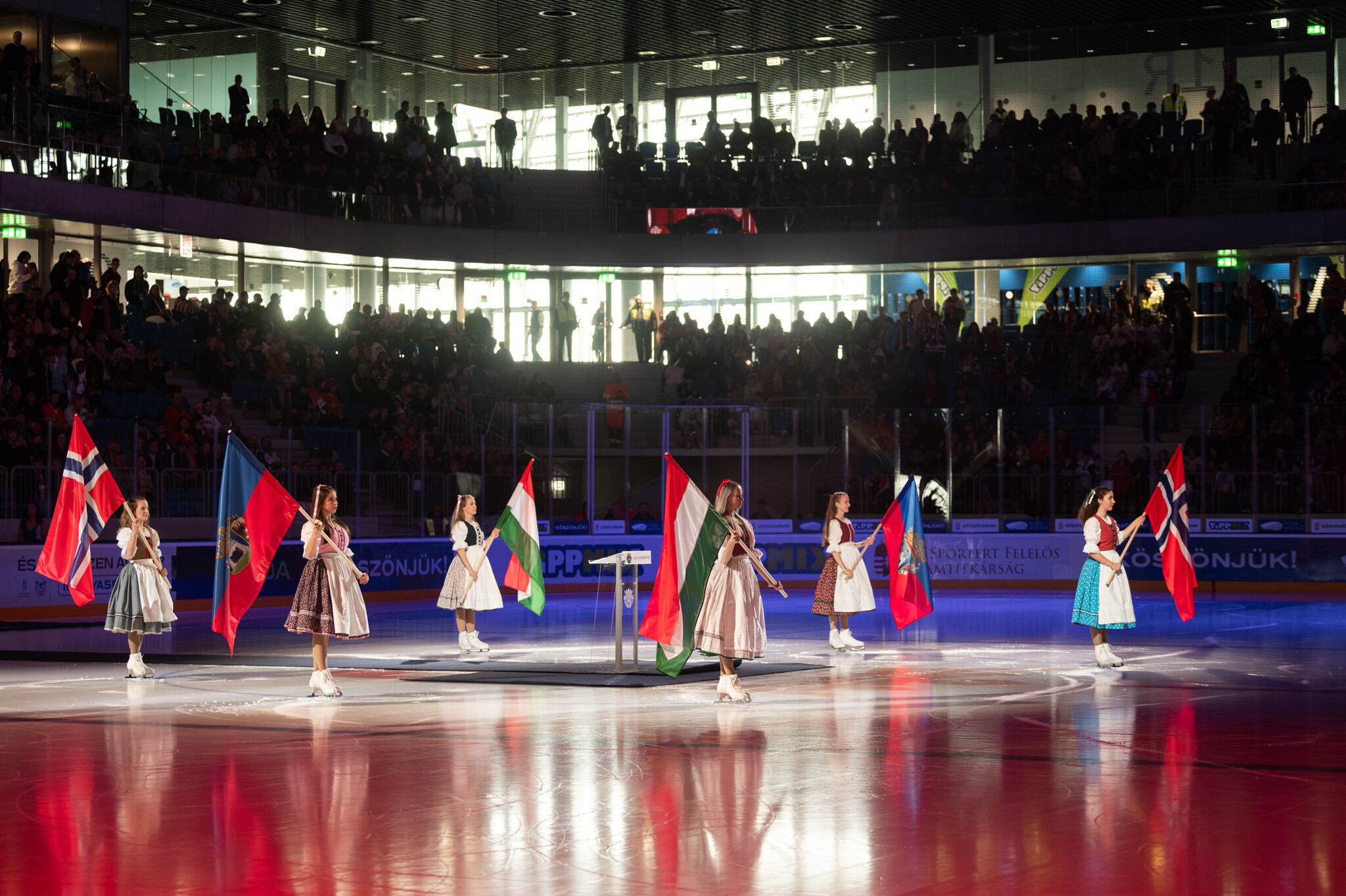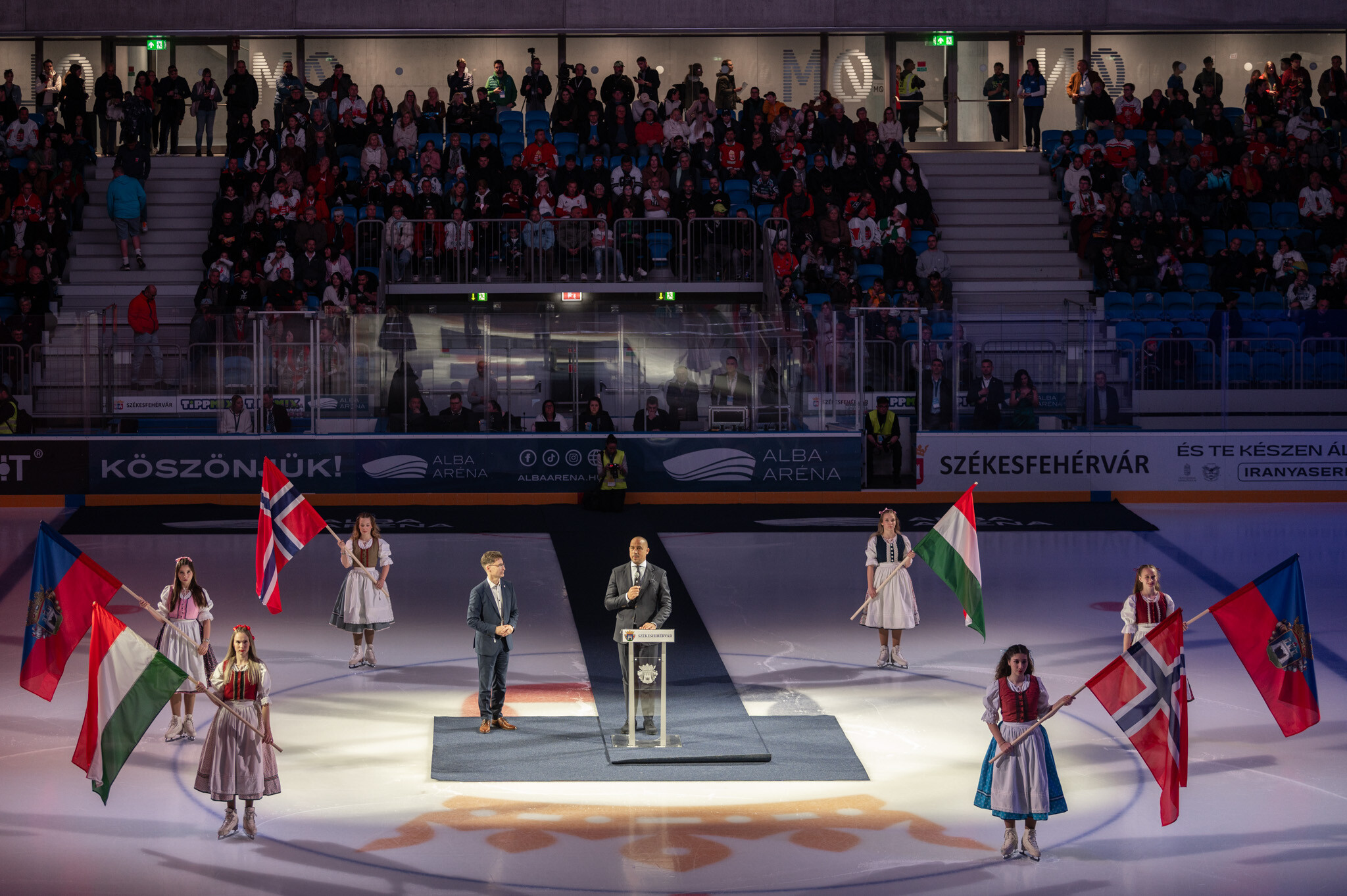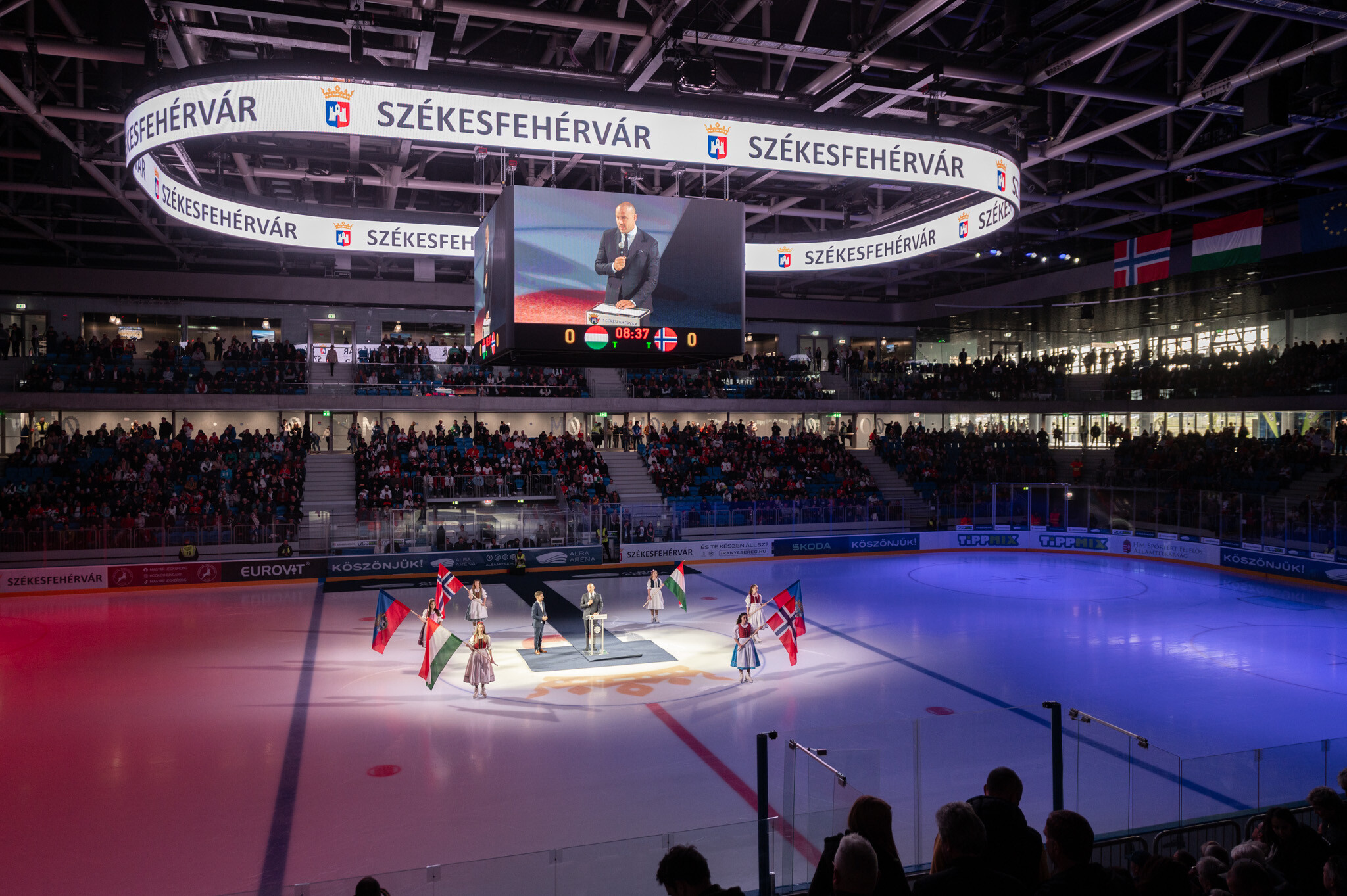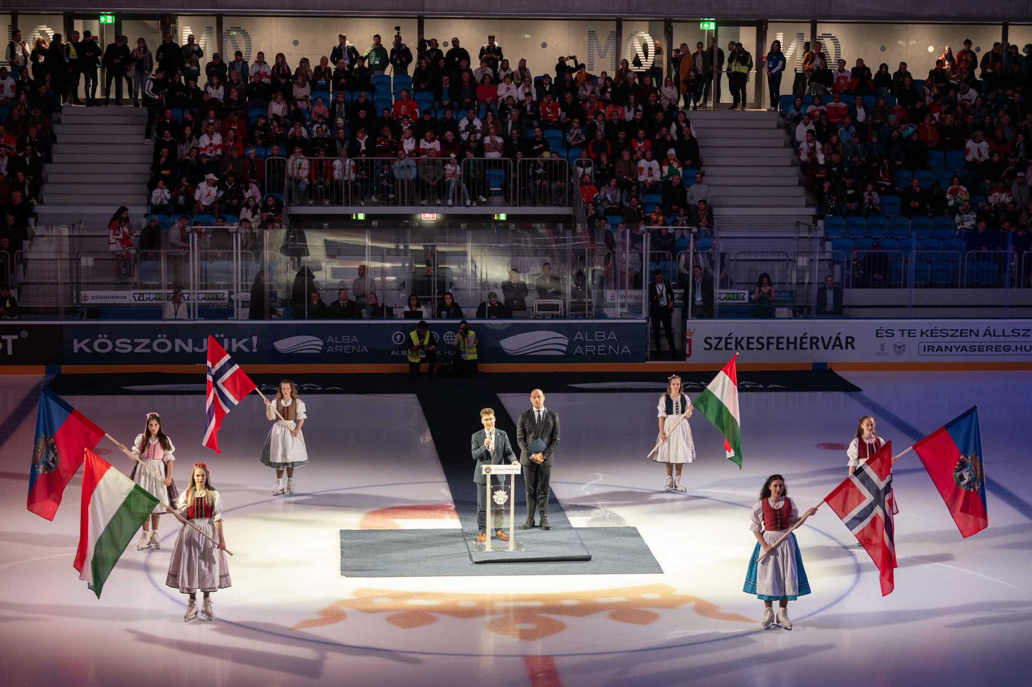 Az ünnepélyes megnyitón Cser-Palkovics András polgármester mindenkinek köszönetet mondott, akik az elmúlt években hozzájárultak az új aréna felépítéséhez és átadásához. Schmidt Ádám sportért felelős államtitkár beszédében kiemelte id. Ocskay Gábor hitvallását, hogy milyen sokat tett a fehérvári jégkorong felvirágoztatásáért, és munkássága révén álom vált valóra, a csapat magyar bajnoki címeket szerzett, nemzetközi szereplések részese, és most, 16 évvel a szapporói hősök feljutása után ebben a gyönyörű létesítményben játszhat a válogatott.