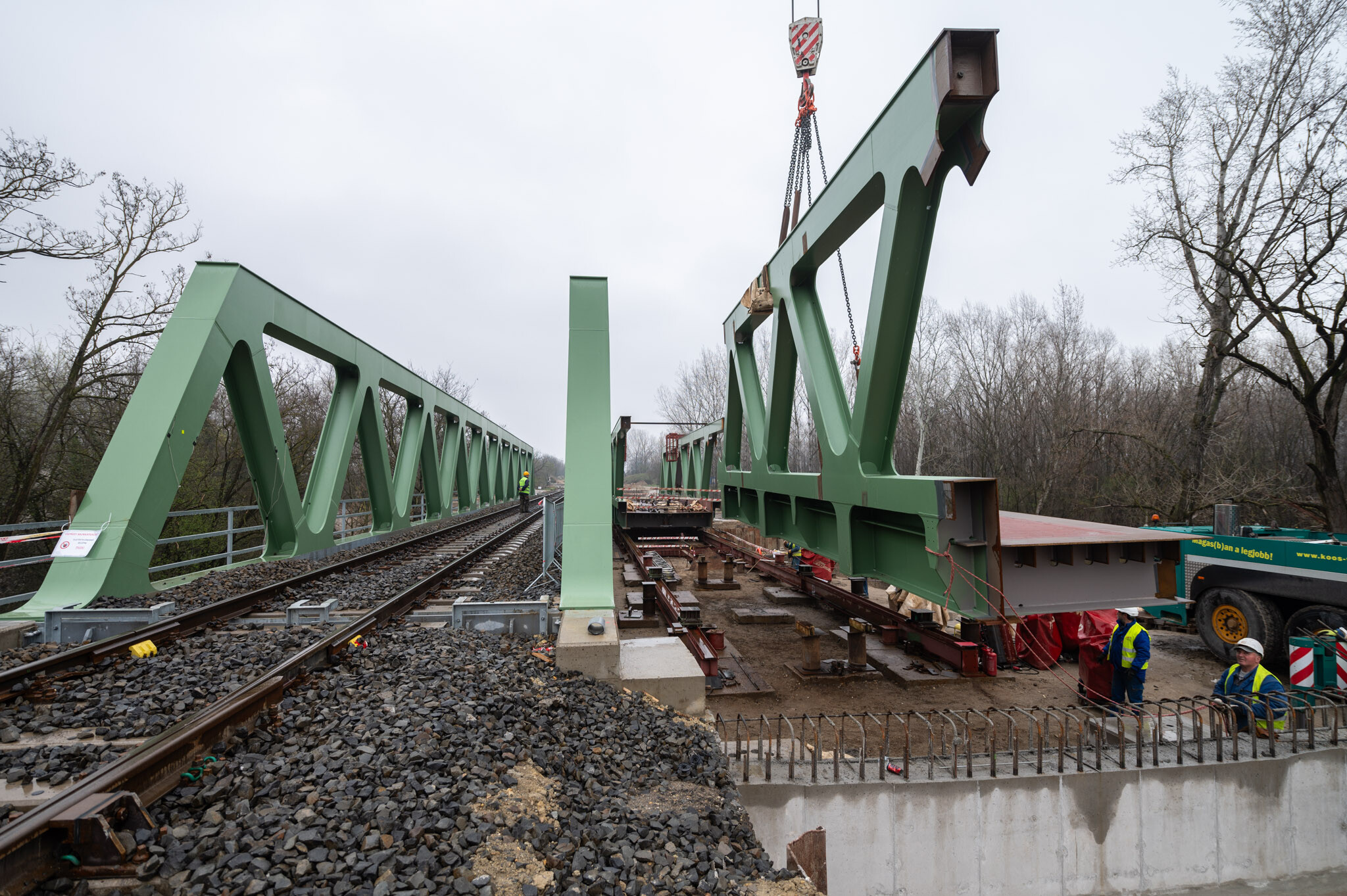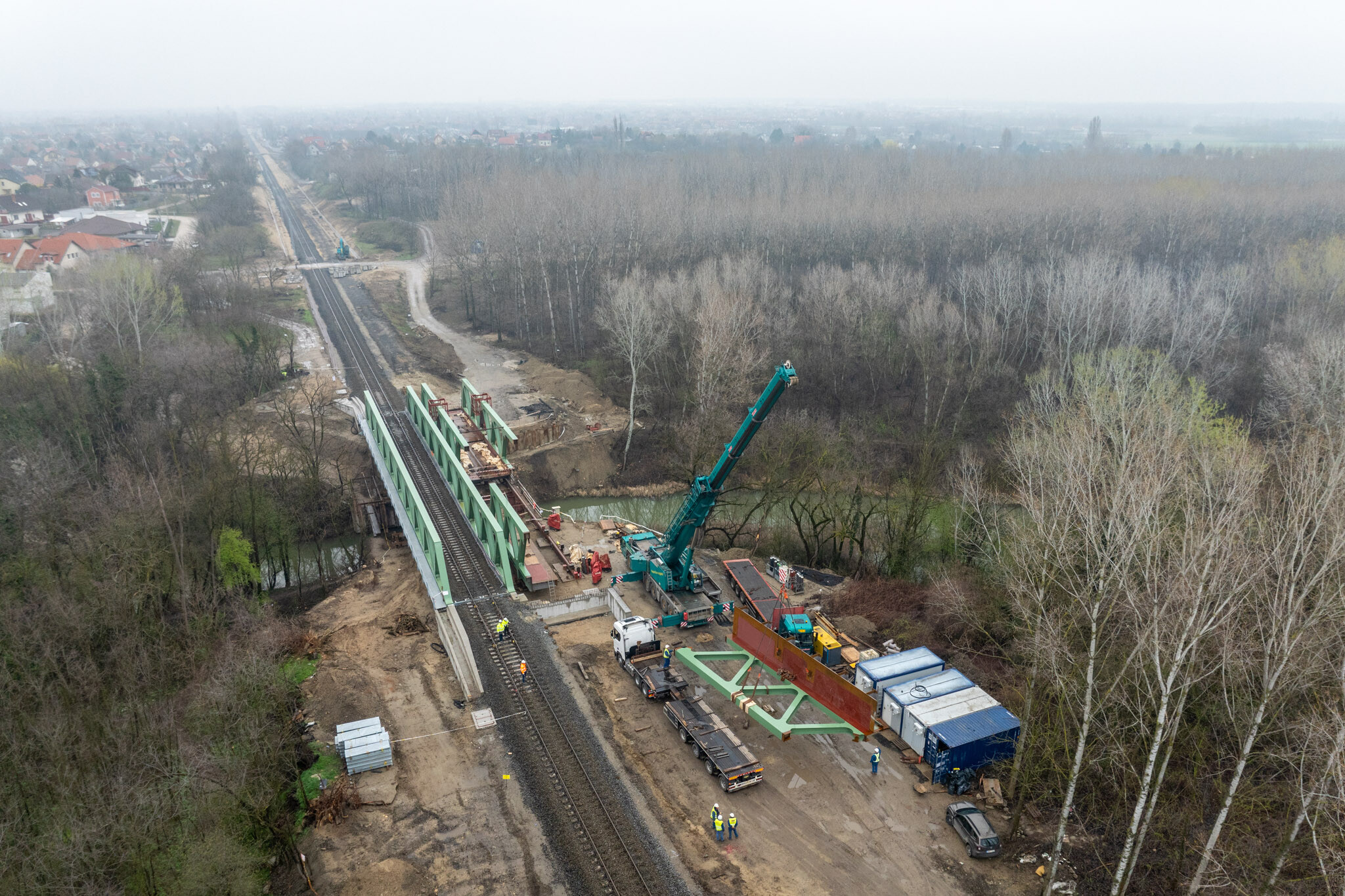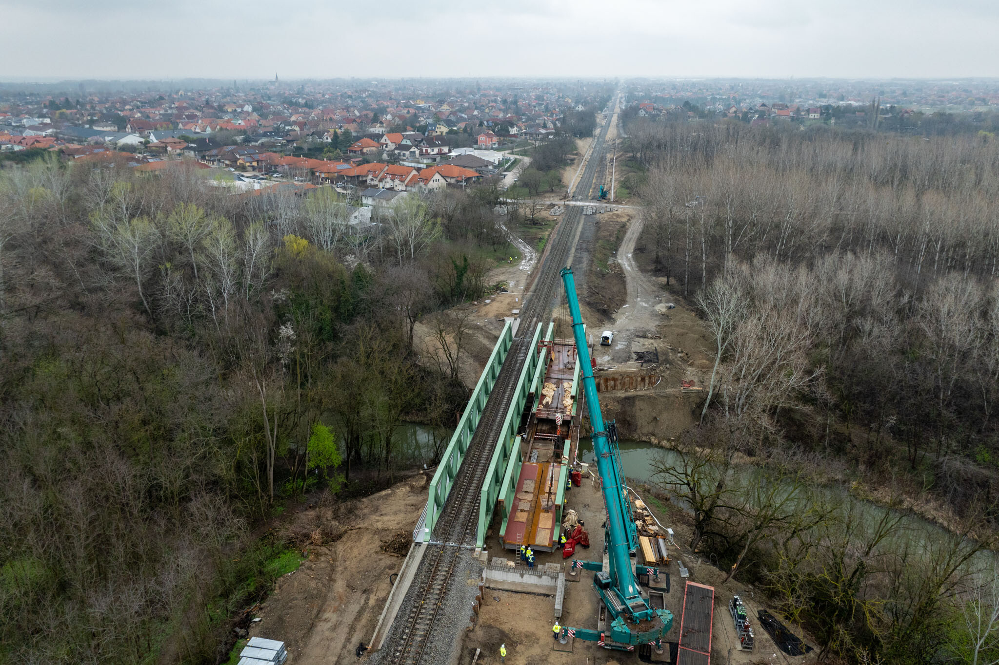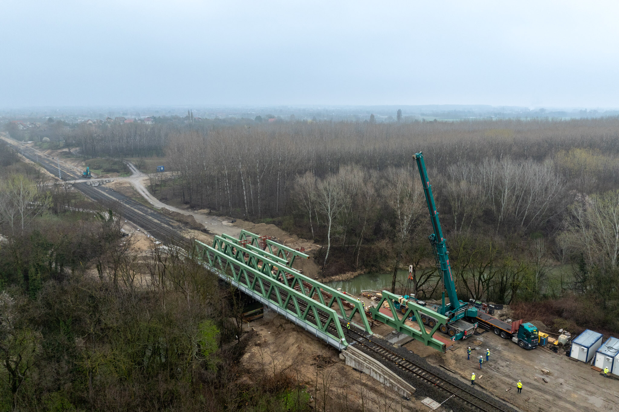A Duna-Tisza-csatorna fölé új, kétvágányos vasúti hidat épít a CTEC Kft. megbízásából a Colas Út Zrt. A tervek szerint április elején a bal vágány 52 méter hosszú szerkezetének utolsó elemei is a helyére kerülnek.