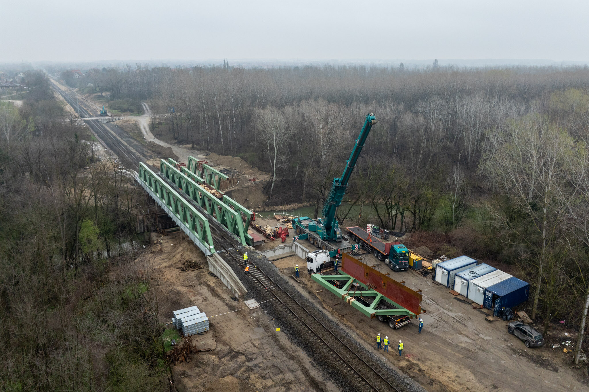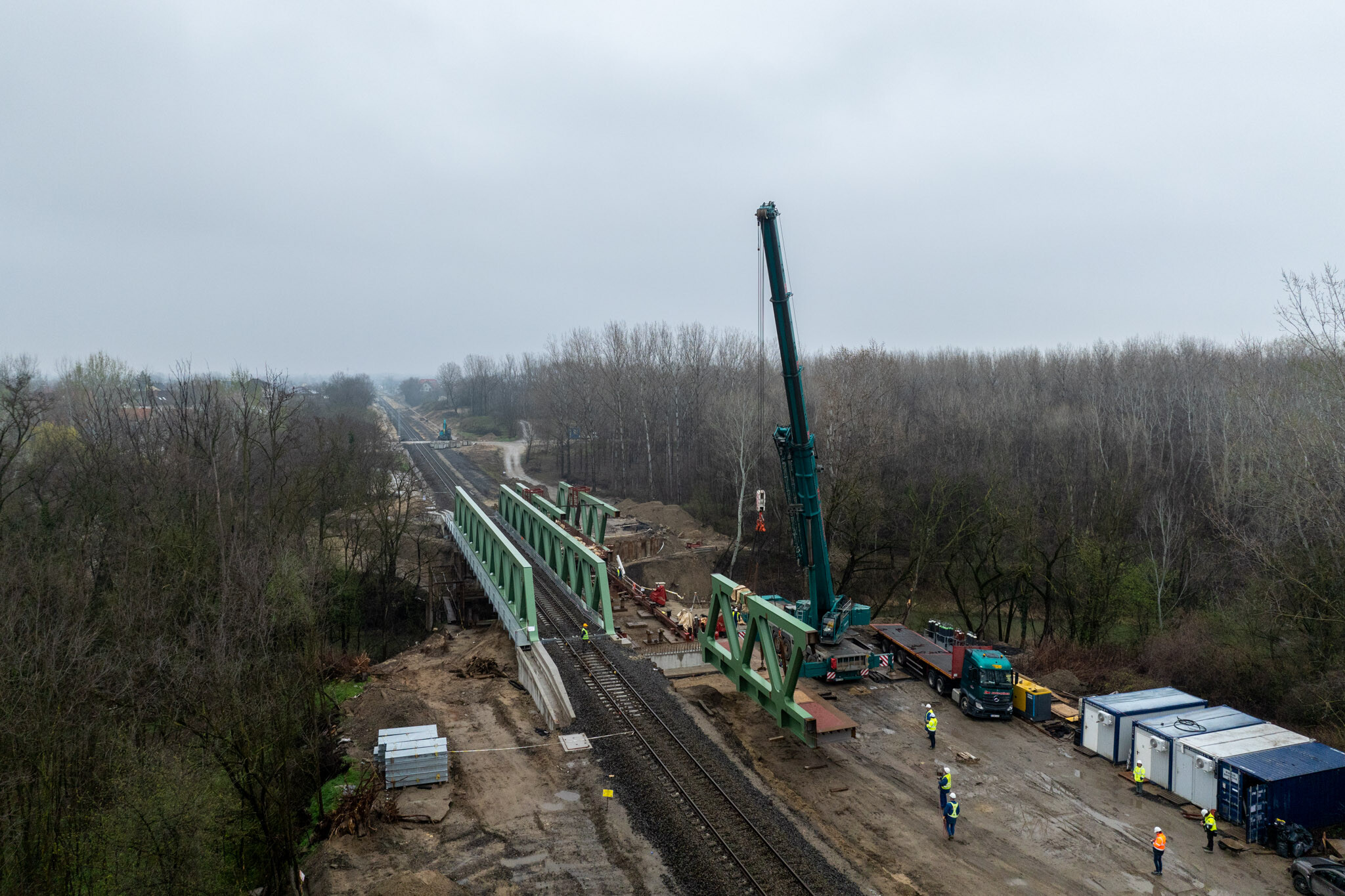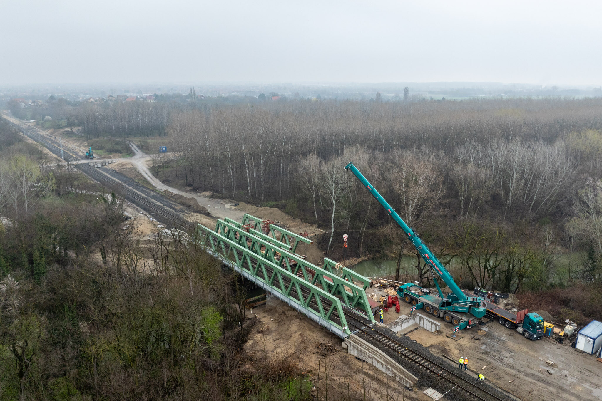 A Duna-Tisza-csatorna fölé új, kétvágányos vasúti hidat épít a CTEC Kft. megbízásából a Colas Út Zrt. A tervek szerint április elején a bal vágány 52 méter hosszú szerkezetének utolsó elemei is a helyére kerülnek.