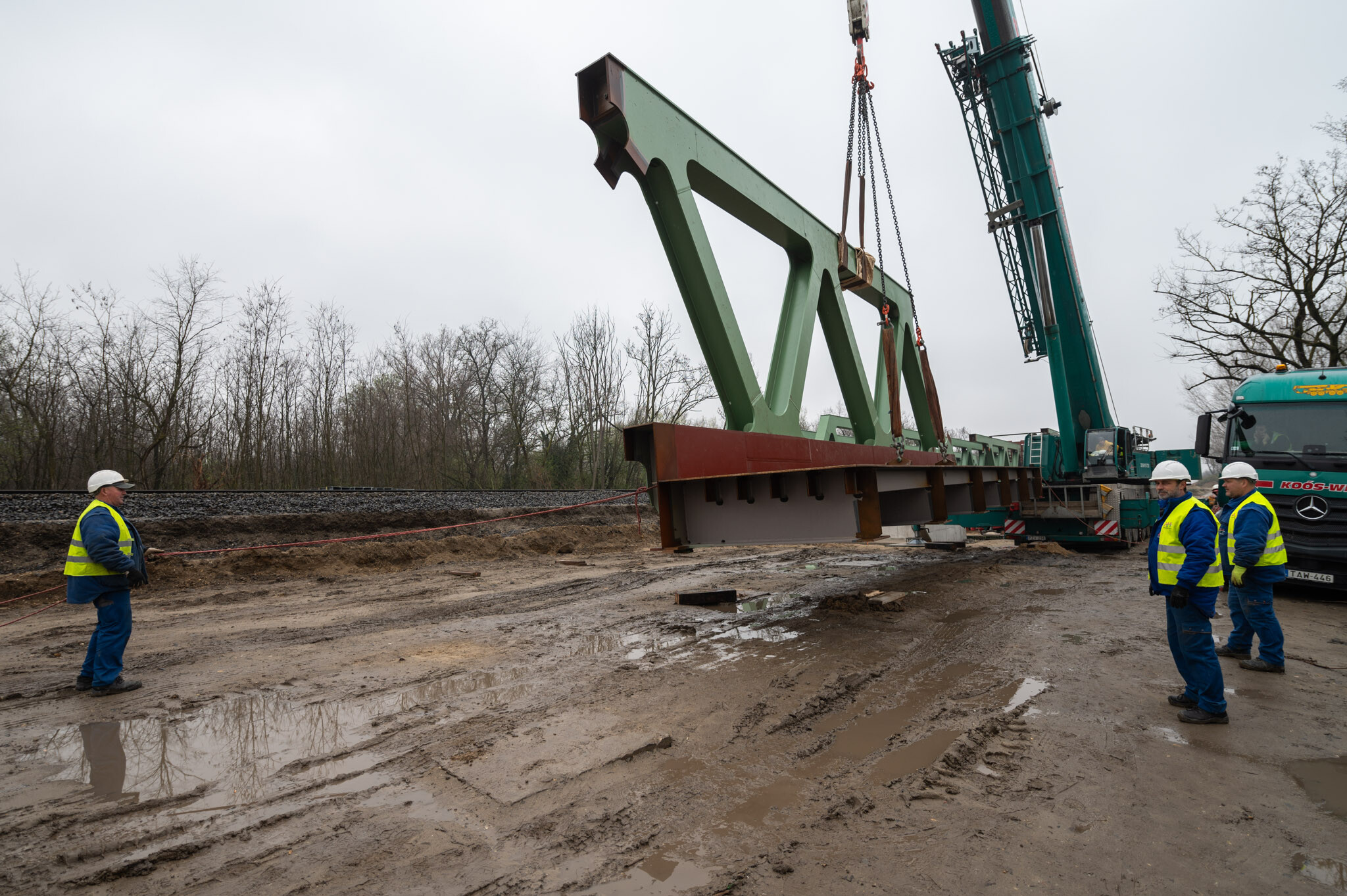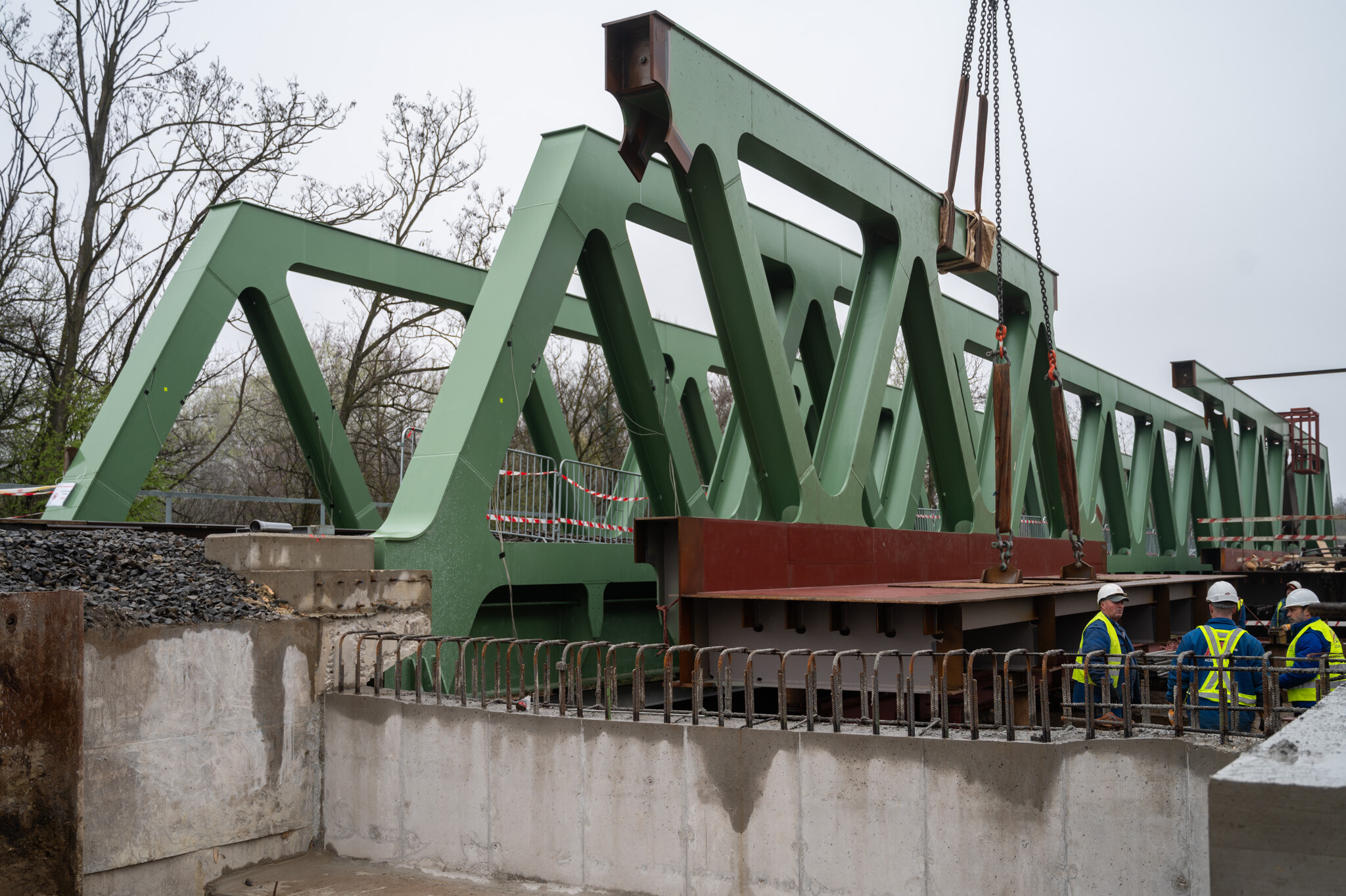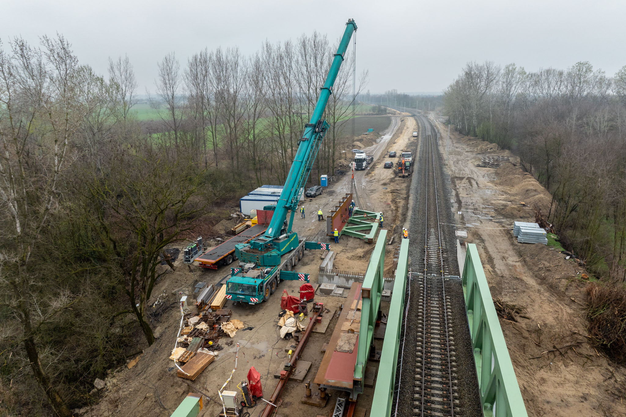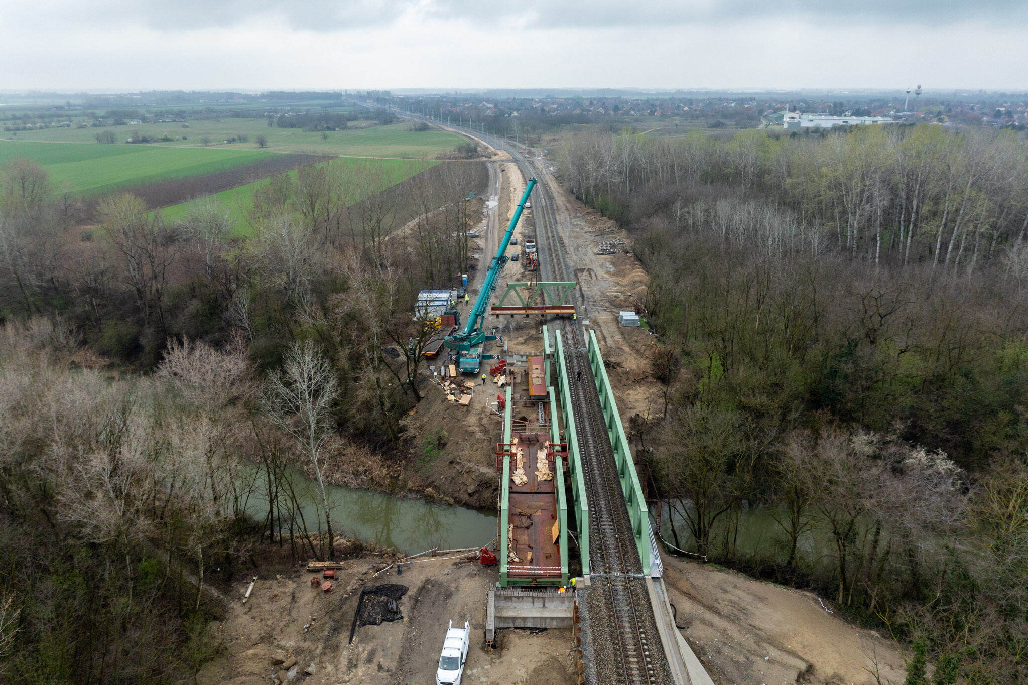 A Duna-Tisza-csatorna fölé új, kétvágányos vasúti hidat épít a CTEC Kft. megbízásából a Colas Út Zrt. A tervek szerint április elején a bal vágány 52 méter hosszú szerkezetének utolsó elemei is a helyére kerülnek.