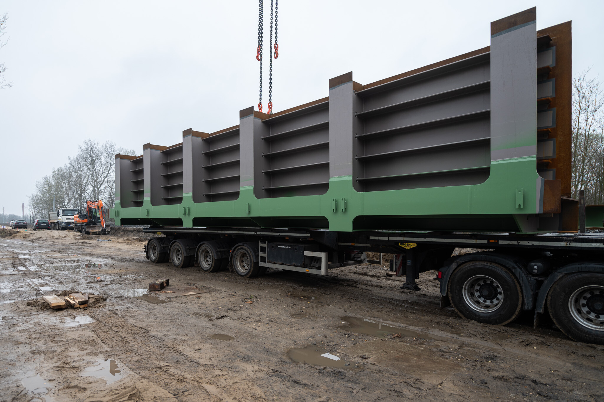 Az 5,8 méter széles, egyenként 31-33 tonna súlyú acélszerkezeti elemeket, túlméretes szállítmányként nyolc fuvarral, kamionokra fektetve juttatják el a munkaterületre.