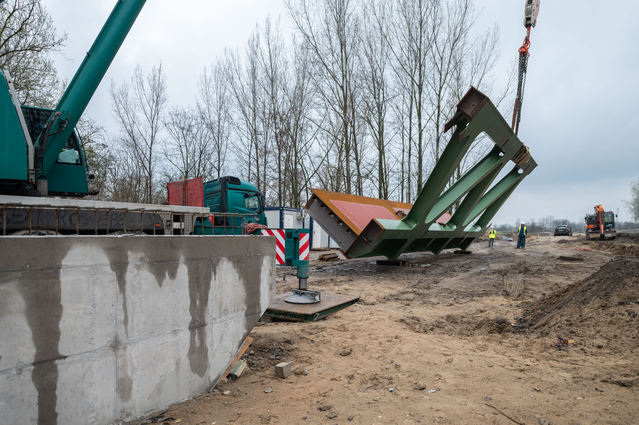 A hídelemeket a helyszínen egy 250 tonnás daru veszi le a kamionról. A szerelvényeket felállítják a beemelés előtt, majd a szerelőtér fogadó oldalán kialakított forgató paddal a beépítési pozícióba igazítják. Ezután a daru a hídelemeket egy olyan szerelőpadra helyezi, ami egy tolópályával folytatódik.