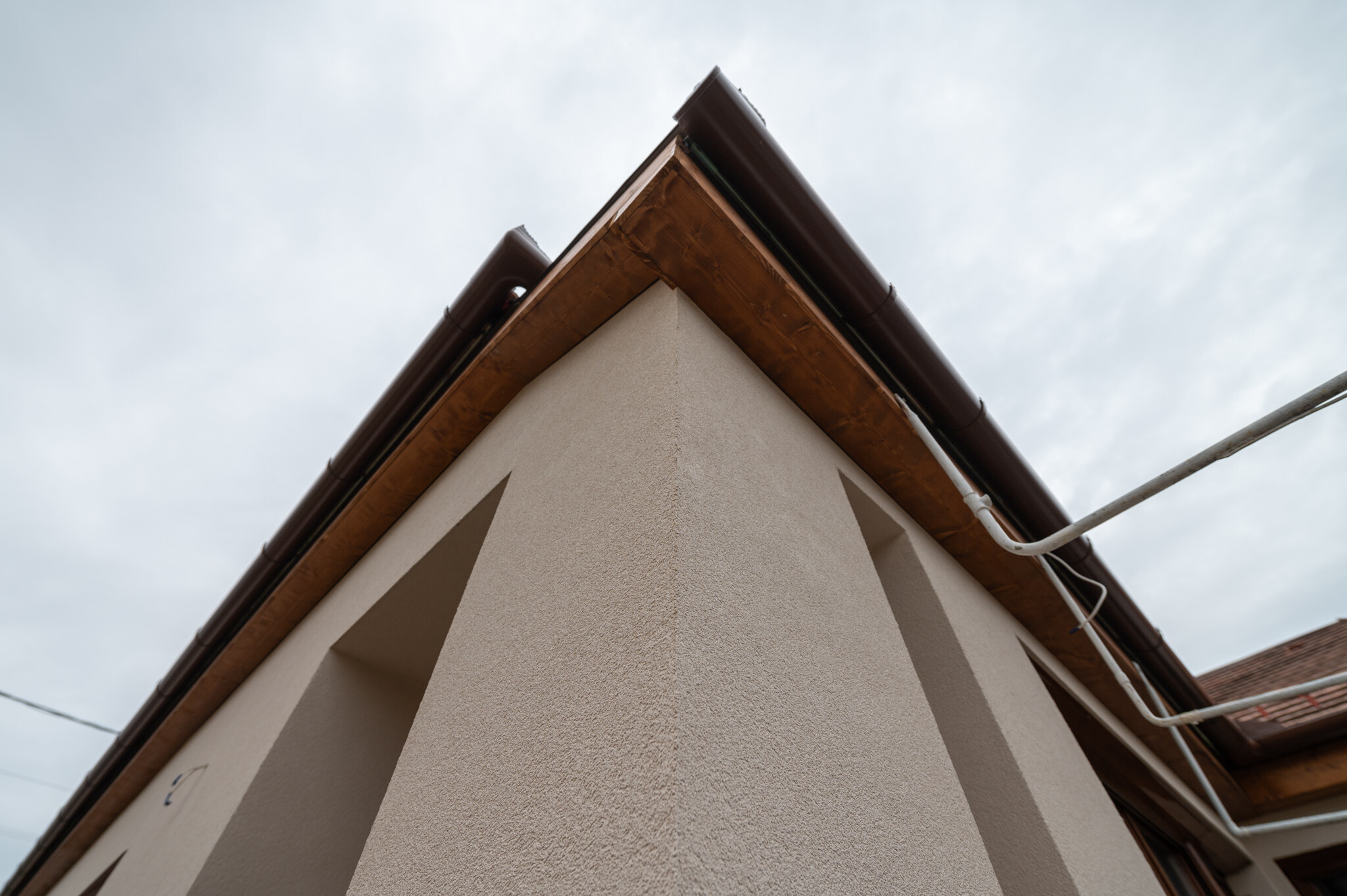 Alapigényként támasztotta tehát a megrendelő az organikus építés mellett a ház modern, városias megjelenését is, ahol fontos szempont volt a falazat kiváló páraáteresztése. Így esett a választás a Cemix Thermosystem mineral homlokzati hőszigetelőrendszerére, amivel