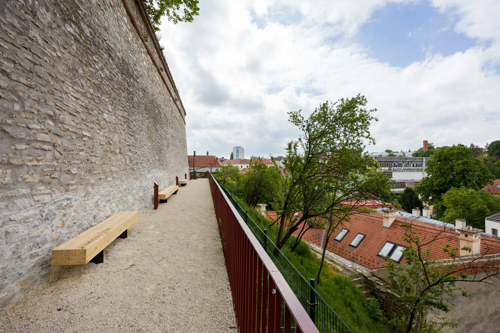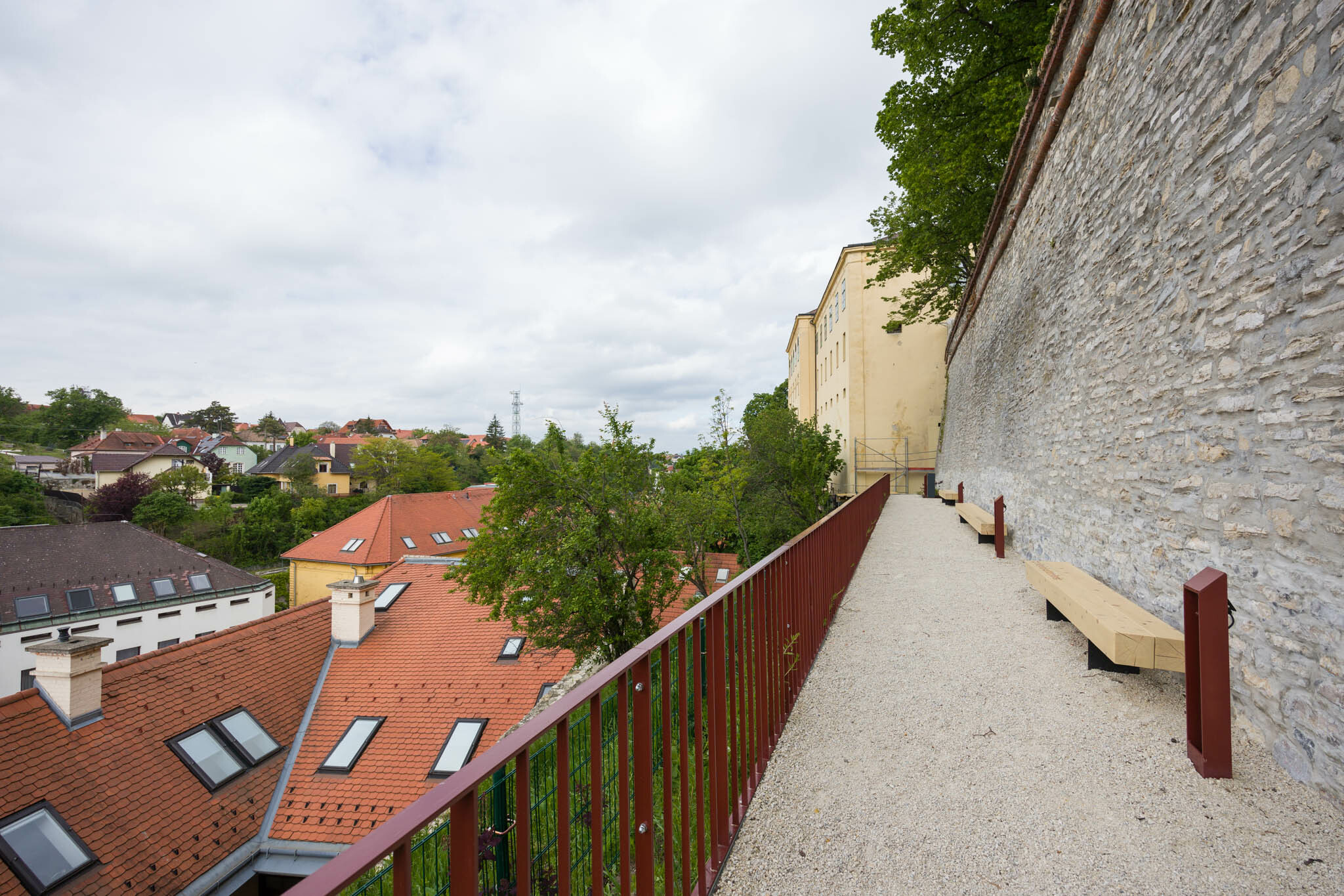 Harmadik szakasznak tekinthető a kiállítási útvonal végén, az épület délkeleti oldalán nyitott ajtón keresztül elérhető várfalsétány bejárása. A sétány egyszerű, acél lépcsősor, murvaborítású gyalogos felület, végén egy nyitott vasbeton lépcsőtérrel. Itt haladva még tehetünk egy pillantást a régi várfalra és a városrészre.