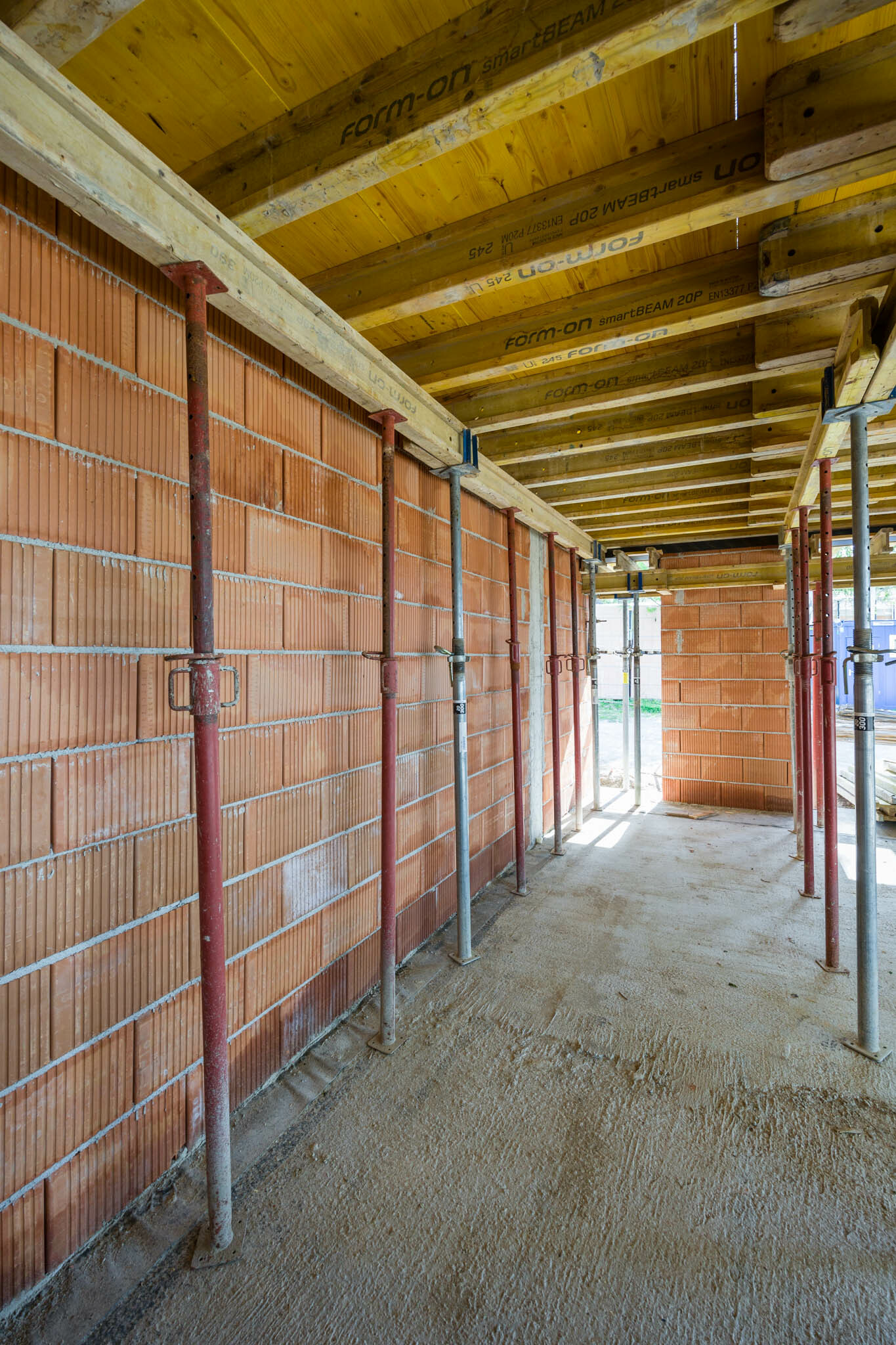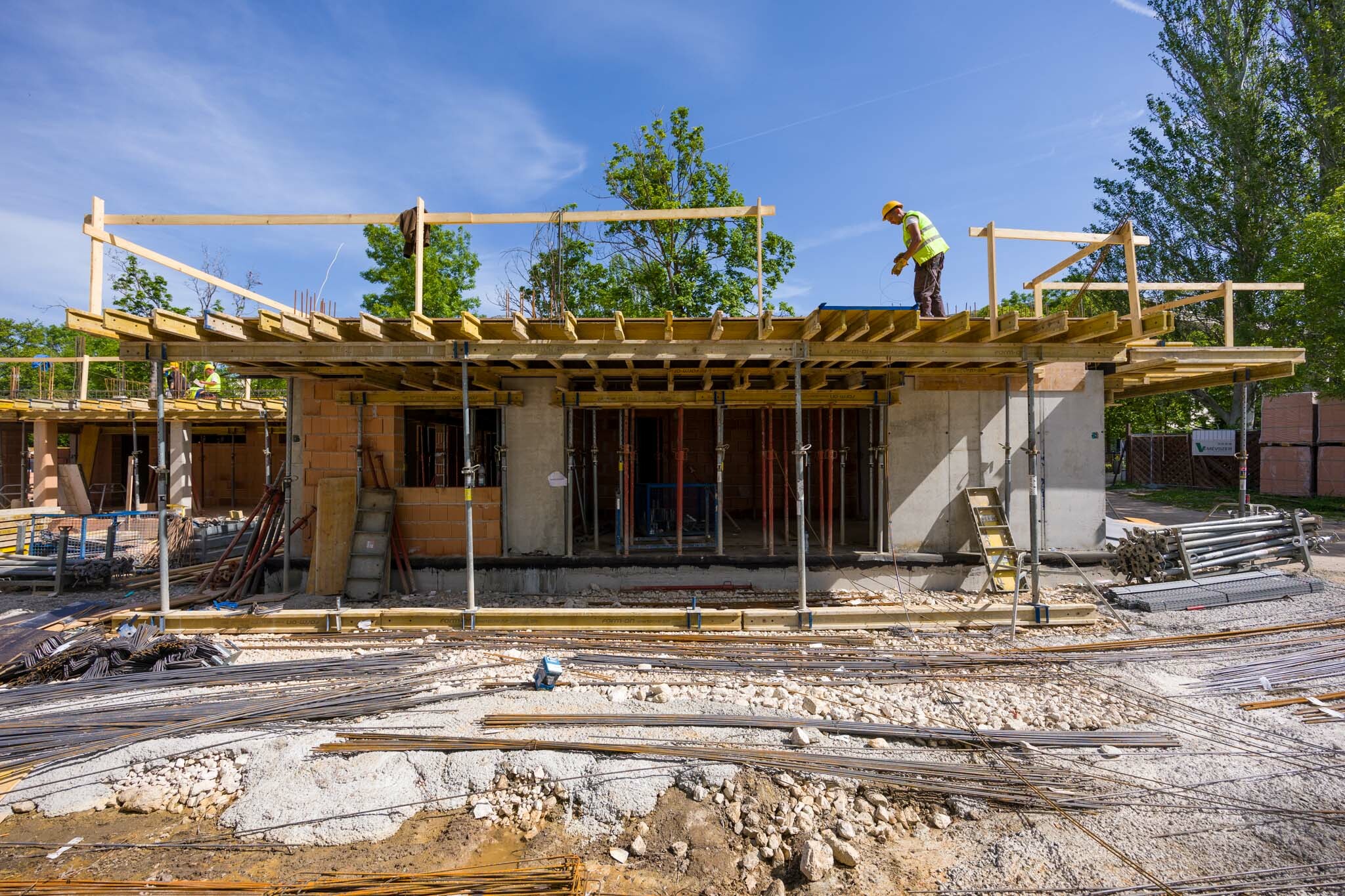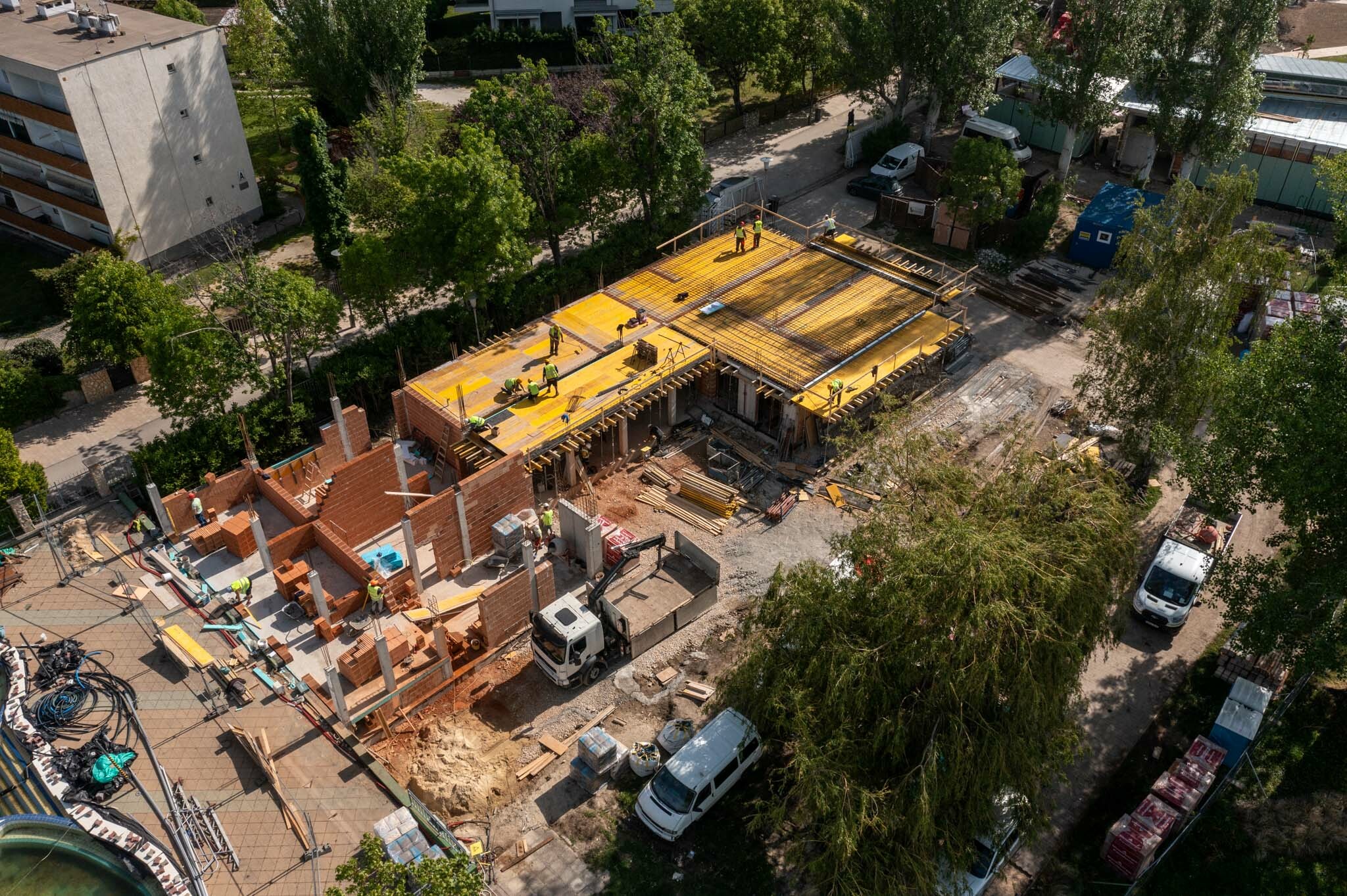„a nyugati szárny emeleti vasbeton szerkezeteinek (pillérek és falak) betonozási és a szerkezeti kerámia falak falazási munkái is folyamatban vannak. Elindult a keleti szárny földszinti válaszfalak falazása és a villamos alapszerelés is.”