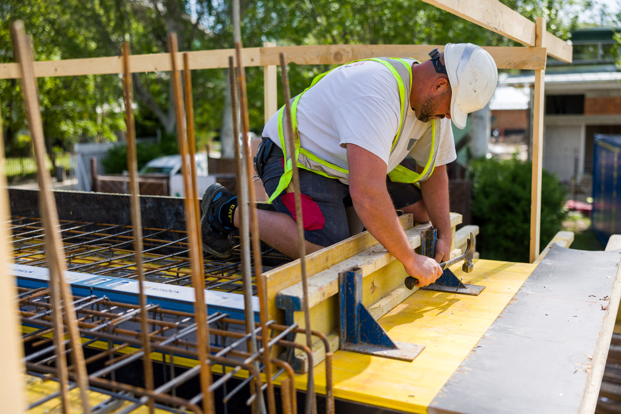 „Ez a mi esetünkben is így volt – mesélte György István. A szerkezetépítési szint alatt már 10-15 cm-re talajvíz áll, ezért a tömbalapok ásása és betonozása során folyamatosan szivattyúzni kellett a vizet az alaptestekből, hogy azok betonozhatók legyenek. A magas talajvíz a gépek mozgását is nehezítette, mivel folyamatosan sárban kellett dolgoznunk. Ilyen esetekben mindig sikerélmény ha ’kijövünk a földből’, vagyis megindul a talpgerendák és alaplemezek kivitelezése.”