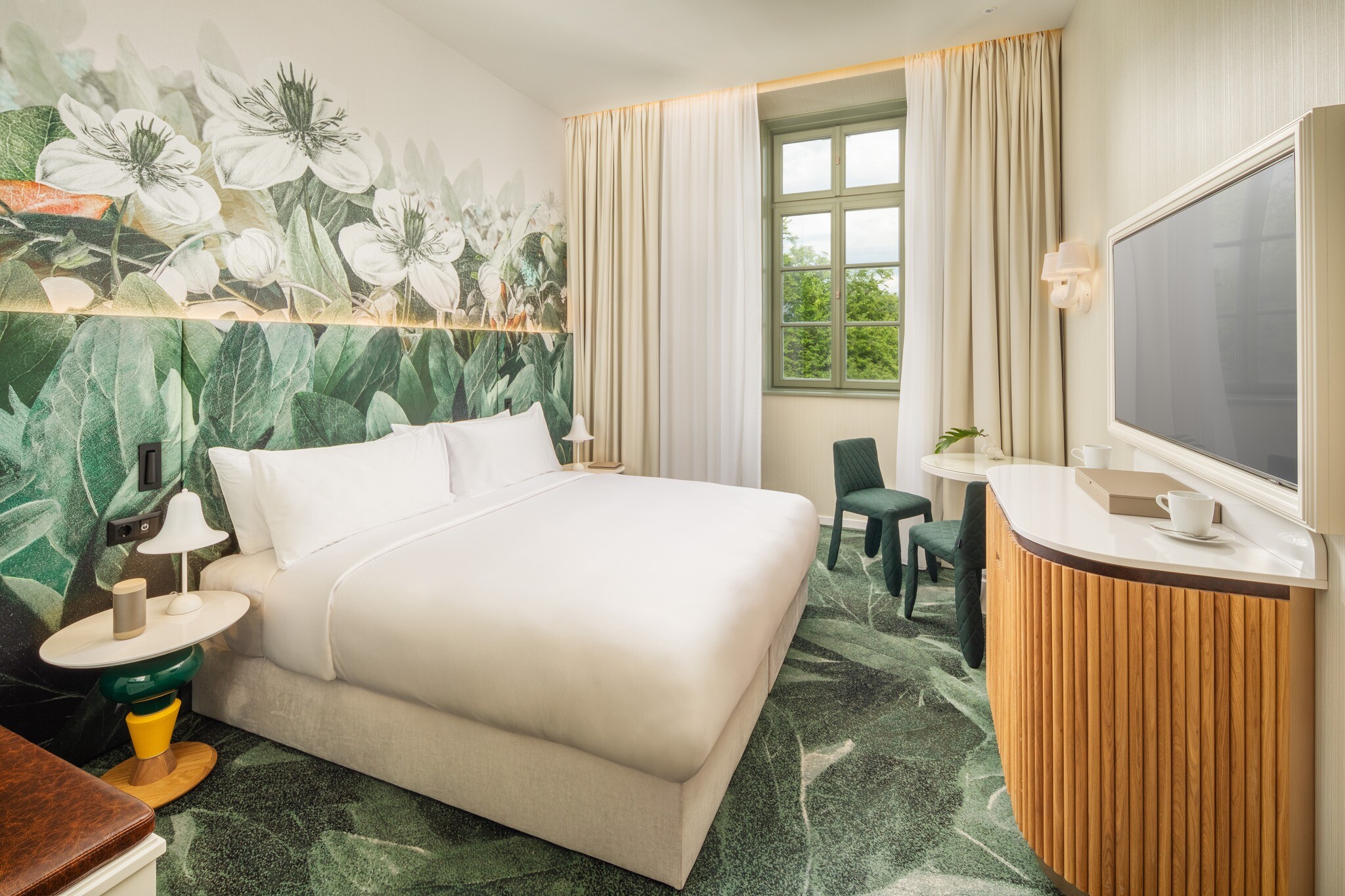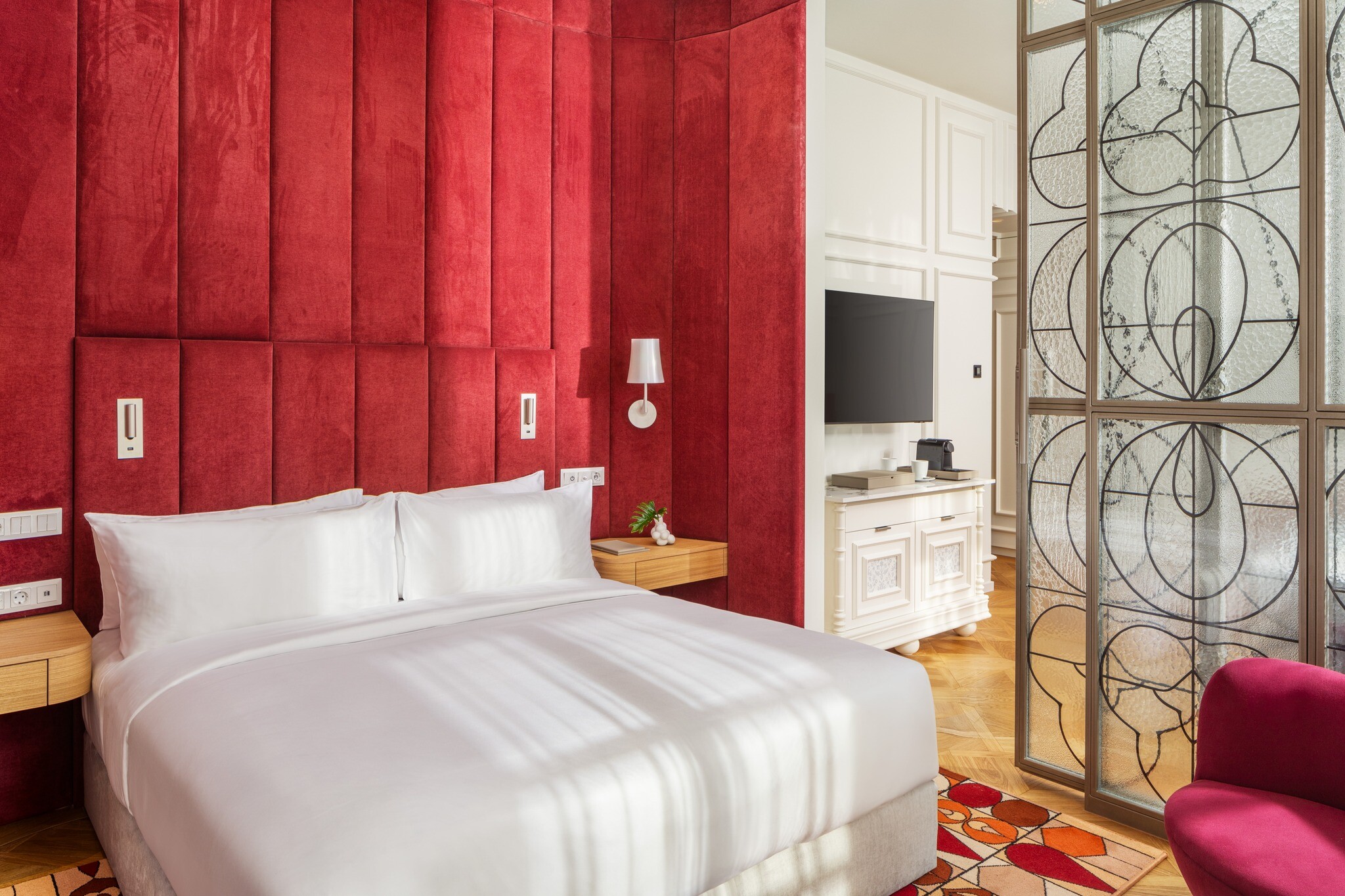 A butikhotelben 127 szoba került kialakításra, a design részben a közeli Duna-partra reflektál. Az 5. emeleti elnöki lakosztályokhoz 82 négyzetméteres privát tetőkert is tartozik.