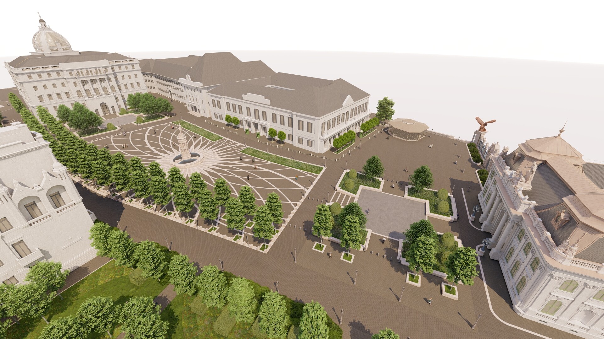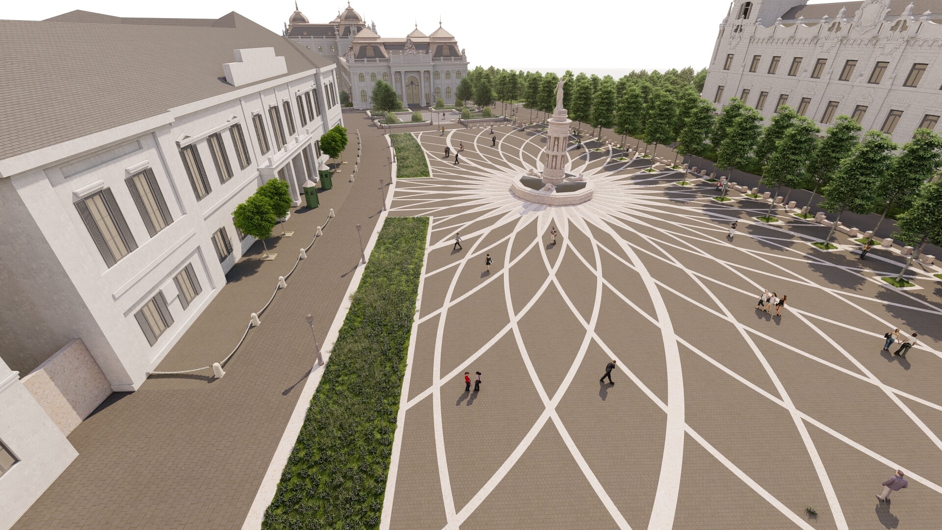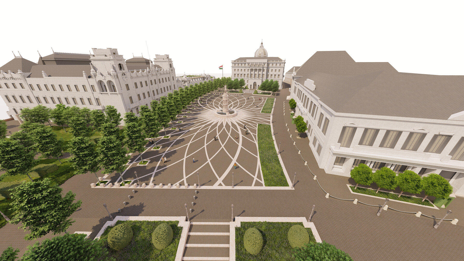 A zöldfelületeket harmonikus elrendezésben újítják meg, a növényzet a tér középső része helyett a széleken kap nagyobb hangsúlyt.