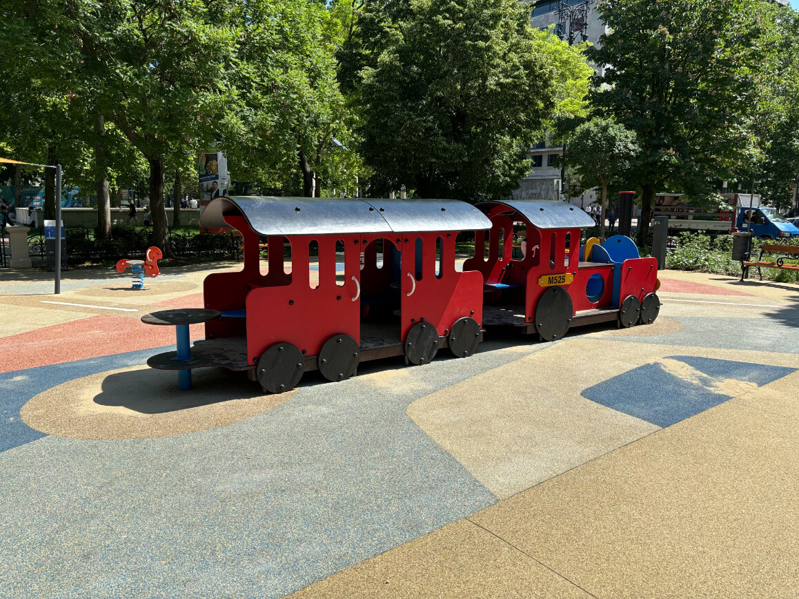Így a gyerekek már nemcsak a felújított kisvonaton, de egy csúszdával egybekötött kockaváron, 3 féle, több korosztálynak szóló hintán (babahinta, laphinta és fészekhinta), forgó játszóelemeken, trambulinon, egy speciálisan kialakított, akadálymentes homokozóban is játszhatnak, amelynél az újrahasznosítás jegyében a korábbi játszótéri gumiburkolatot szintén felhasználták.