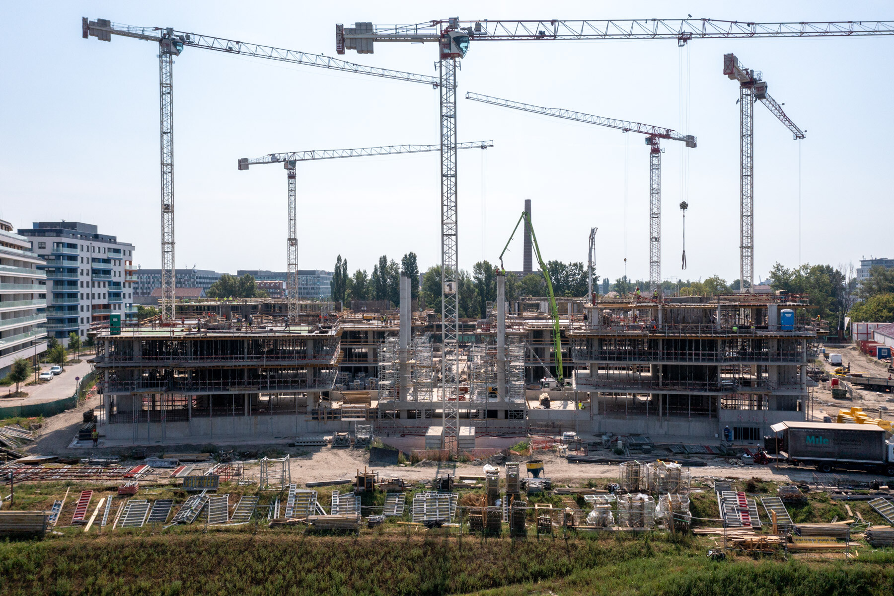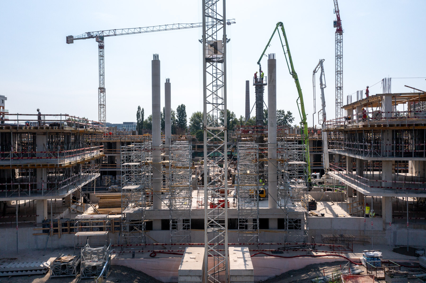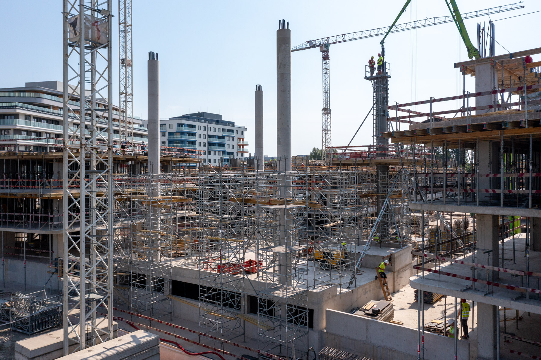 Nyolc lépcsőház került a pince, földszint és kilenc emelet magas épületekbe, amelyek szintterülete 74.500 m2, hasznos alapterülete pedig 37.200 m2. A kivitelező DVM januárban vette át a munkaterületet, átadása pedig 2026 júliusában várható. Négy hatalmas pillér is része az épületegyüttesnek