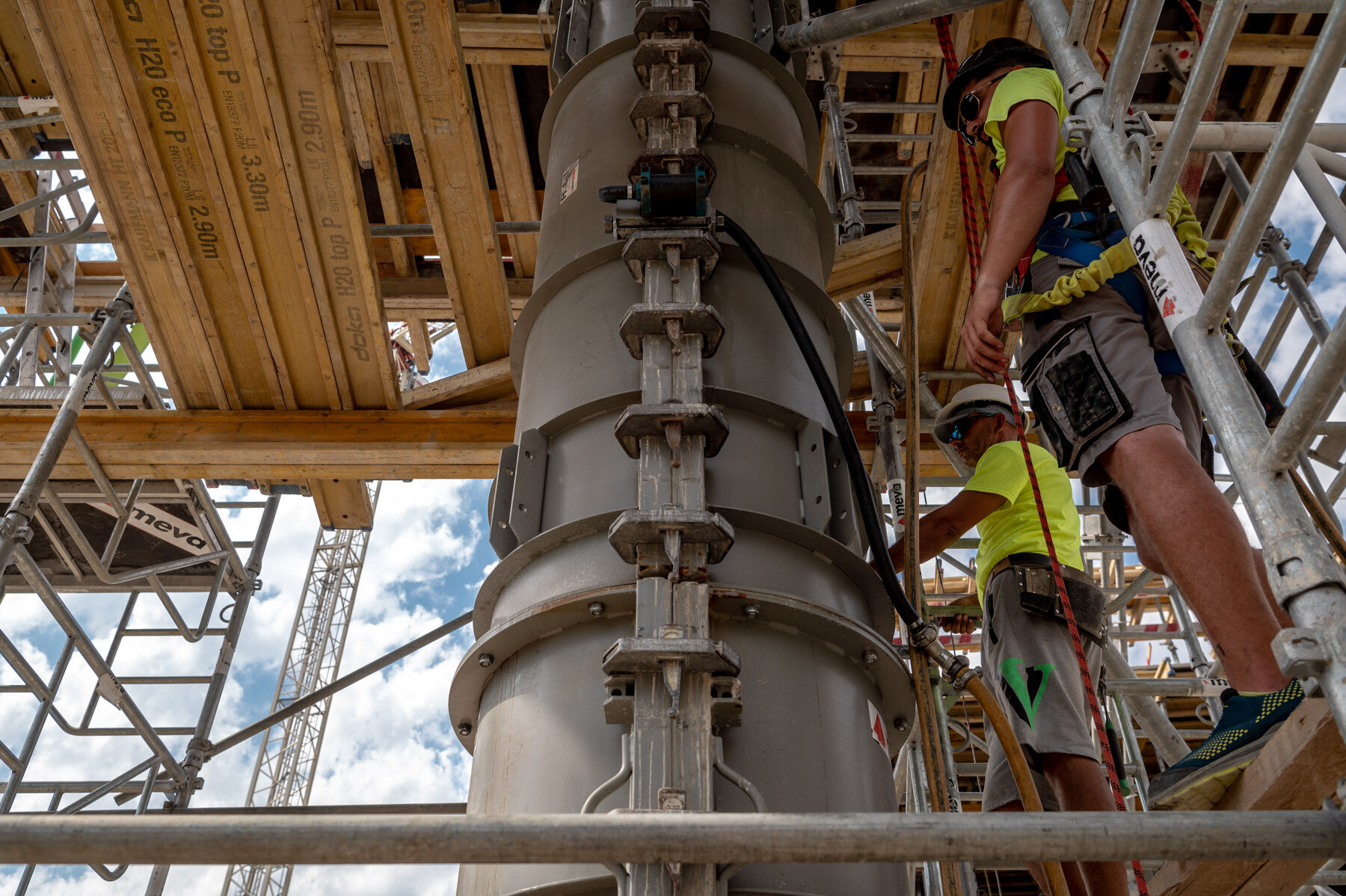 „Egyenként 80 centiméter átmérőjű és 15 méter magas körpillért kellett emelni a kapu megnyitásához, amelyhez igazi kihívásként ugyanebben a magasságban egy 550 m2 felületű, alulbordás födém kivitelezése is társult” – összegezte a projekt legérdekesebb részeit Lachmann Botond, a MEVA Zsalurendszerek Zrt. főmérnöke.