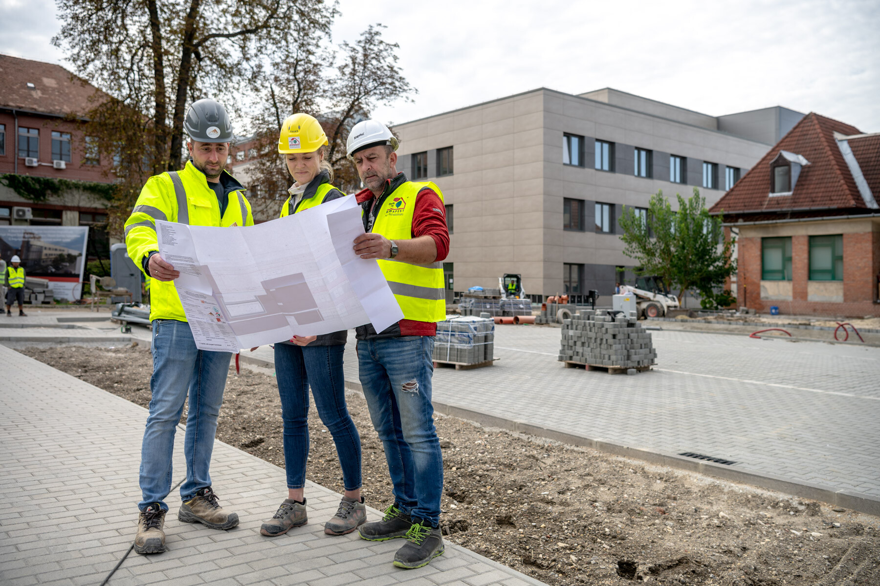 Az összekötő folyosó felújítása folyamatos betegforgalom biztosítása mellett a „C” és „DT” épület közötti szakaszának felújításával folytatódik. A végleges villamos bemérések után szeptember elejétől megkezdődnek a gépészeti és automatikai beüzemelések, beszabályozások – ismertette Cser Szabolcs. A durva piperetakarítás után indulhat a belső folyosói ütközők és fogódzok elhelyezése, míg kint folytatódik az út- és parképítés a járdák és útpályaszerkezetek kialakításával. Ezek megléte után a homlokzatburkolat alsó zárásának, az előtető bádogozásának befejezése, mentő bejáró oszlopainak és gerendájának homlokzatképzése teszi teljessé az épület végső kinézetét. Az út és járdaépítés után a növénytelepítés, fásítás és füvesítés zárja majd a projekt kivitelezési részét.