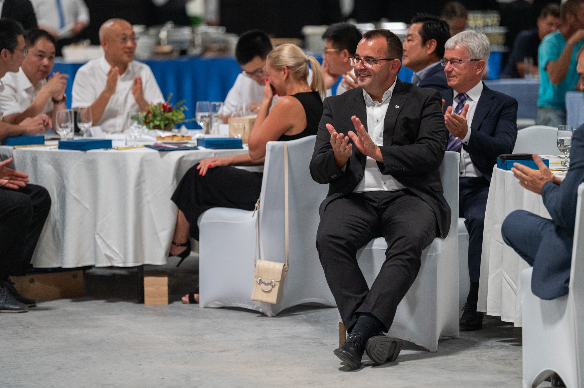 Többek között megköszönte az állam és a város közreműködését abban, meg tudjon valósulni a gyárépítés, valamint külön kiemelte, hogy a gyár gyors és zökkenőmentes építkezése nem történhetett volna meg a generálkivitelező MERKBAU és projektmenedzsment partnere, a DVM-Greenfield csapatának fantasztikus munkája nélkül.