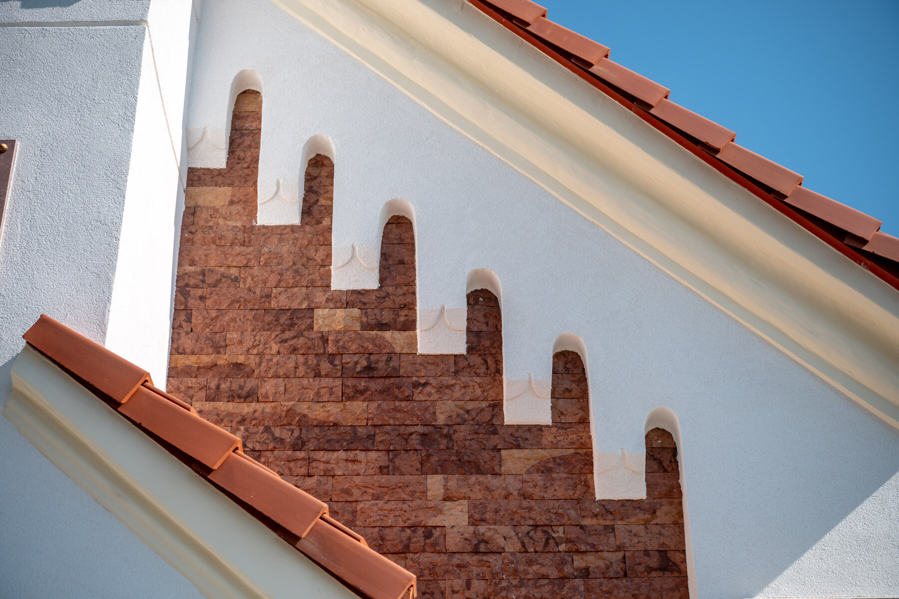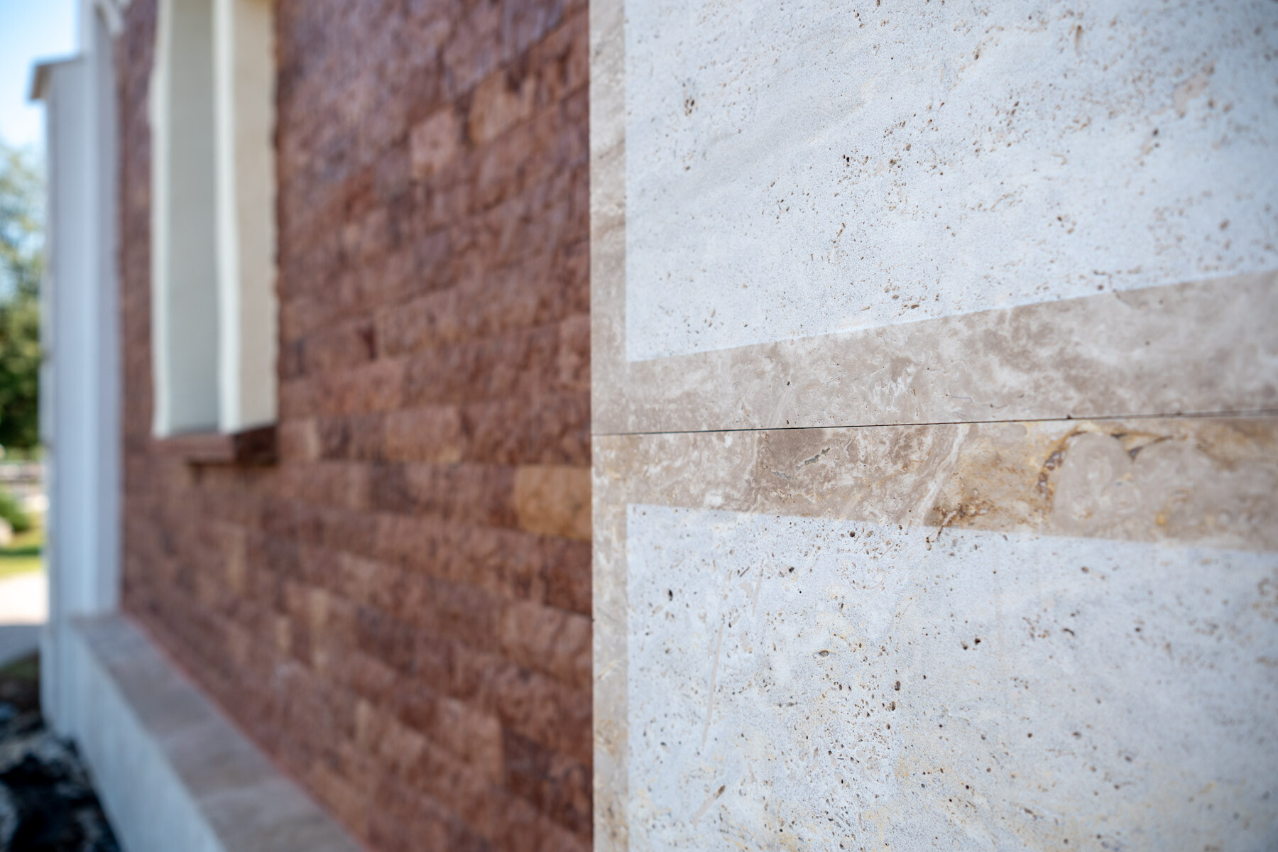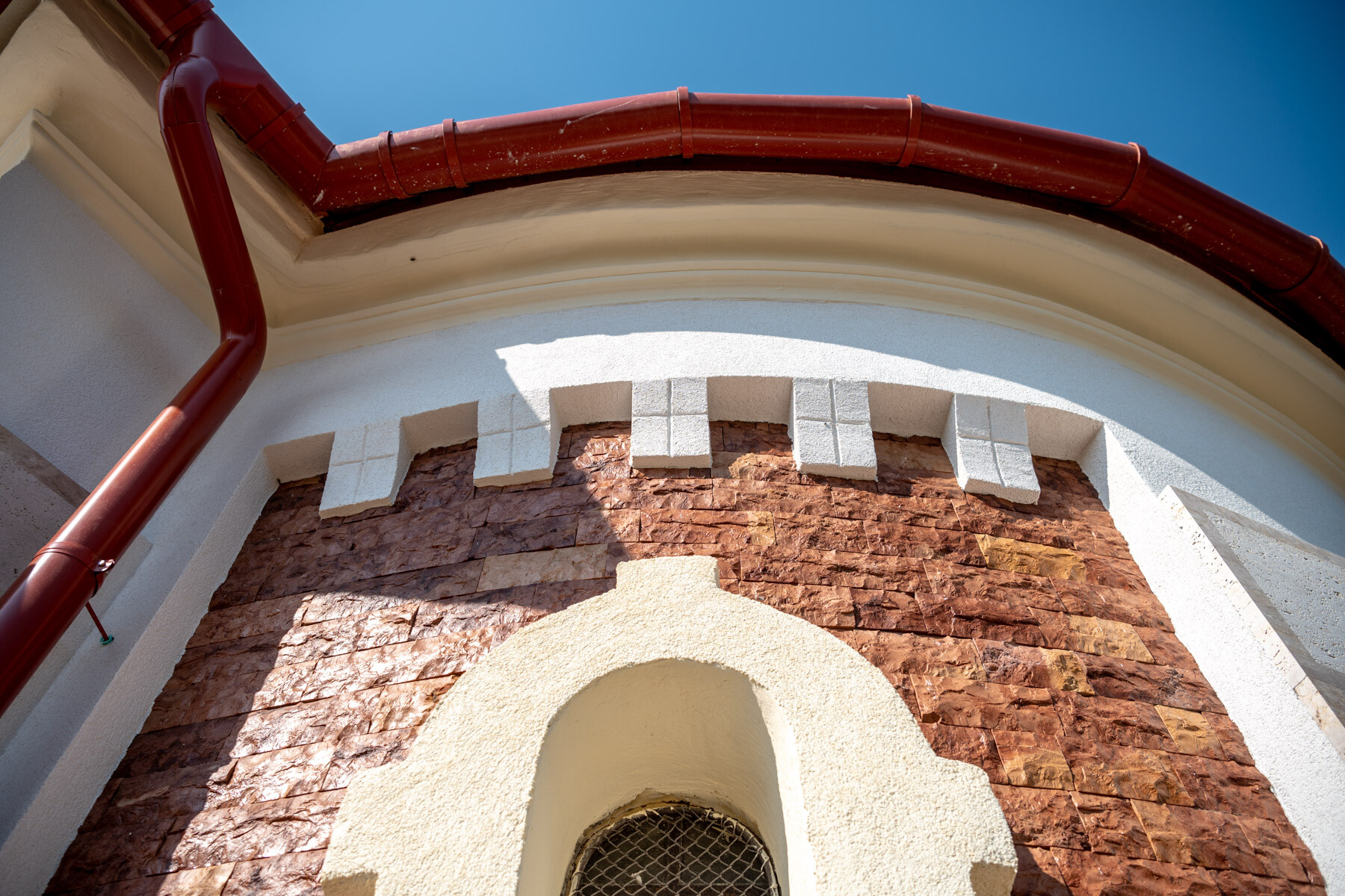Természetes mészkőtufa falazatra a burkolatok felhelyezése, a hiányzó vízszigetelést helyettesítő vízelvezetés pótlása és a lélegző-páraáteresztő lábazati kőburkolat használata mellett külön érdekesség volt a kivitelezés során, hogy a 2733 SILICONOLA K1,5 strukturált színező vakolat a CEMIX előírása szerint nem kerülhetett közvetlenül a mészvakolatra, ezért egy közbülső habarcsréteget (2110 Renti) hordtak fel tapadóhídként, amely alkalmas volt a vakolat fogadásra.