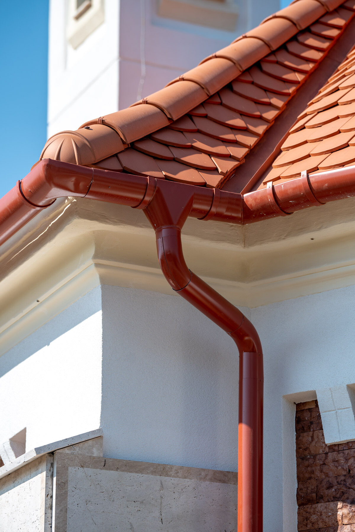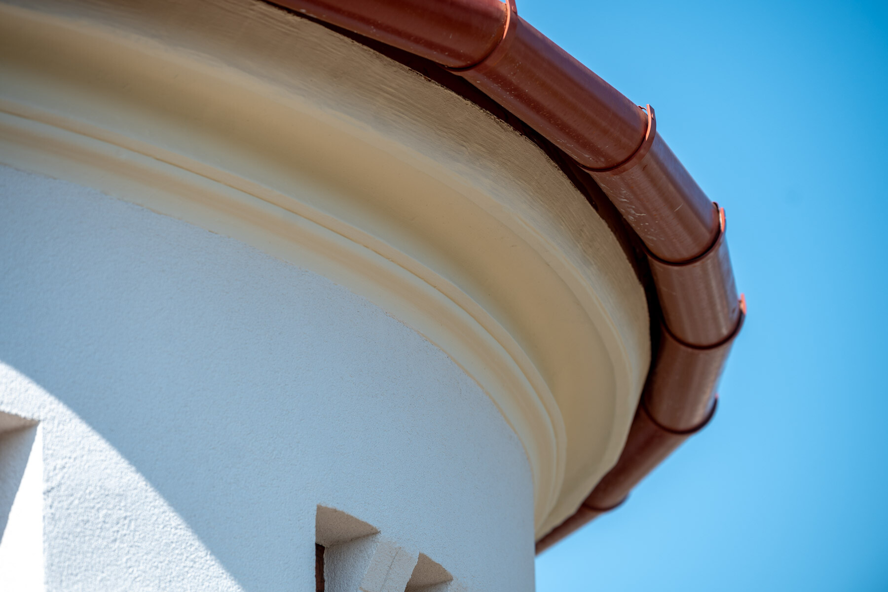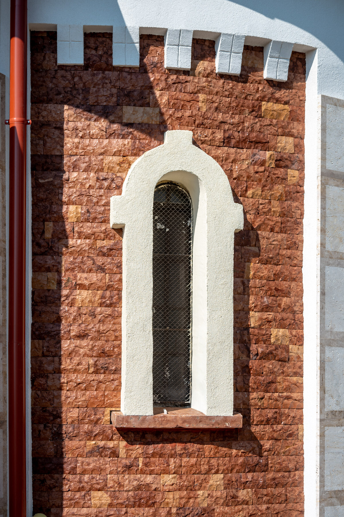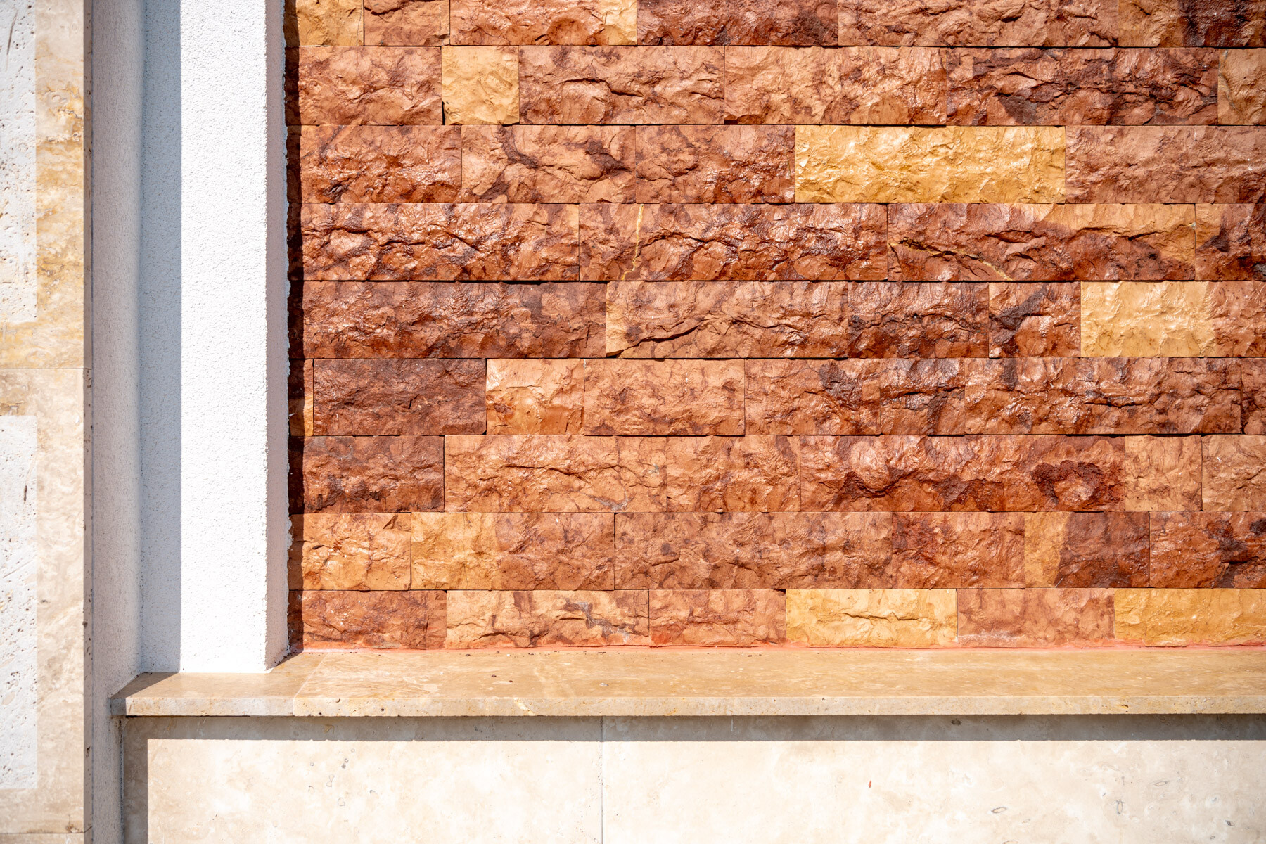 Természetes mészkőtufa falazatra a burkolatok felhelyezése, a hiányzó vízszigetelést helyettesítő vízelvezetés pótlása és a lélegző-páraáteresztő lábazati kőburkolat használata mellett külön érdekesség volt a kivitelezés során, hogy a 2733 SILICONOLA K1,5 strukturált színező vakolat a CEMIX előírása szerint nem kerülhetett közvetlenül a mészvakolatra, ezért egy közbülső habarcsréteget (2110 Renti) hordtak fel tapadóhídként, amely alkalmas volt a vakolat fogadásra.