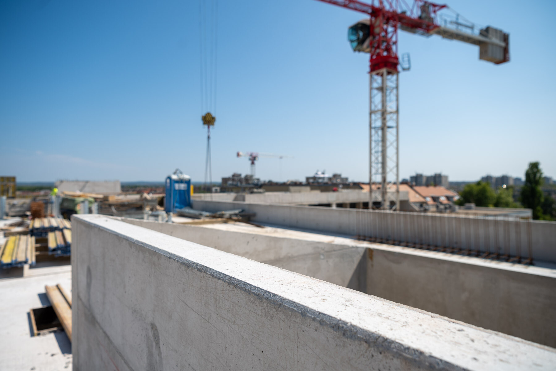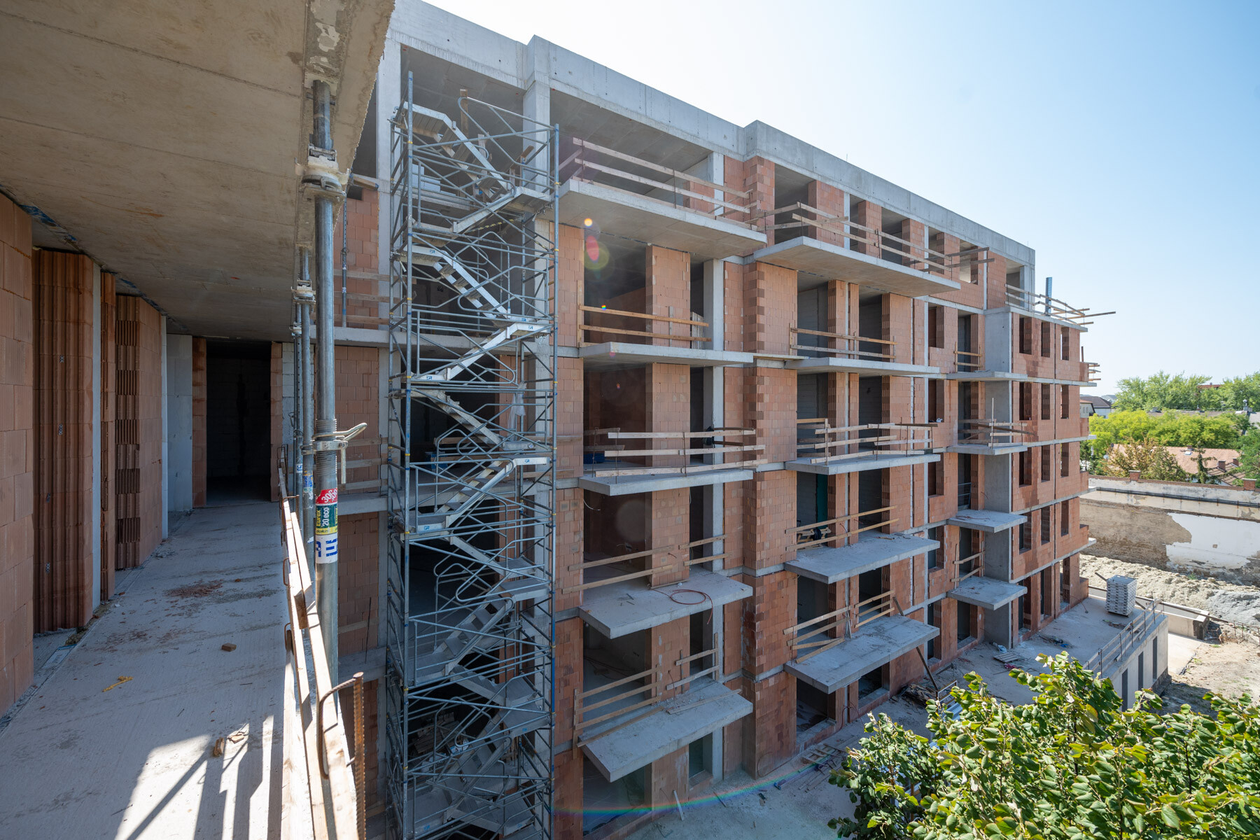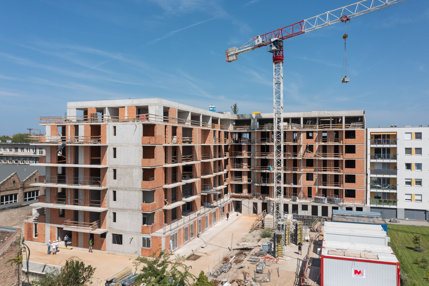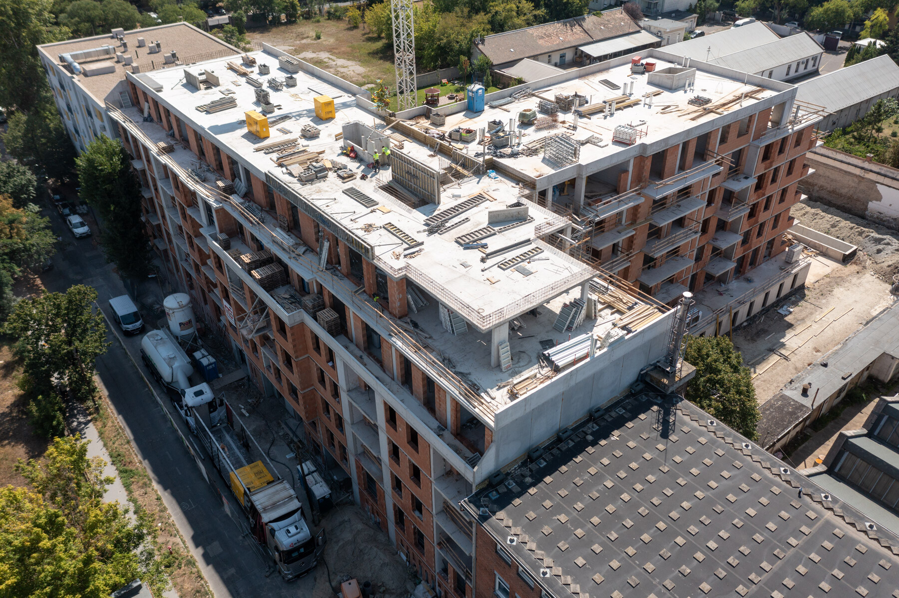 „Április óta elkészült az A épület komplett szerkezetépítése, ahol jelenleg a betonkozmetikai munkák és a zsaluanyagok elszállítása folyik. A B szárnyon pedig elkészült a 6. emelet feletti födém is, itt jelenleg a tetőtéri felépítmények és mellvédfalak készülnek.