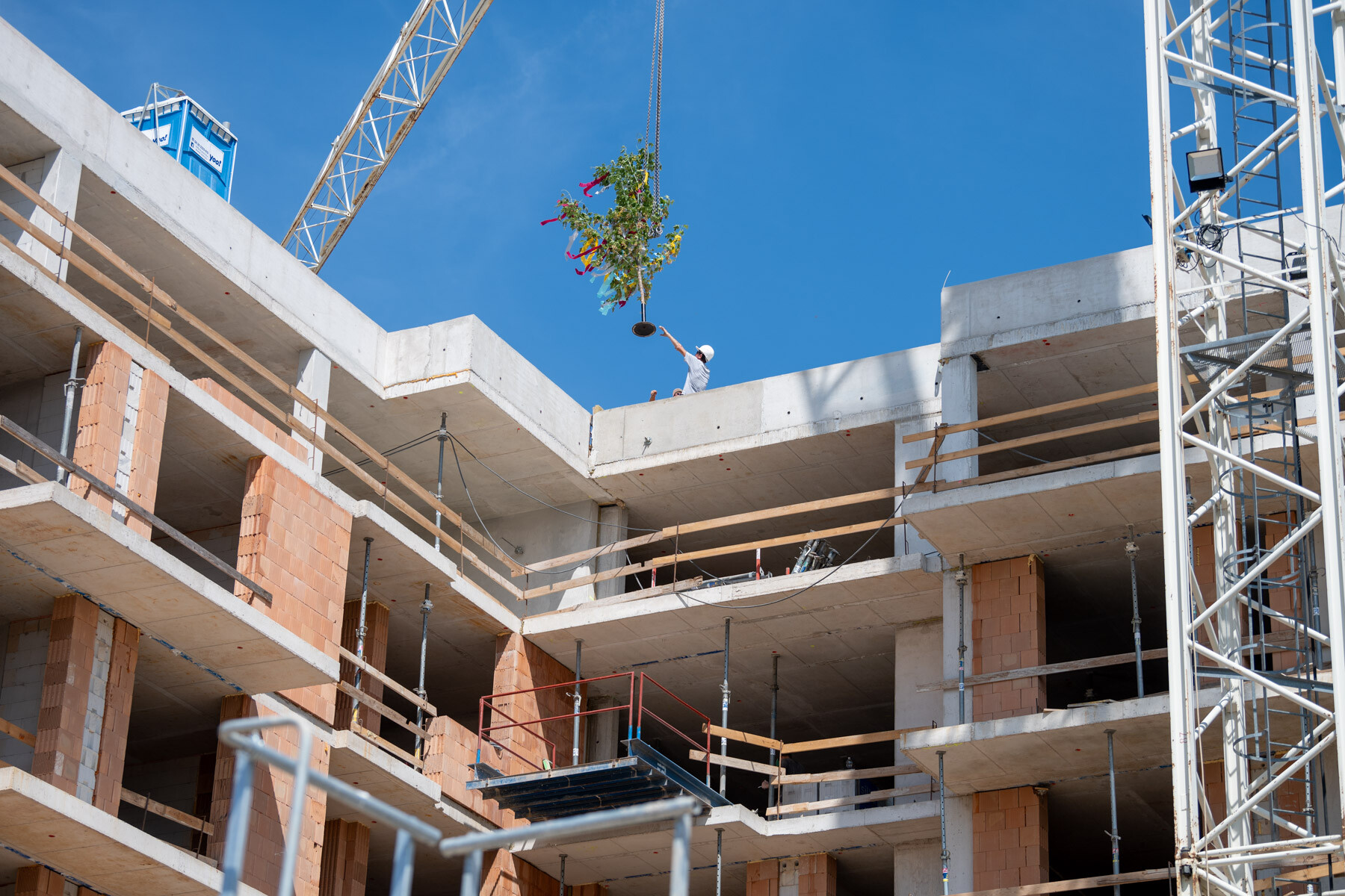 Zugló legújabb, A+ energetikai besorolású lakóépülete elérte legmagasabb pontját. A szerkezetépítésért felelős ÉPI a hagyományoknak megfelelően bokrétával ünnepelt.