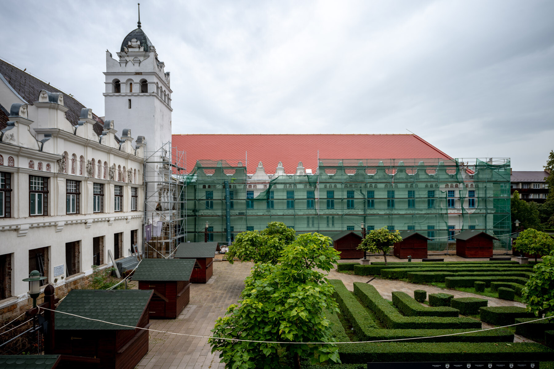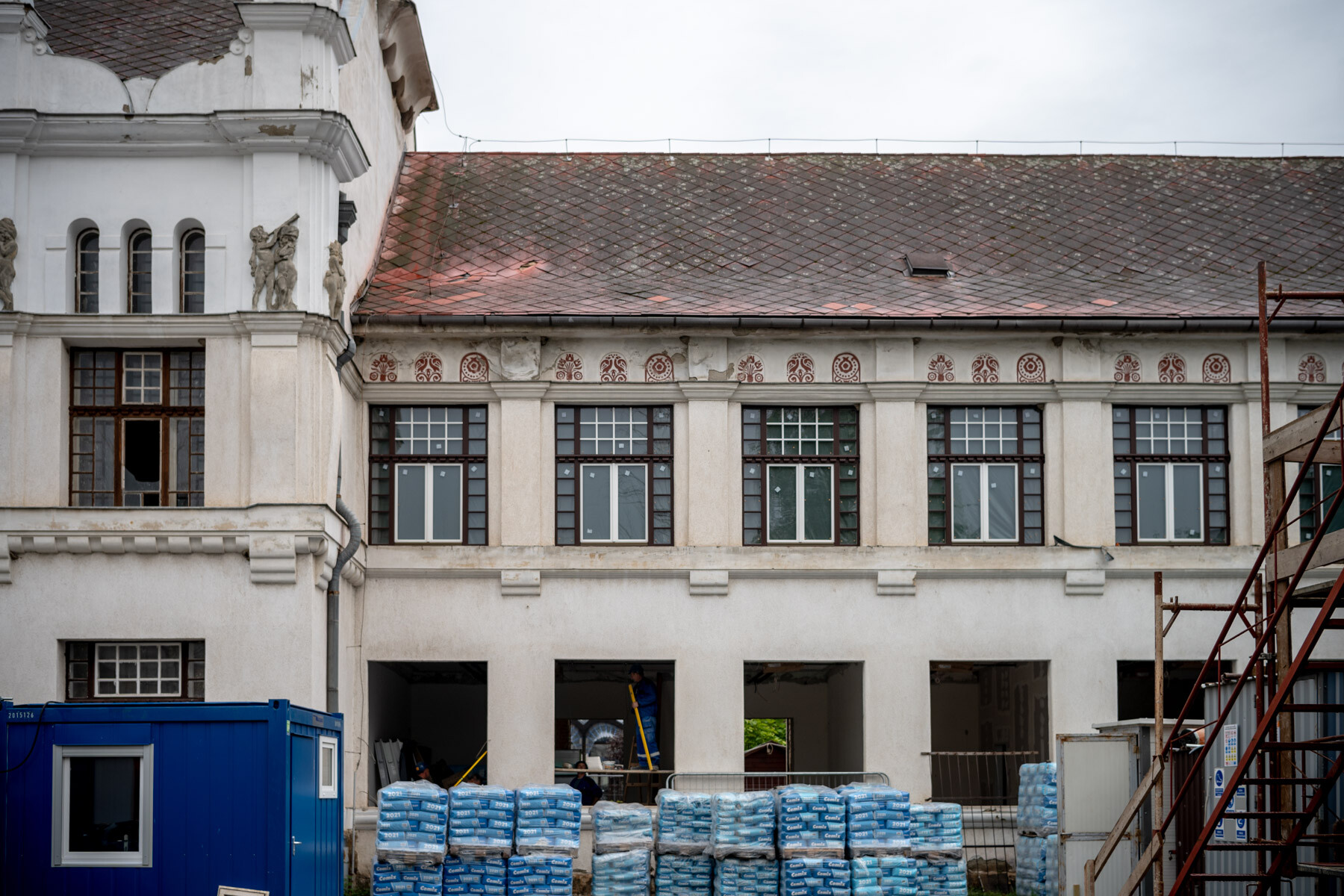 A tetőszerkezet felújításánál a "D" szárnyon már elkészültek az ács- és bádogos munkák, valamint folyamatban van a palafedés készítése is. A homlokzati felületek kőműves javítási (párkányok felújítása, nyílászárók cseréjét követő kávaképzések, homlokzati felületek javítása) feladatai szintén megtörténtek már ezen az épületrészen. A beltéri oldalfal vakolatok az egész épületre vonatkoztatva több mint 50%-os készültségi fokon állnak. Elkészült a gipszkarton válaszfalak vázszerkezete egyoldali gipszkartonlap borítással. Megkezdték tehát azon helyiségekben a felületképzés előkészítő munkáit, ahol a készültségi fok ezeket már megengedi.
