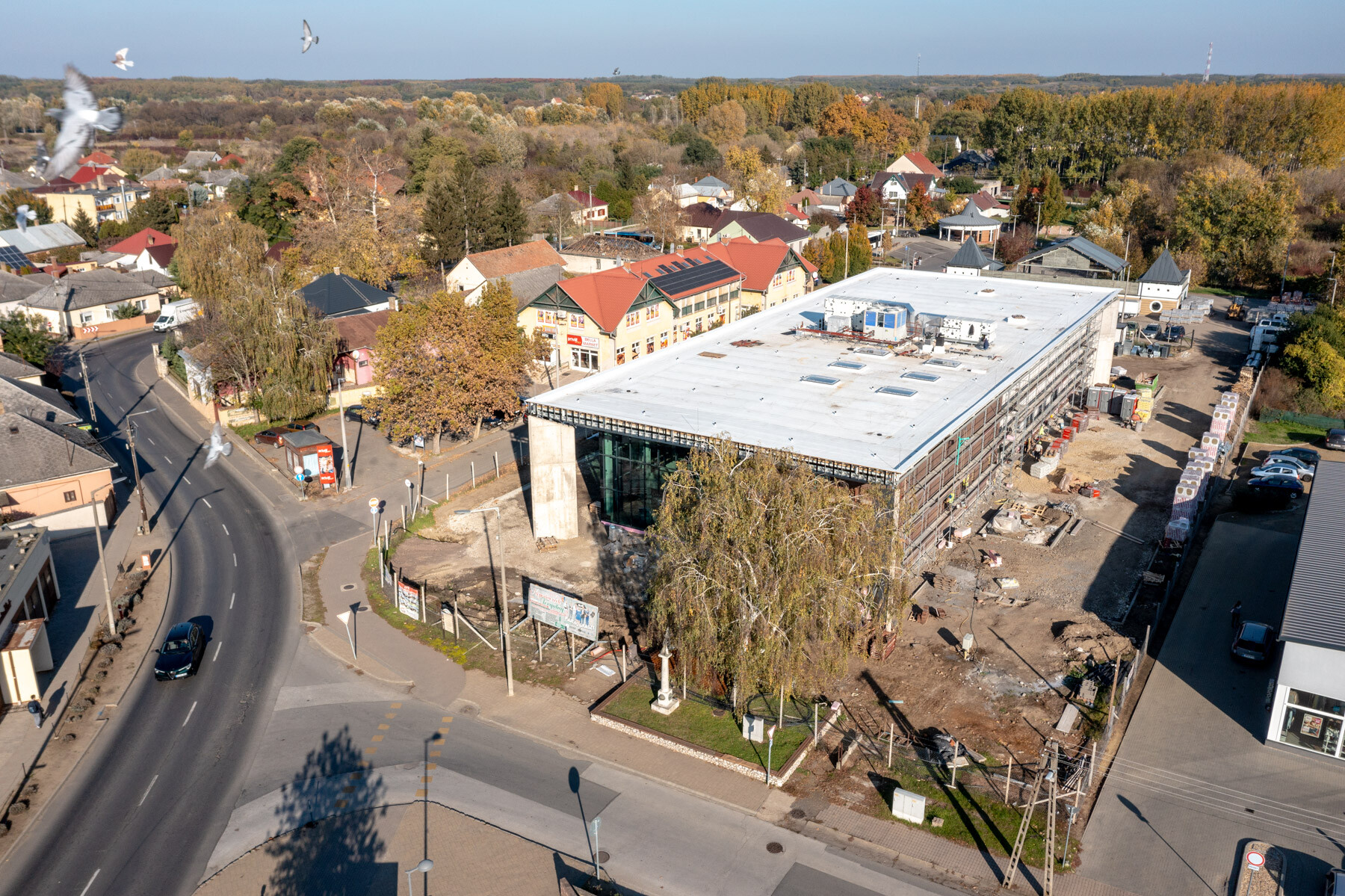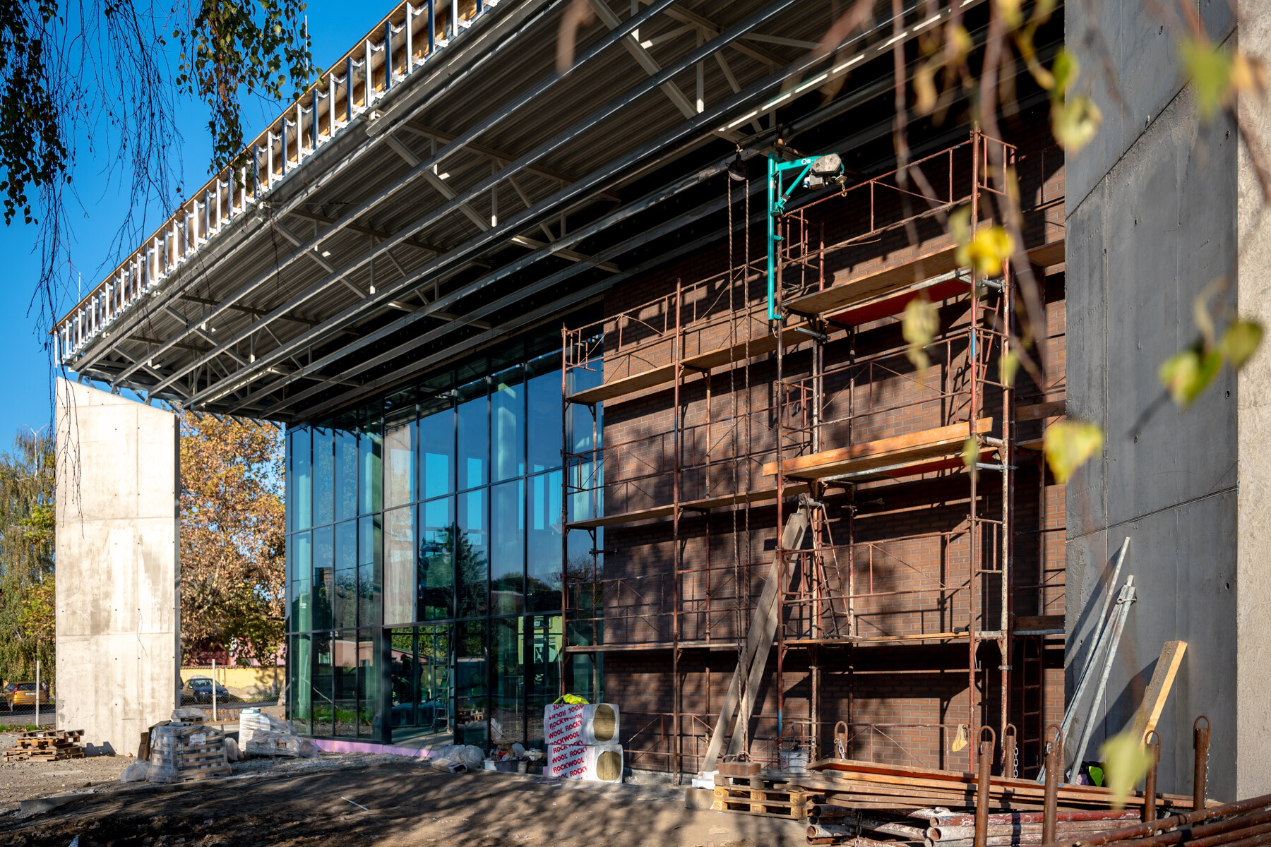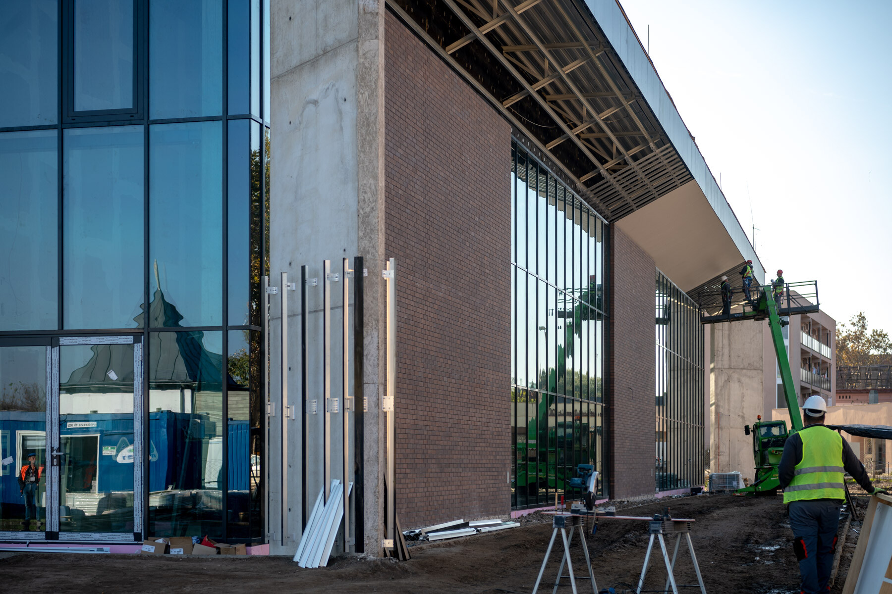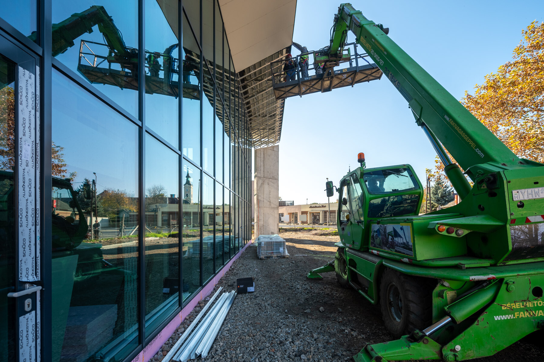 Legutóbbi beszámolónk óta hatalmas változásoknak lehettek tanúi a helybeliek és a környékre látogatók: keleti városunk új központjának nyújtott párkányzatú zárófödéme már a pengeszerű vasbeton sarokpilléreken nyugszik, elkészült a keskeny lizénákkal légiessé tett függönyfal, végleges formáját ölti a klinkertégla-burkolat és a homlokzati fémburkolatokat szerelik a kivitelező munkatársai – az épület homlokzatának burkolásával lassan végleges külső formáját mutatja az intézmény.