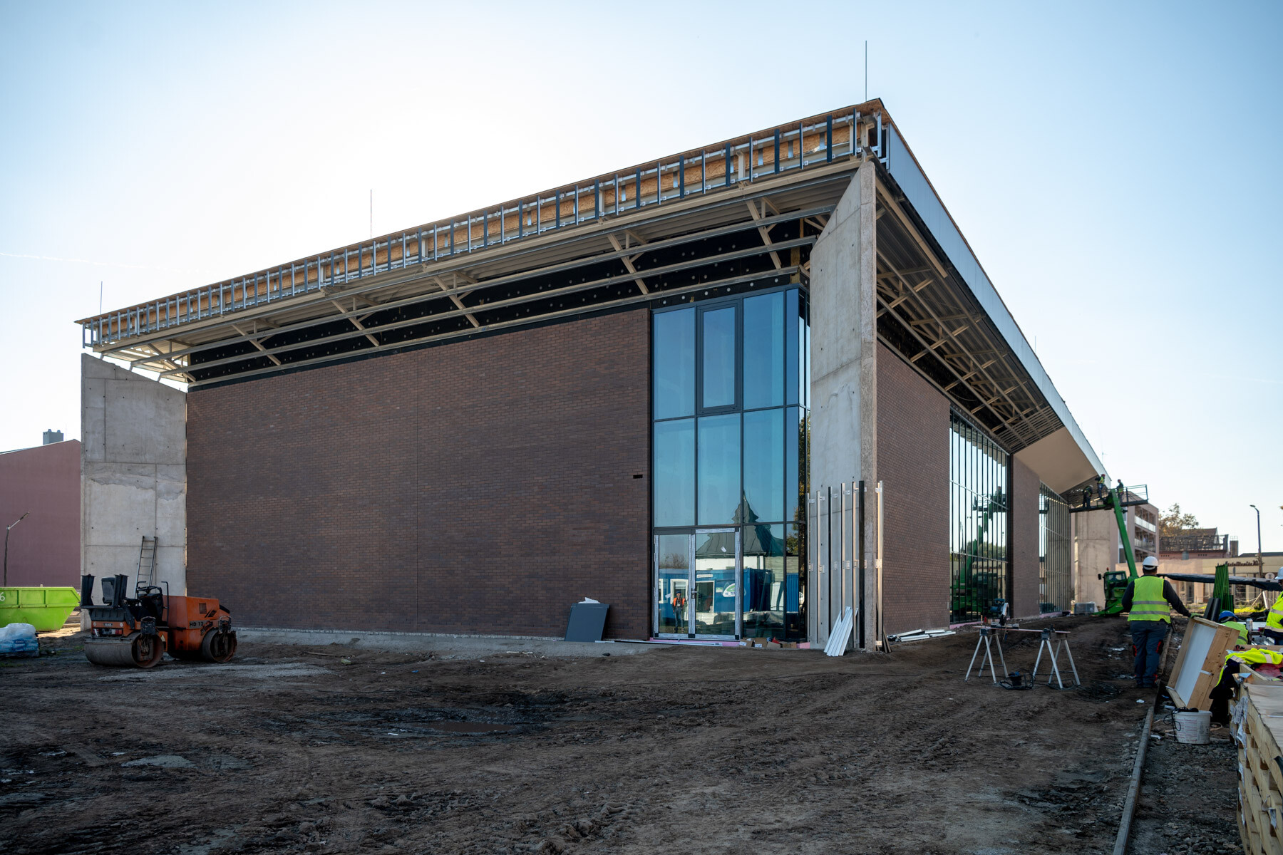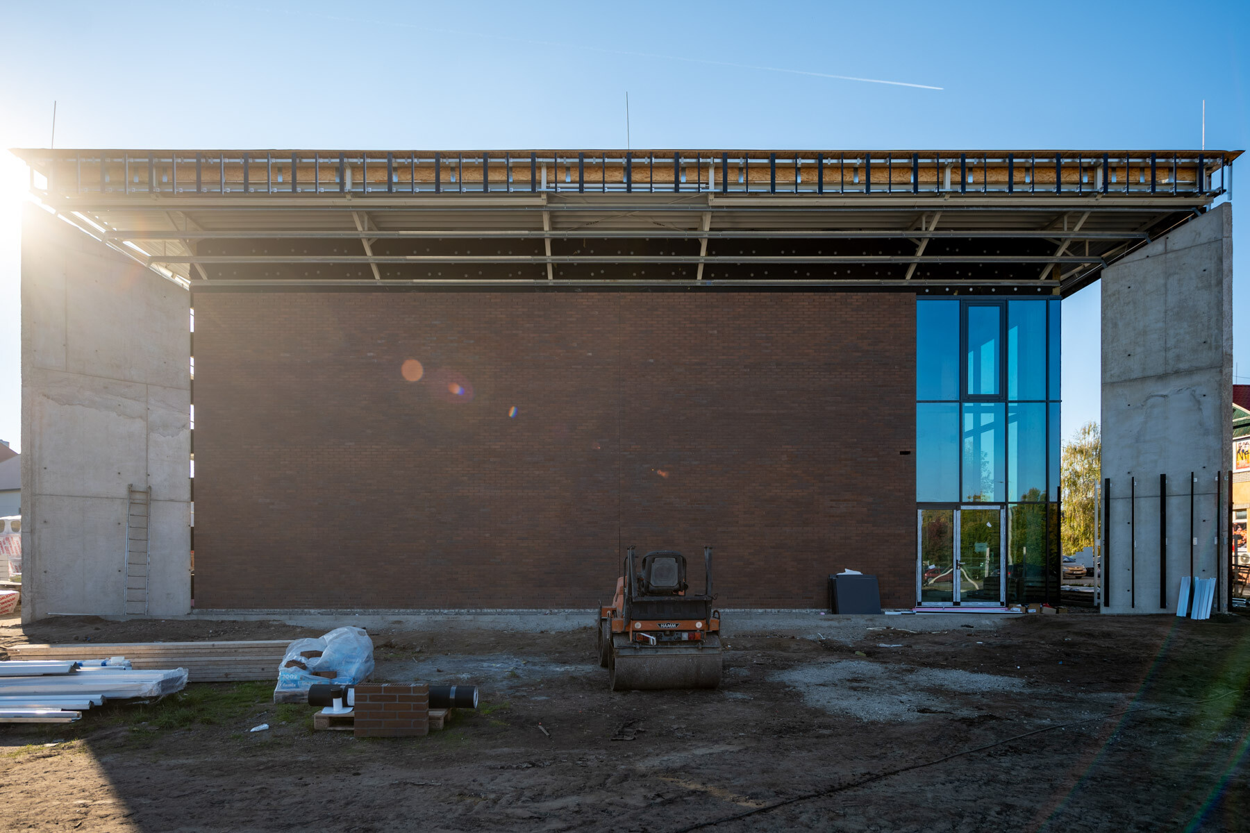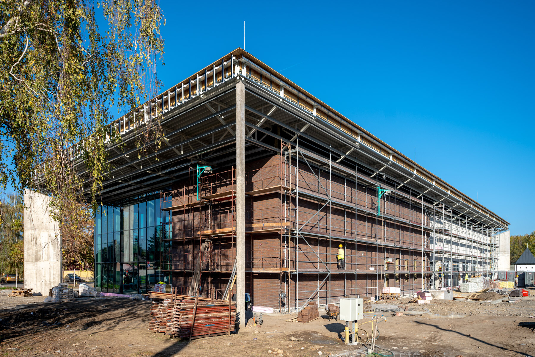 Legutóbbi beszámolónk óta hatalmas változásoknak lehettek tanúi a helybeliek és a környékre látogatók: keleti városunk új központjának nyújtott párkányzatú zárófödéme már a pengeszerű vasbeton sarokpilléreken nyugszik, elkészült a keskeny lizénákkal légiessé tett függönyfal, végleges formáját ölti a klinkertégla-burkolat és a homlokzati fémburkolatokat szerelik a kivitelező munkatársai – az épület homlokzatának burkolásával lassan végleges külső formáját mutatja az intézmény.