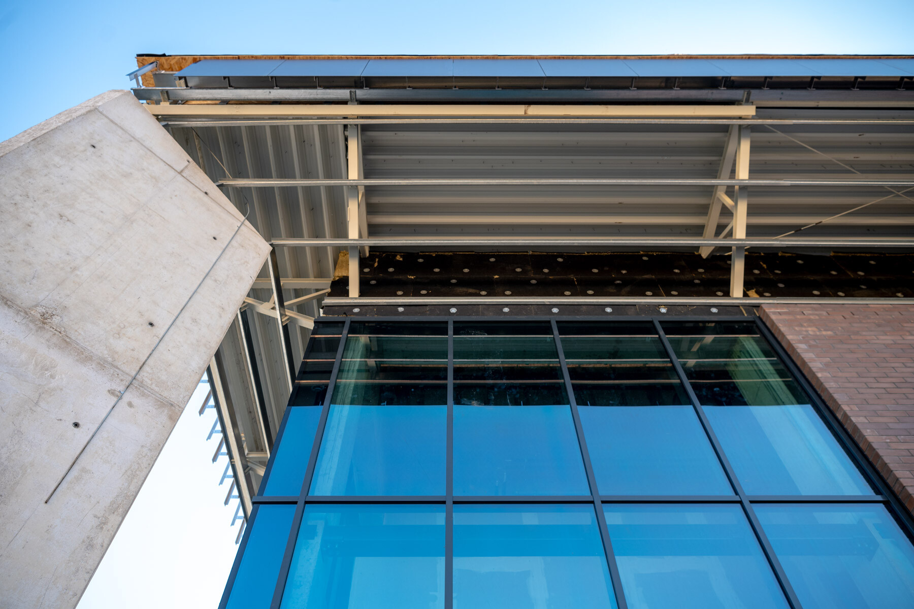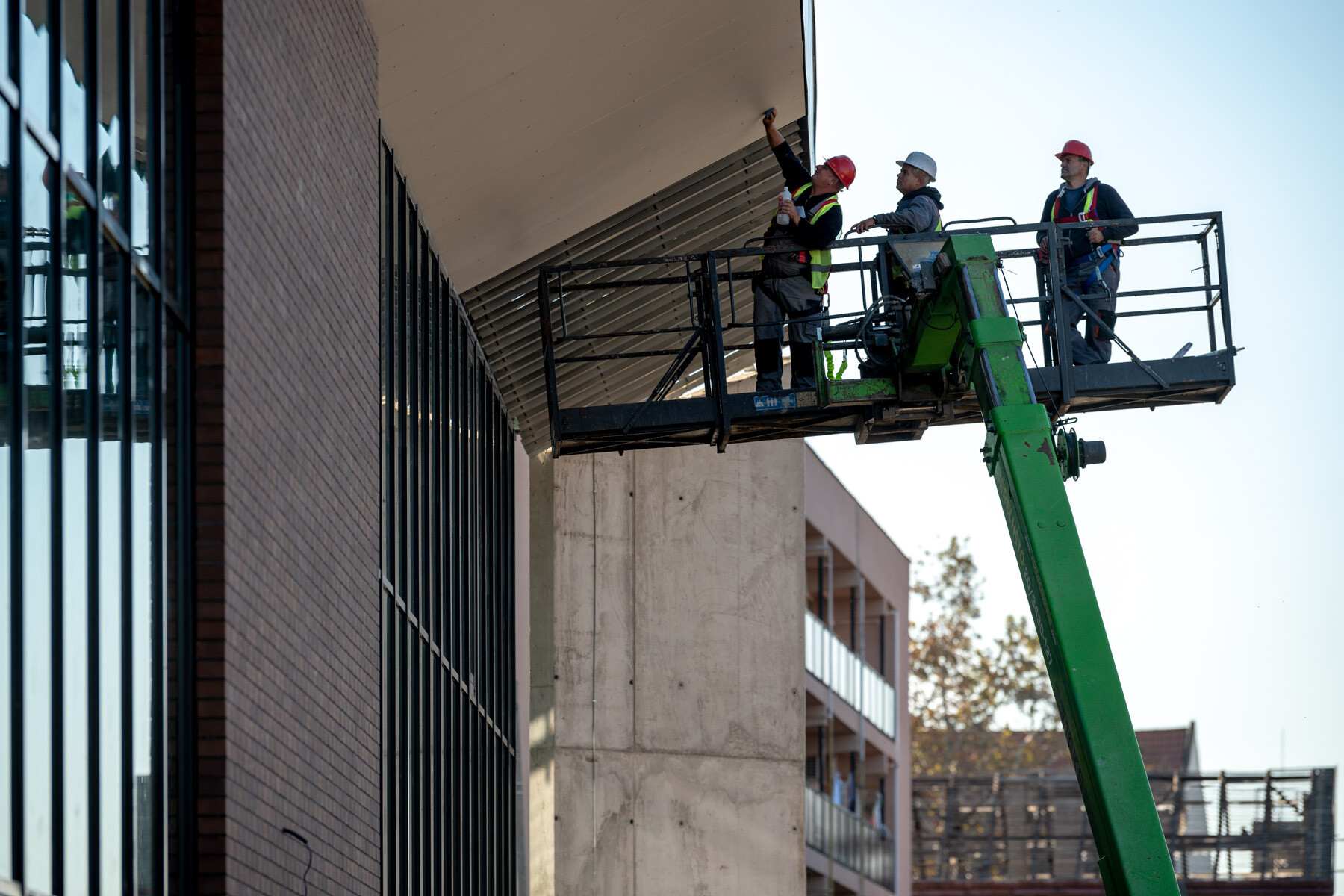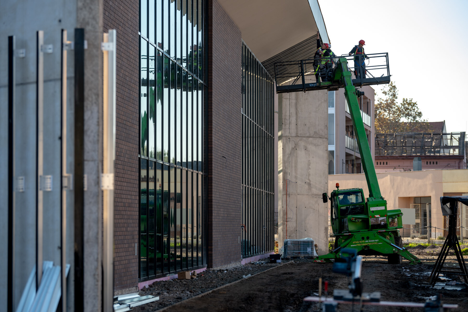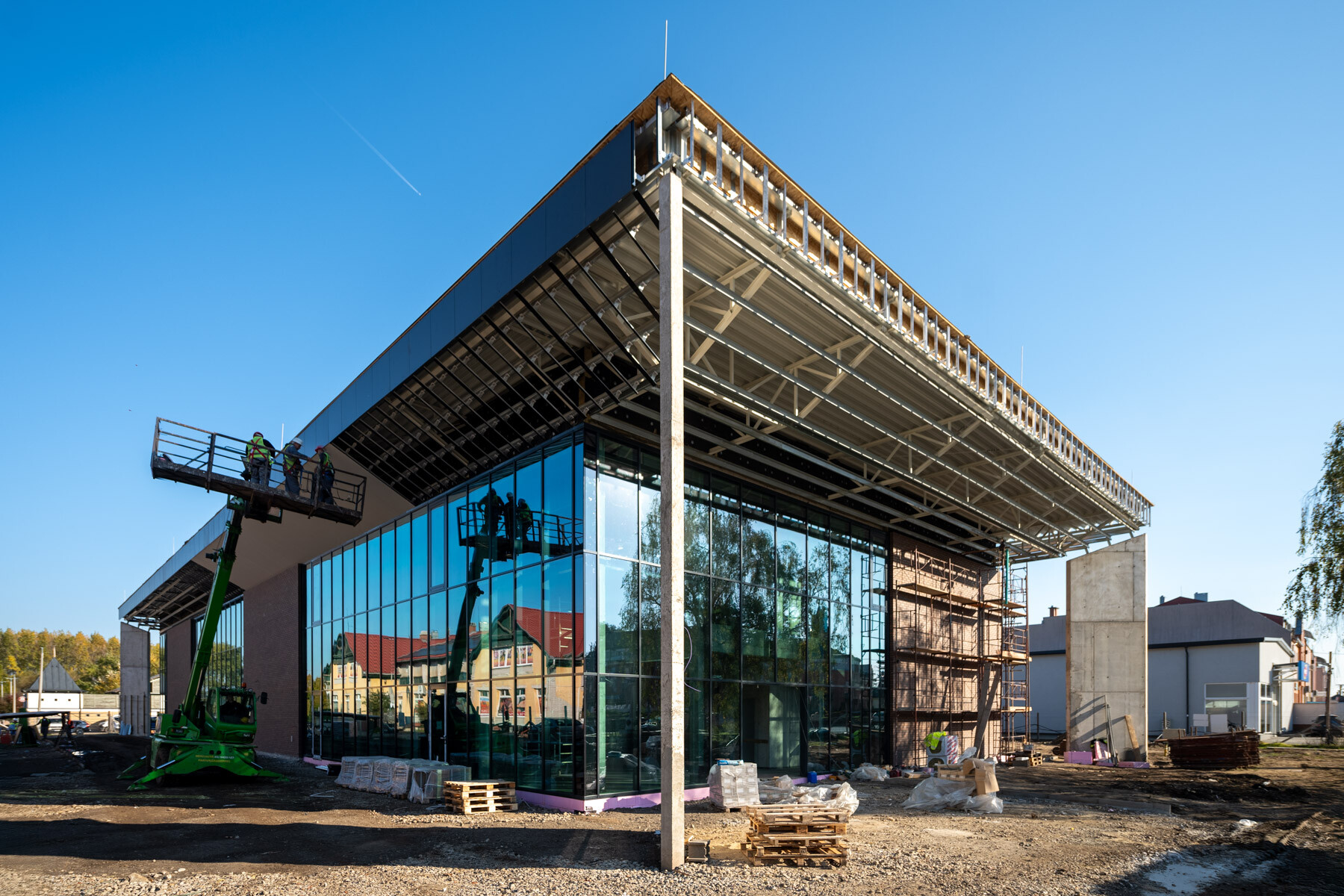 Legutóbbi beszámolónk óta hatalmas változásoknak lehettek tanúi a helybeliek és a környékre látogatók: keleti városunk új központjának nyújtott párkányzatú zárófödéme már a pengeszerű vasbeton sarokpilléreken nyugszik, elkészült a keskeny lizénákkal légiessé tett függönyfal, végleges formáját ölti a klinkertégla-burkolat és a homlokzati fémburkolatokat szerelik a kivitelező munkatársai – az épület homlokzatának burkolásával lassan végleges külső formáját mutatja az intézmény.