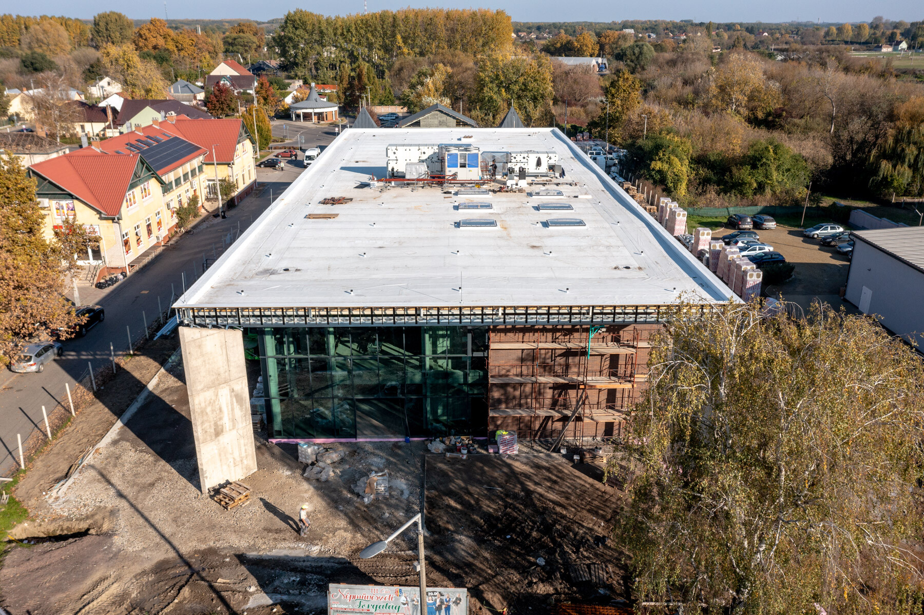 Amint Héver Gábor, a KE-VÍZ projektvezetője tájékoztatta lapunkat: a nyíregyházi illetőségű Archicum St Kft. tervei szerint épülő létesítmény tetőszigetelése is elkészült, beépítették a homlokzati nyílászárókat, felkerültek a tetőre az épületgépészet elemei. Készül már a külső térkőburkolat.