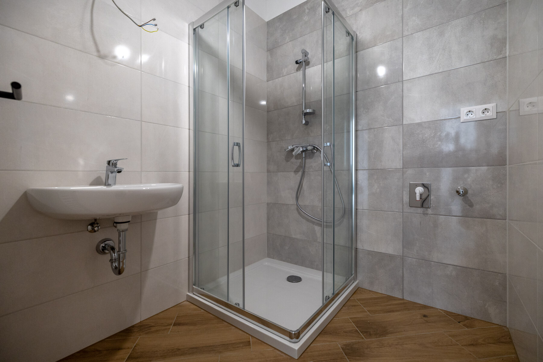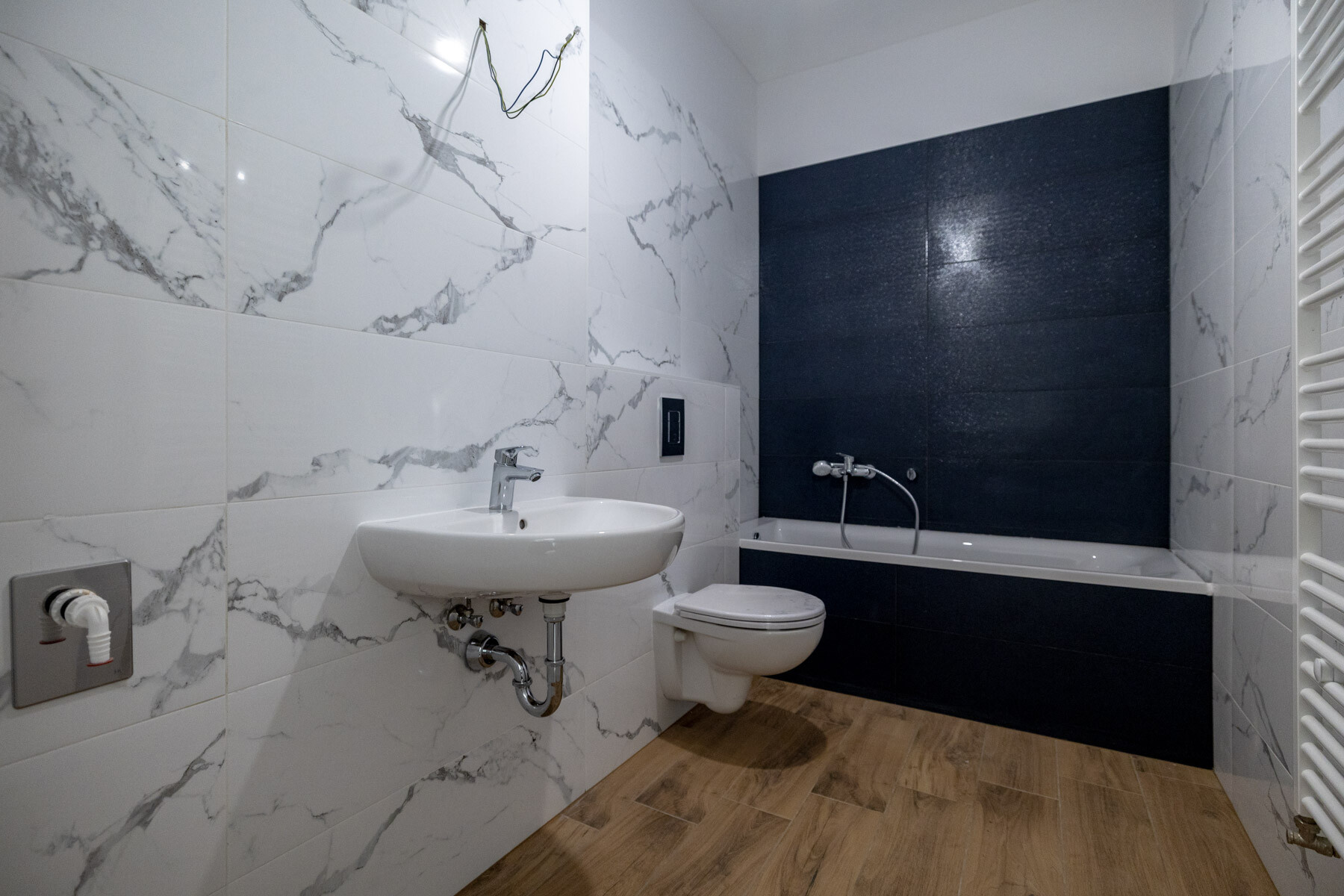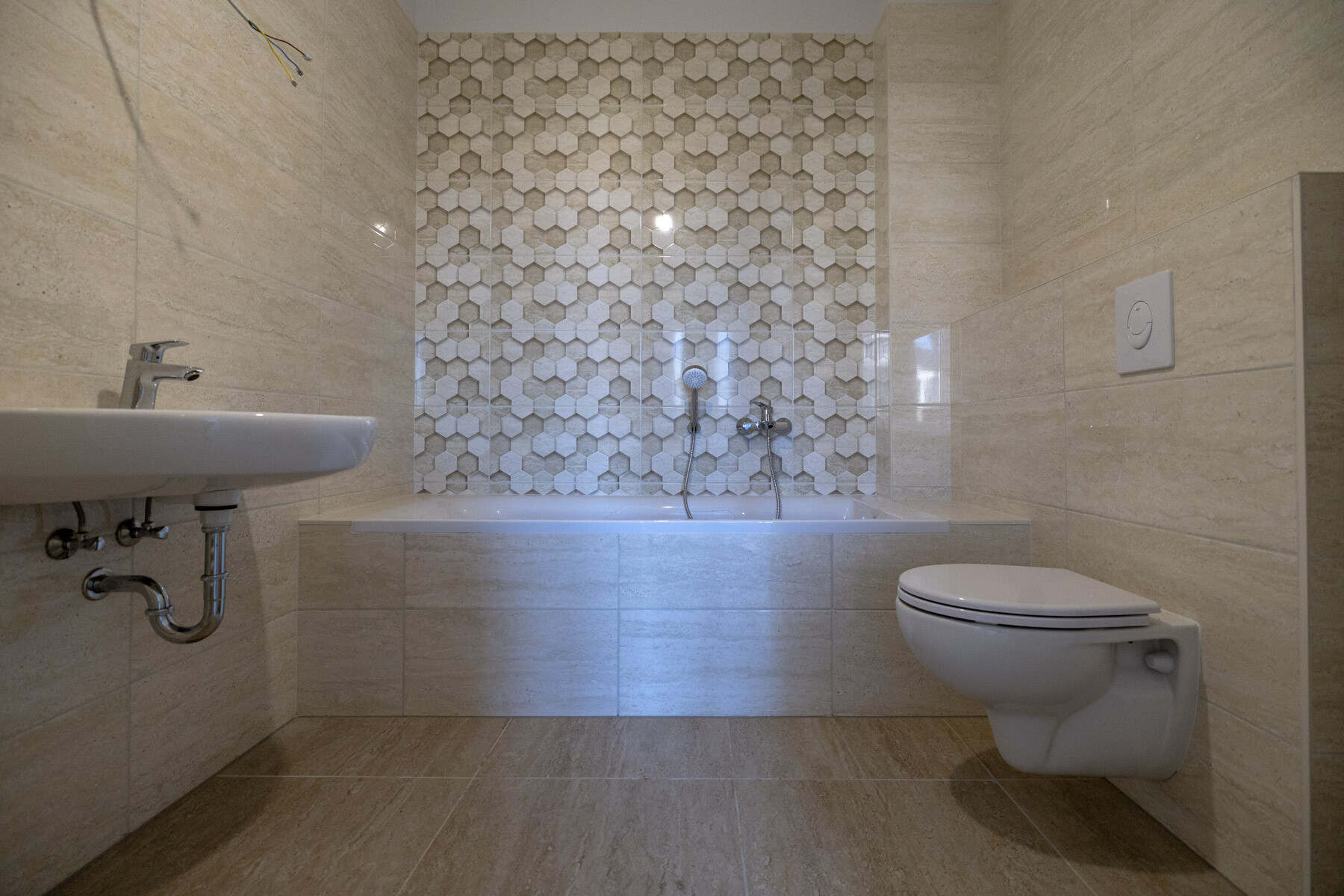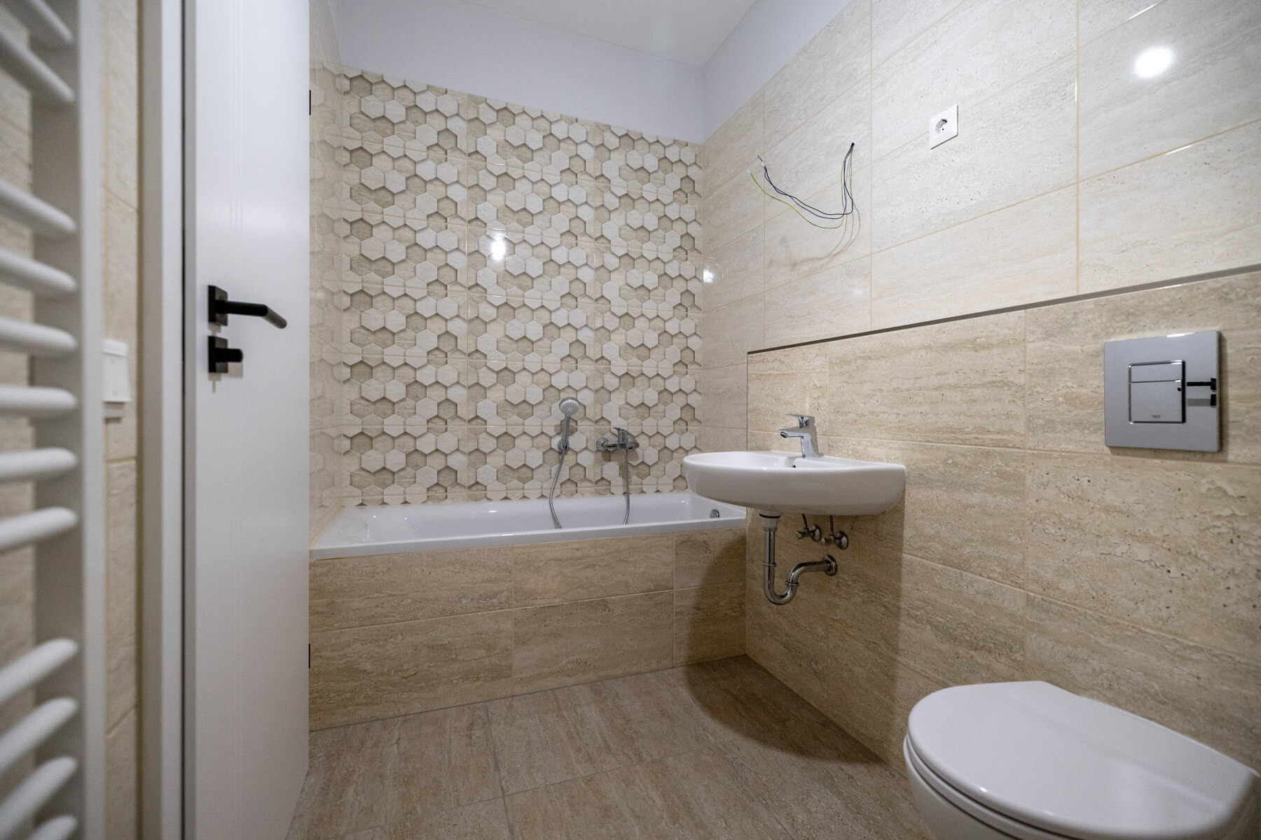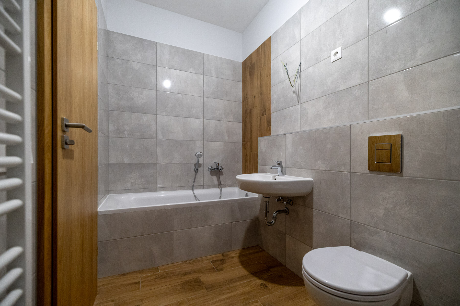 A mosdókagyló, kézmosó, WC és kád beszerzéséről és beszereléséről sem kell már a leendő tulajdonosnak gondoskodnia. A 170x70 centiméteres akril fürdőkádat csempézett előtétfallal, króm le-és túlfolyószettel felszerelve adják át. A zuhanytálca és fülke beszerelését, ugyancsak elvégezték már a kivitelező cég szakemberei.