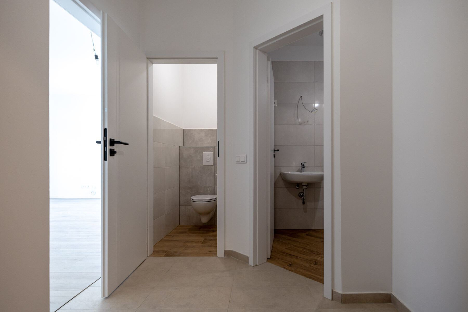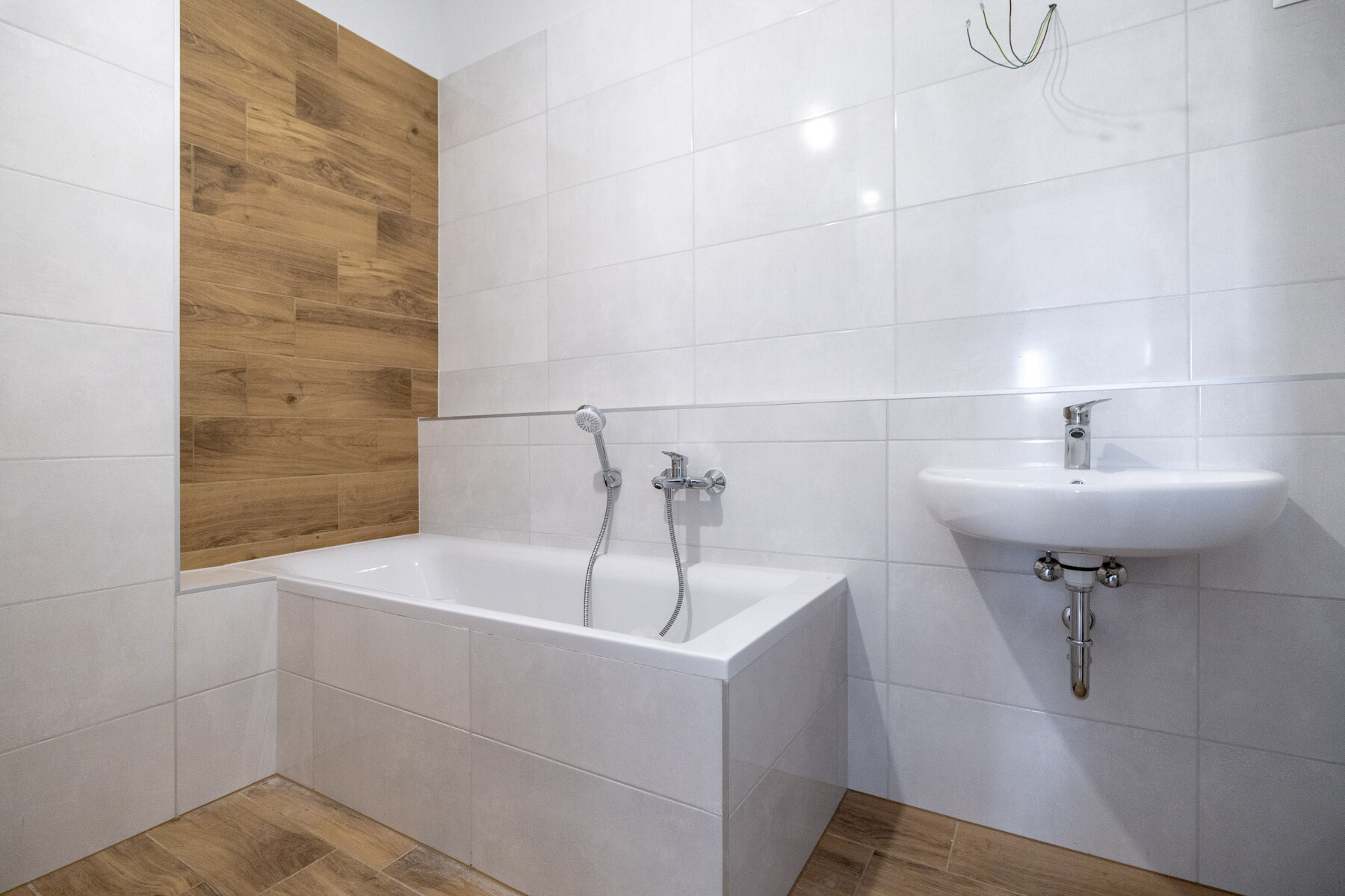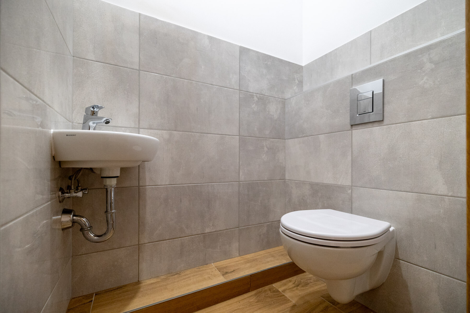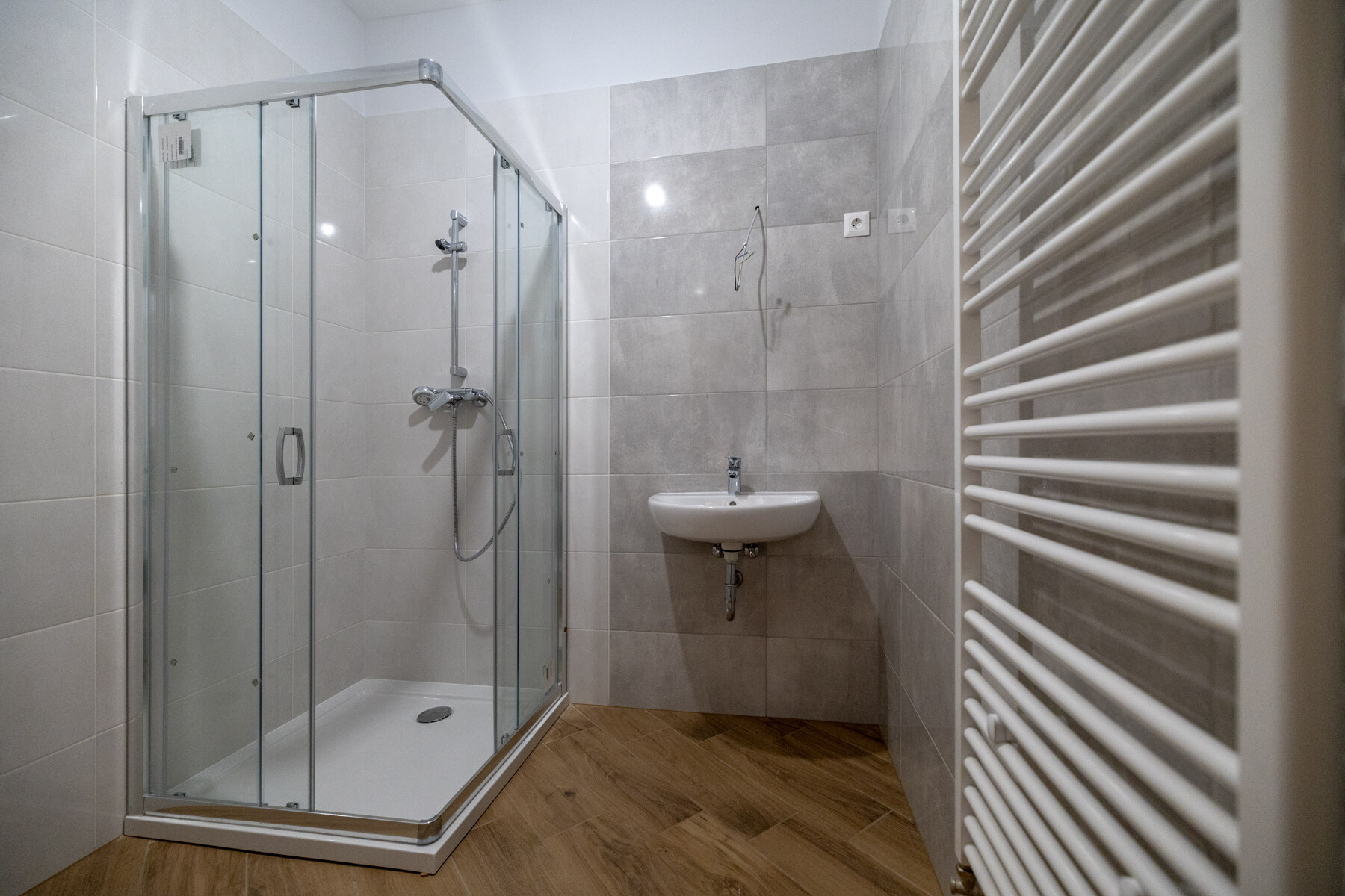 A mosdókagyló, kézmosó, WC és kád beszerzéséről és beszereléséről sem kell már a leendő tulajdonosnak gondoskodnia. A 170x70 centiméteres akril fürdőkádat csempézett előtétfallal, króm le-és túlfolyószettel felszerelve adják át. A zuhanytálca és fülke beszerelését, ugyancsak elvégezték már a kivitelező cég szakemberei.