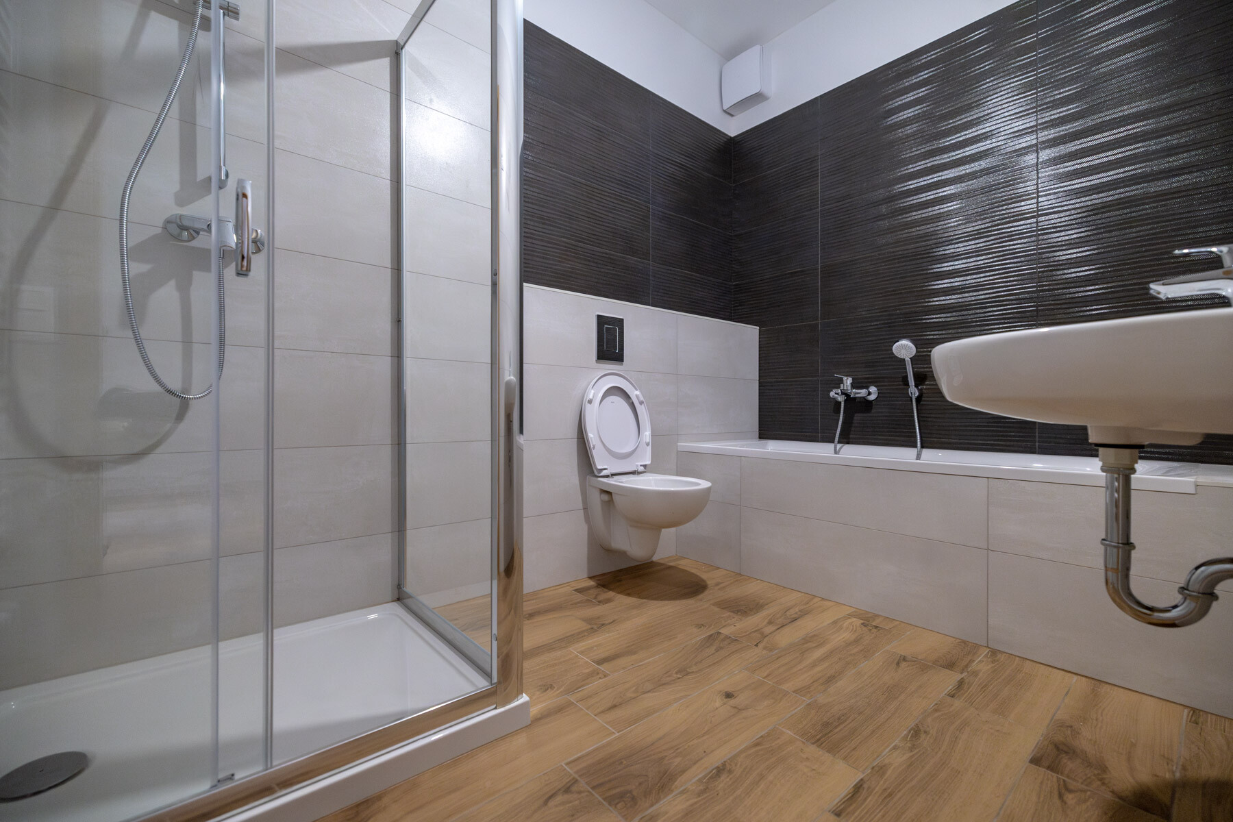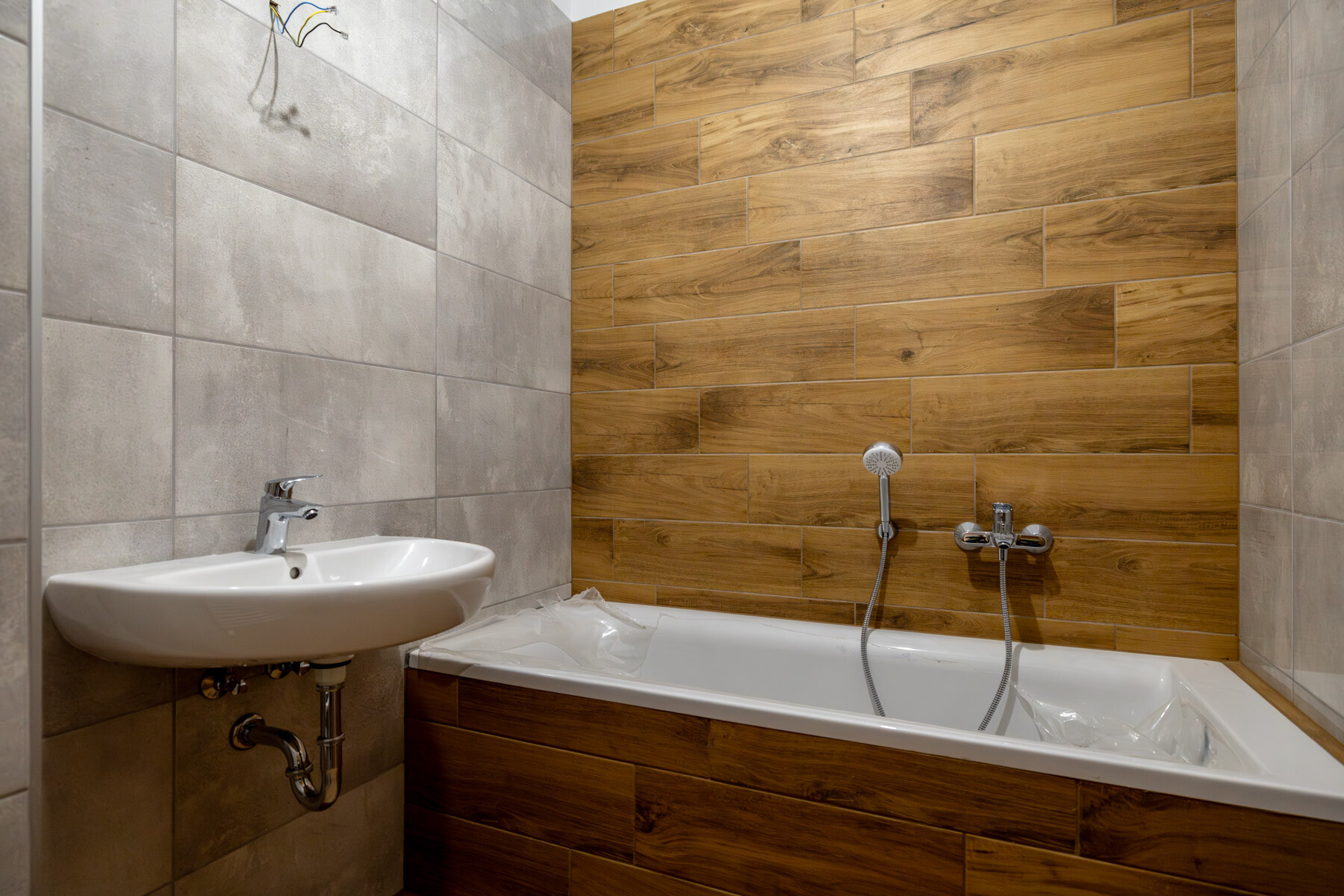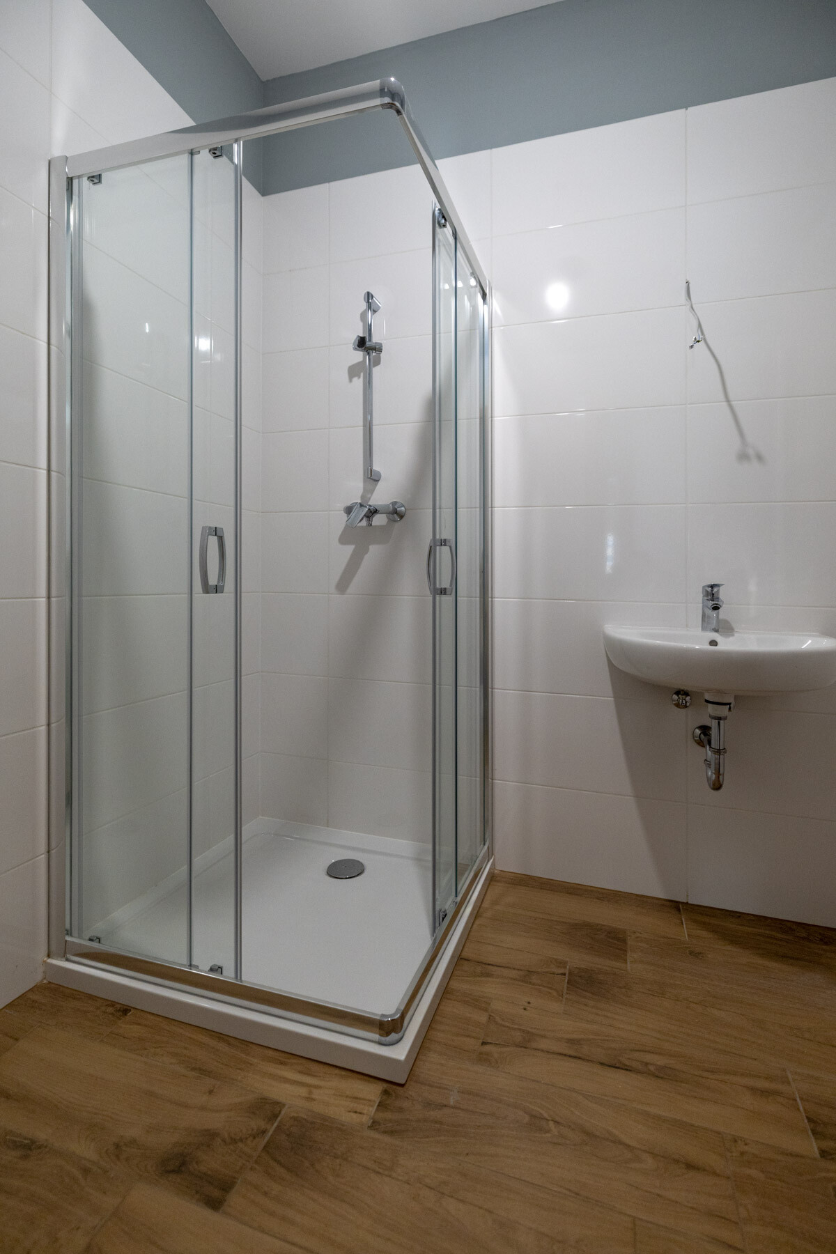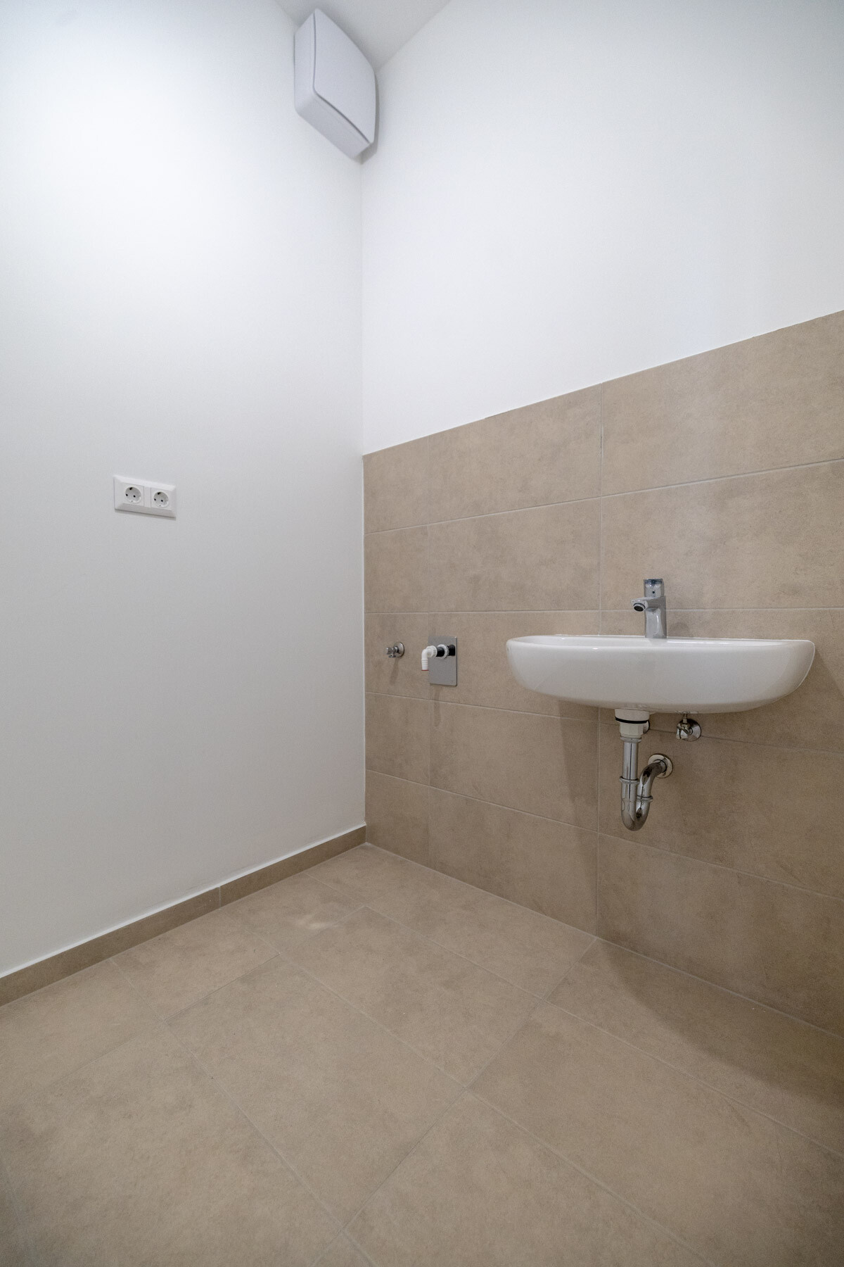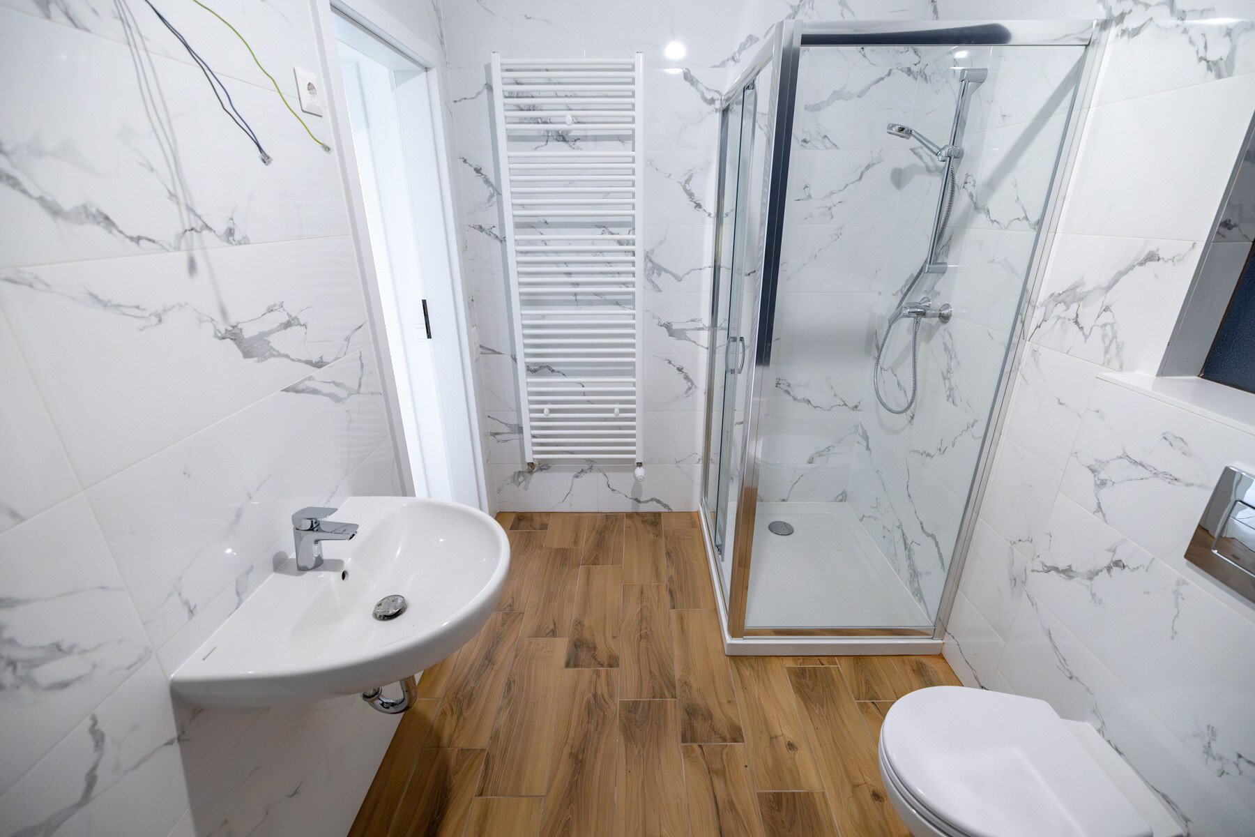 A mosdókagyló, kézmosó, WC és kád beszerzéséről és beszereléséről sem kell már a leendő tulajdonosnak gondoskodnia. A 170x70 centiméteres akril fürdőkádat csempézett előtétfallal, króm le-és túlfolyószettel felszerelve adják át. A zuhanytálca és fülke beszerelését, ugyancsak elvégezték már a kivitelező cég szakemberei.