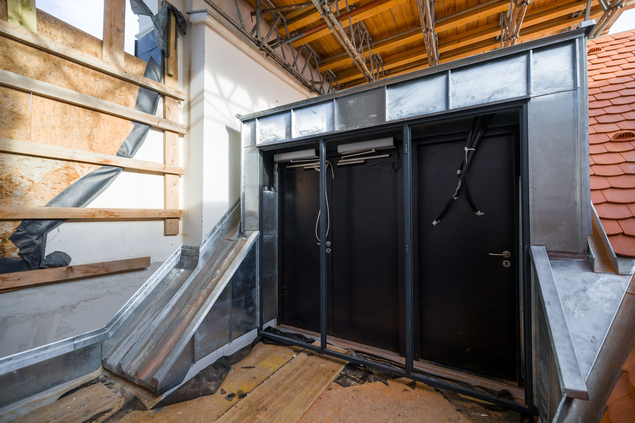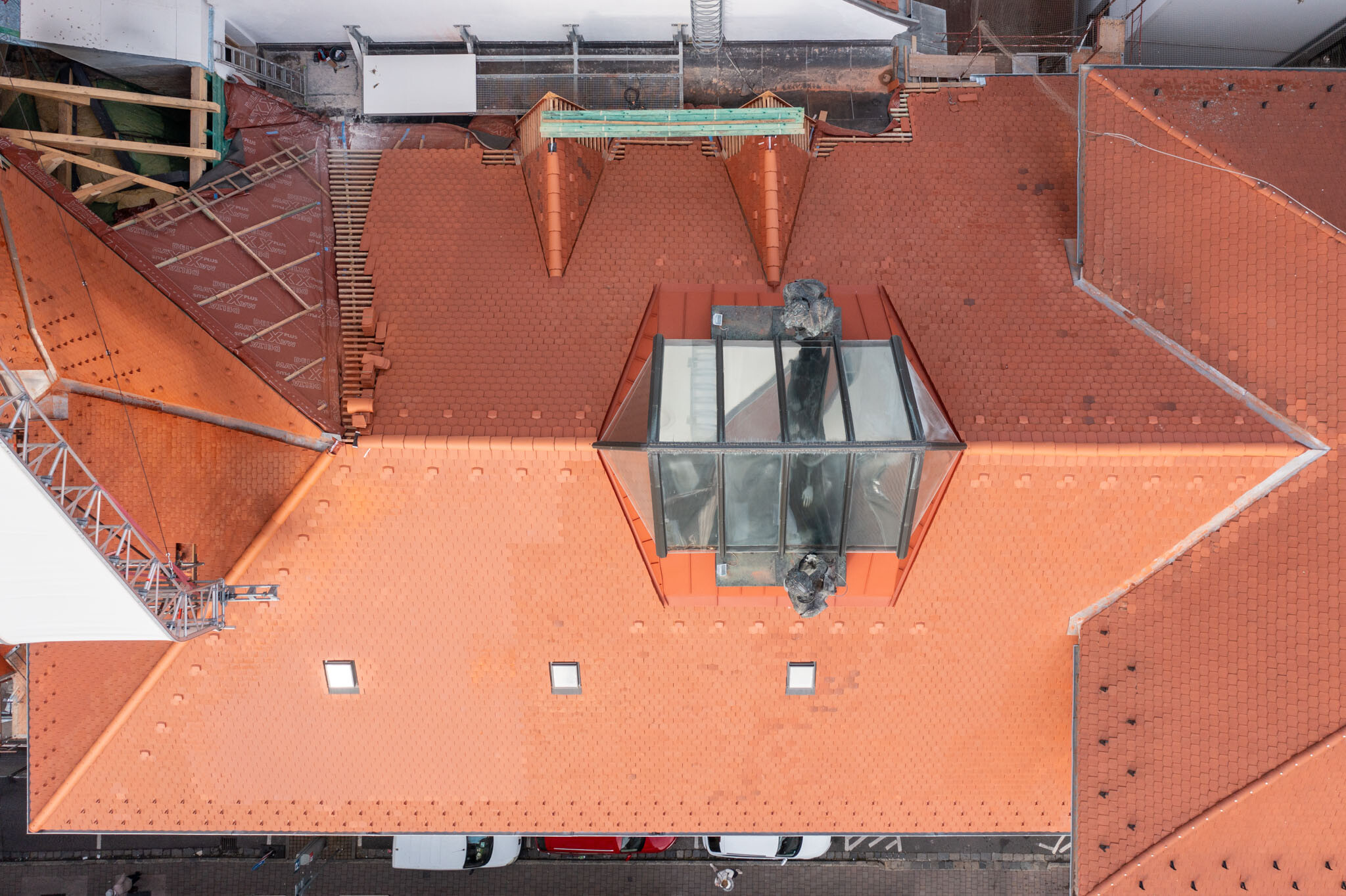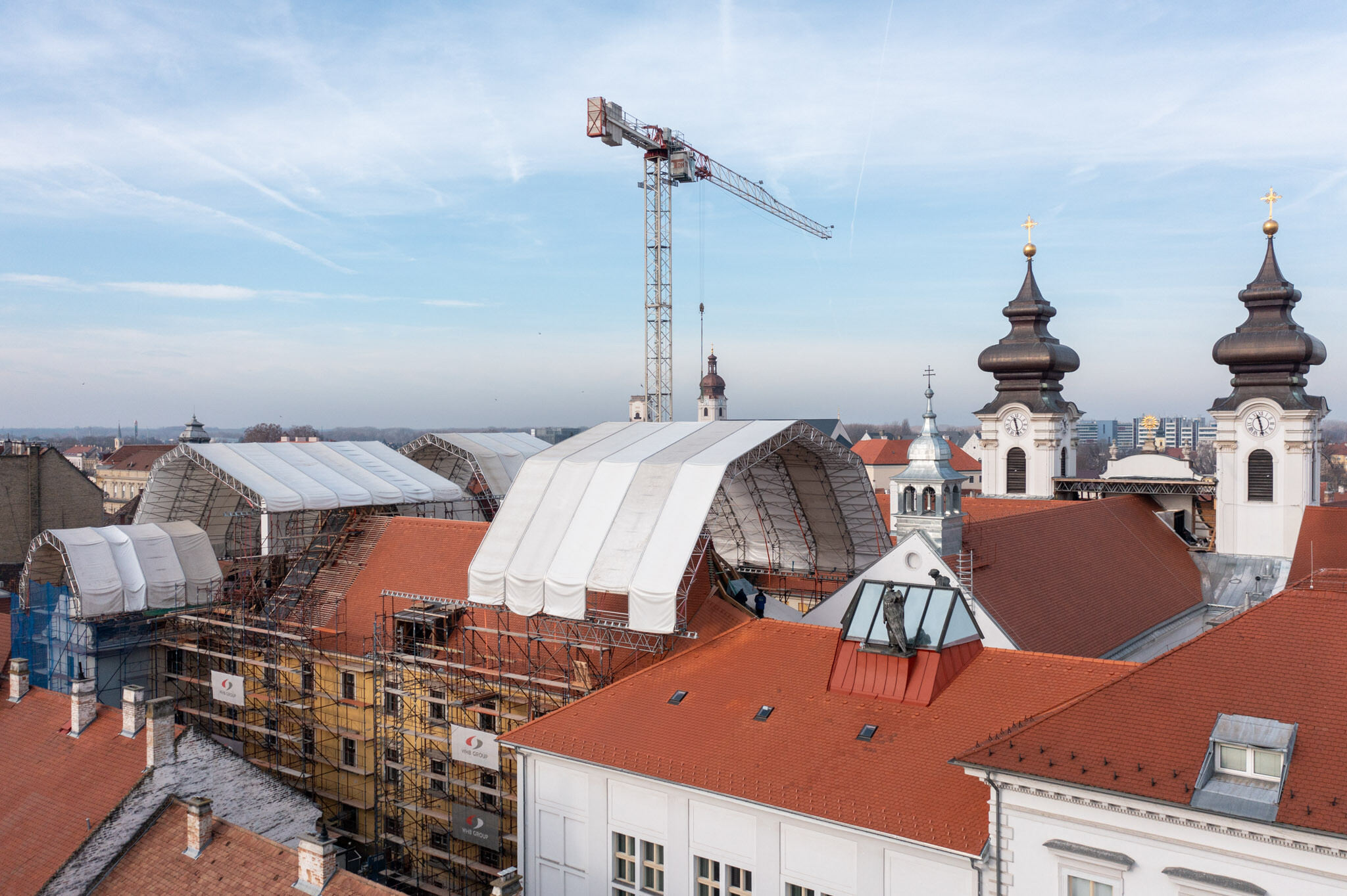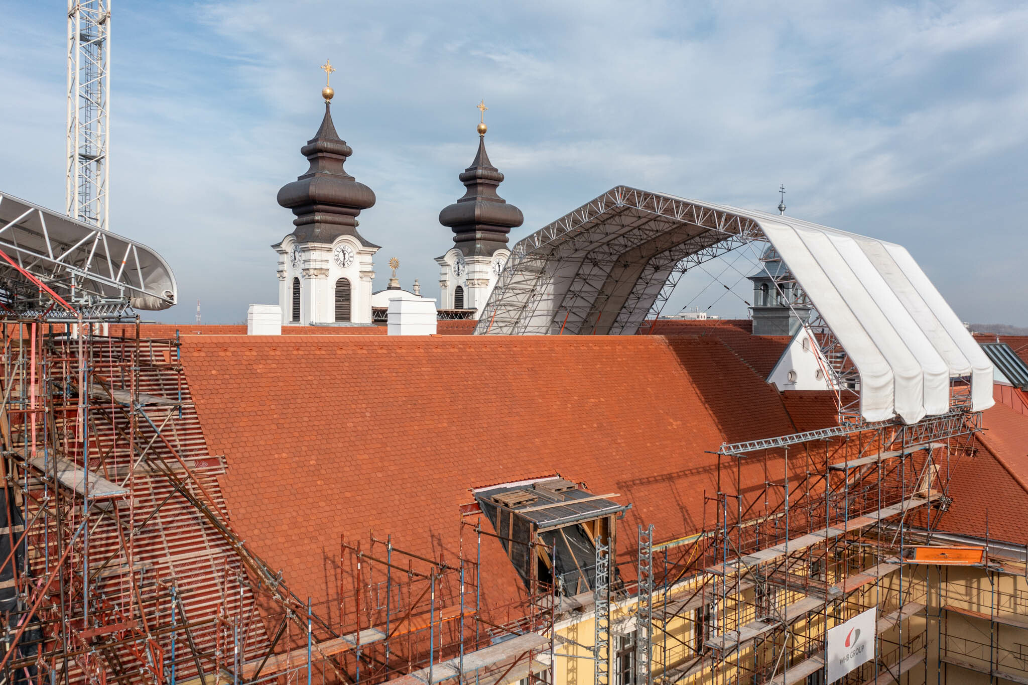 Geszler Norbert, a WHB területi igazgatója tájékoztatta lapunkat az azóta végzett munkákról. Szavaiból kiderült: a rendház déli és nyugati szárnyán a tető ácsszerkezete elkészült, a tetők szigetelve, fóliázva, beázásmentesen várják a héjalást, amely már fel is került a déli szárnyra.
