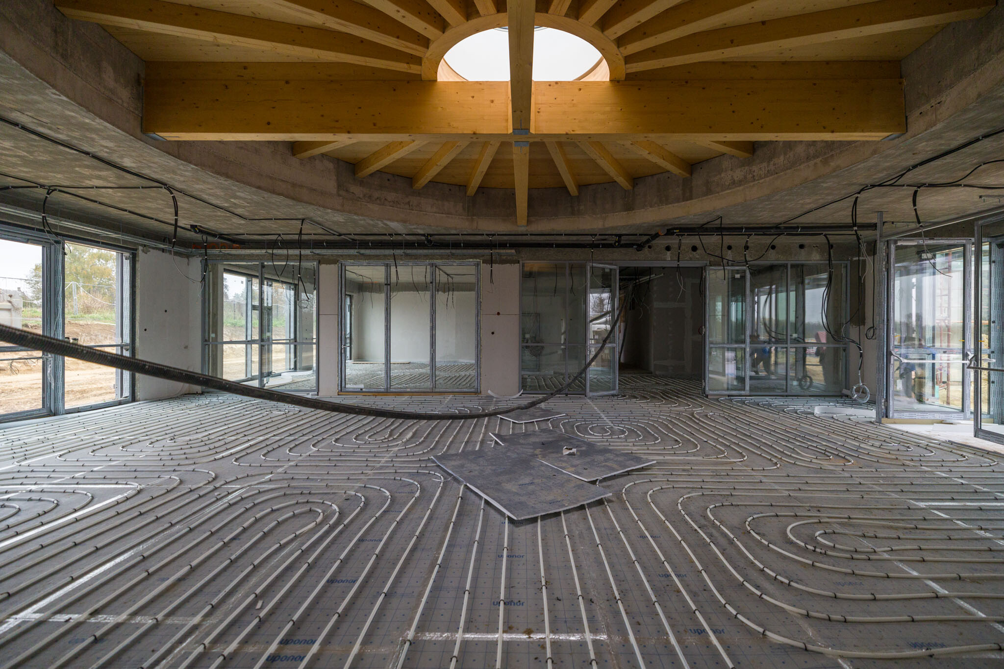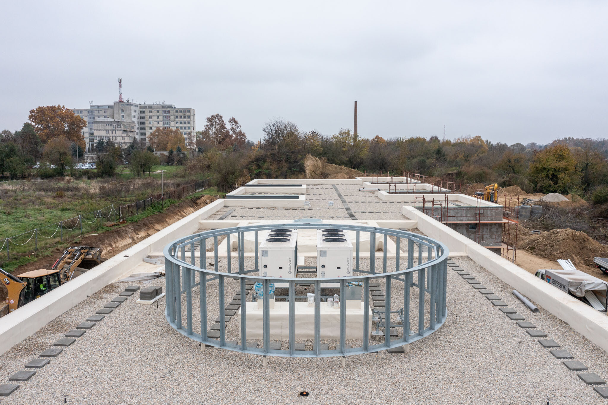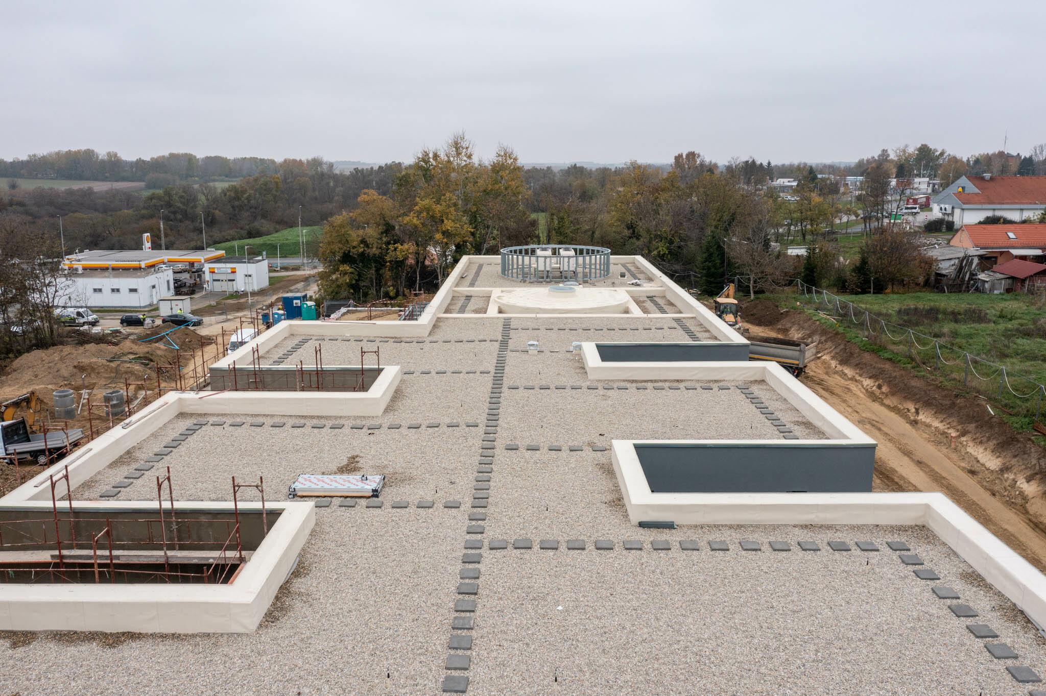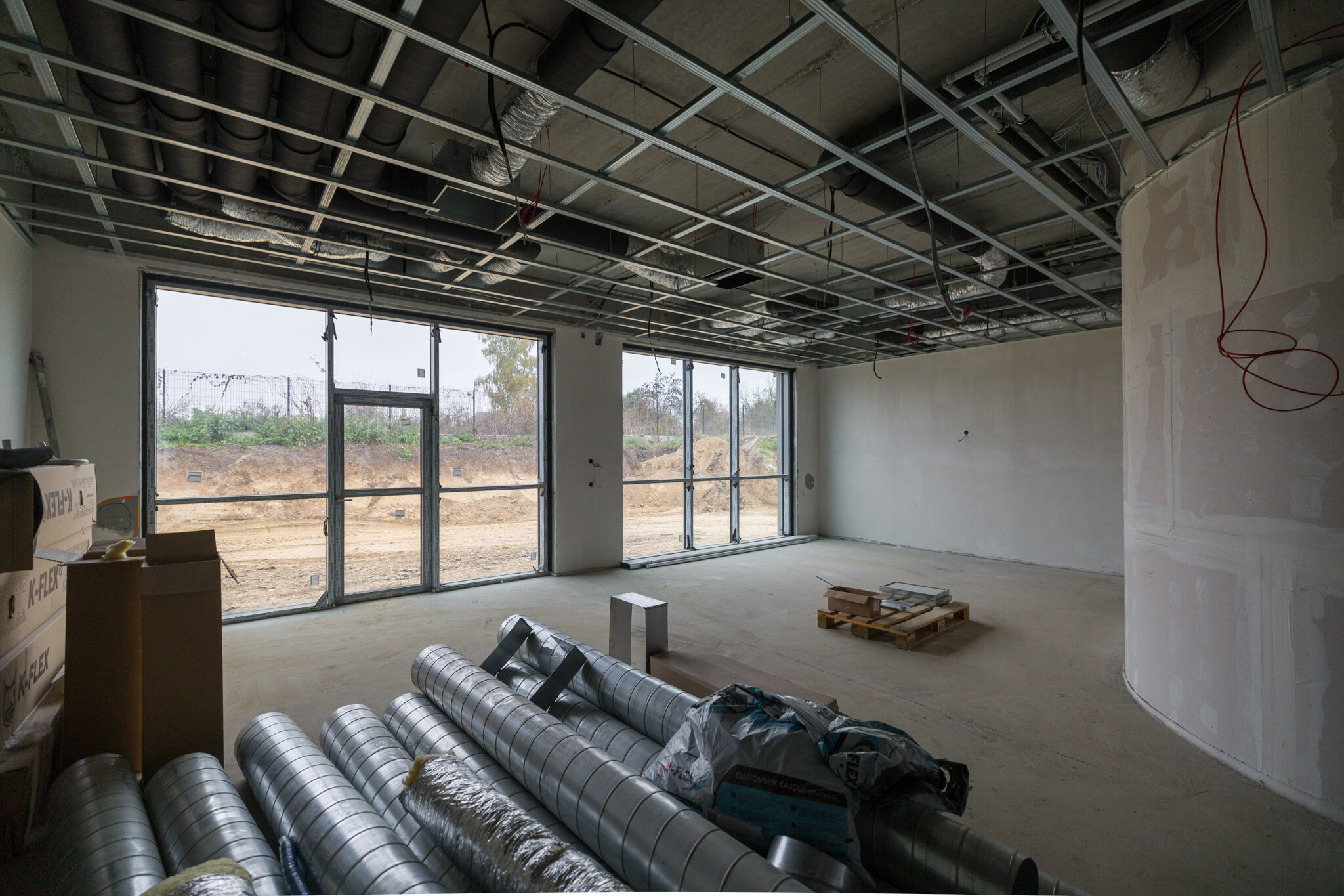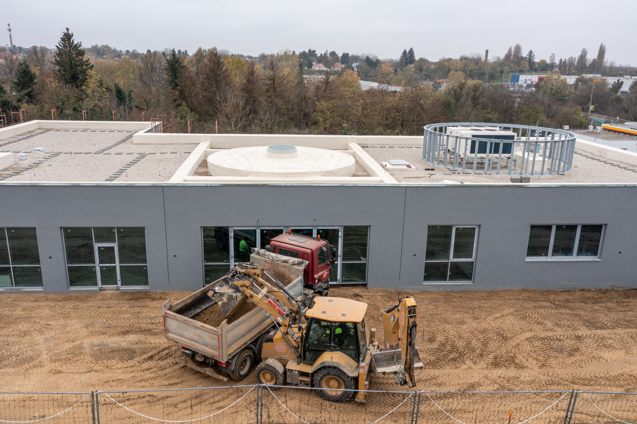 2023 novemberében egy fákkal, bokrokkal dúsan benőtt délről északi irányba lejtő munkaterületet vettek át a kivitelező cég szakemberei. Az építést megelőzően megtisztították a területet a bozóttól és elvégezték az épület geometriai kialakításának megfelelően a tereprendezési munkákat. Utóbbi – árulta el Ihász László – mintegy 7000 köbméter föld megmozgatását jelentette. A kitermelt föld egy részét az épület melletti tereprendezéshez használták fel, a többit egy lerakóhelyre szállították.