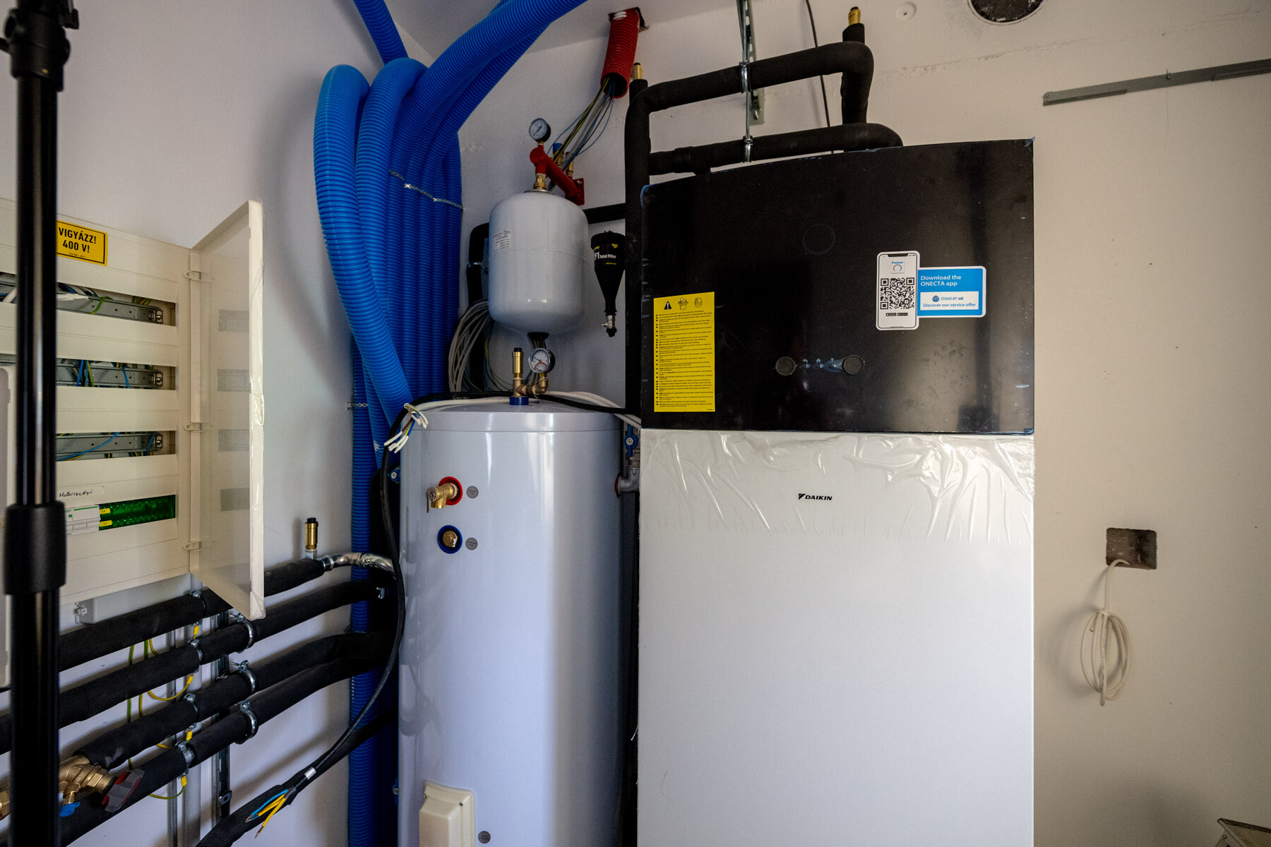 A Daikin Magyarország Daikin Altherma 3 R-es, 8kW-os hőszivattyúrendszert üzemelt be itt, amelynek hőleadása az előregyártott Leier Klímafalakkal és Klímafödémekkel történik, kiegészítve helyiségenkénti padlófűtéssel. Amellett, hogy a Baumit Magyarország termékeit választották a gépi vakoláshoz, a vállalat termékei már a szerkezetépítésnél is hasznosnak bizonyultak: a Leier kéregfalakat az építési helyszínen betonnal kell kitölteni. Ennek során előfordulhat, hogy a felület nem lesz hibátlan – ilyen esetekben a Baumit betonjavító rendszere jelent megoldást. Az NRG Services Kft. segítségével már napelemek is hozzájárulnak az épület fenntartható működéséhez. A Hofstadter Nyílászárók Kft. a prémium WoodStyle fa-alu homlokzati nyílászárókat RAL beépítési technológiával építette be a mintaházba, amelynek során az Illbruck szaílagjai gondoskodnak arról, hogy a szigetelőhabot kívül és belül megóvják a párától és nedvességtől. A Roto Designo tetőablakok segítenek a friss levegőt egyetlen mozdulattal bejuttatni a ház tereibe. Az Austrotherm Magyarország 8 cm vastagságú hőszigetelőrétegére került a hőtükrös fólia, a térháló, majd a Wavin Magyarország által szállított fűtéscsövek.
